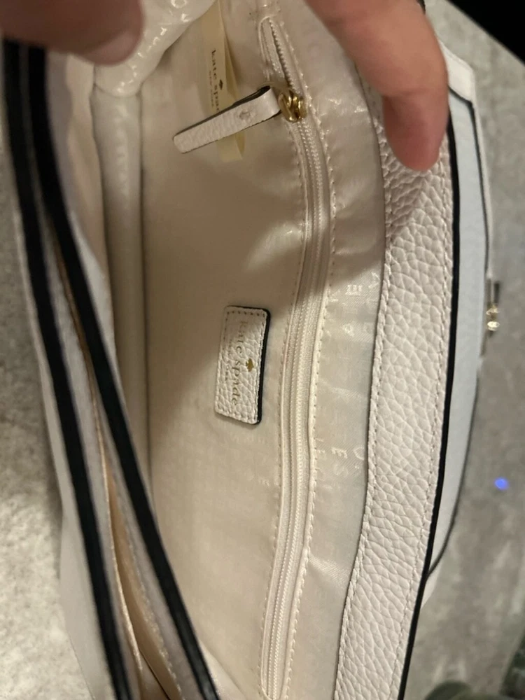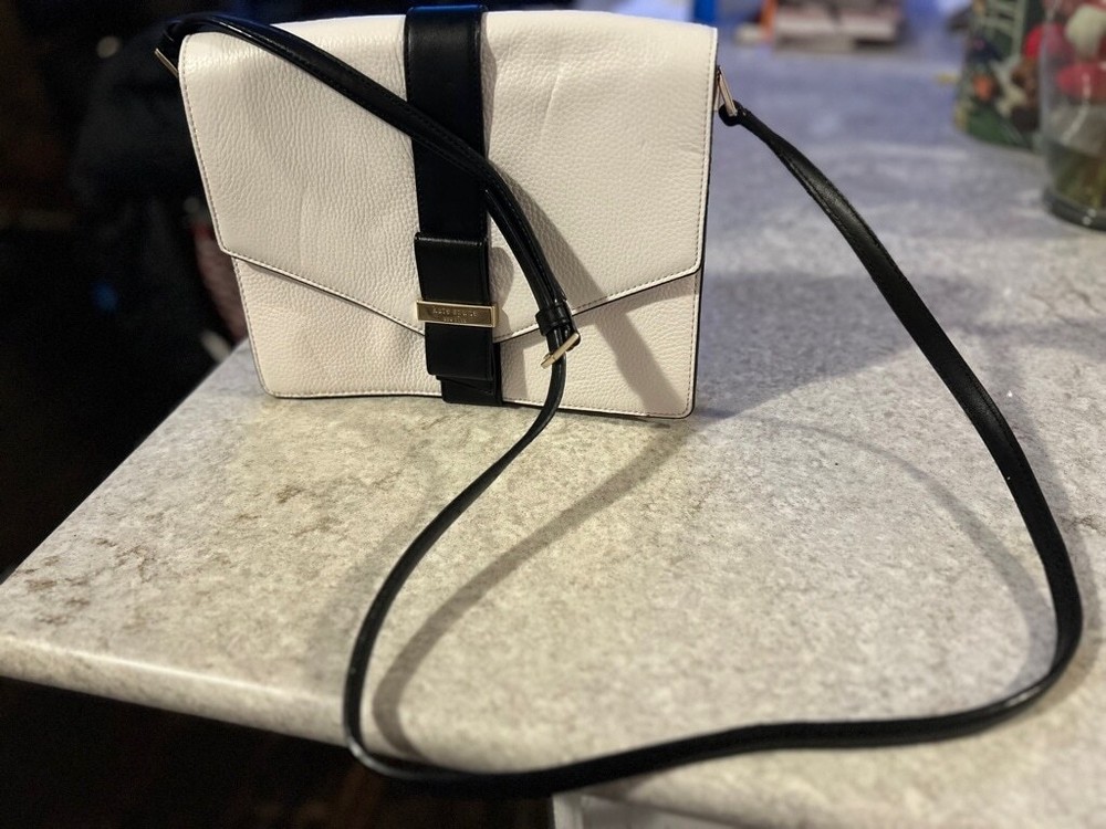 Kate Spade Josephine Parchment Drive Crossbody in cream and black Pebble leather. Style no. WKRU3800. Gold hardware. 2 Fabric lined gusseted interior has center divider and features 1 full length zip pocket and 2 slip pockets Magnetic closure. Kate Spade name plate and adjustable 20.5" shoulder strap. Approx. Dimensions: 10.5 in L x 7.5 in H x 3.25 in W Comes with certificate of authenticity