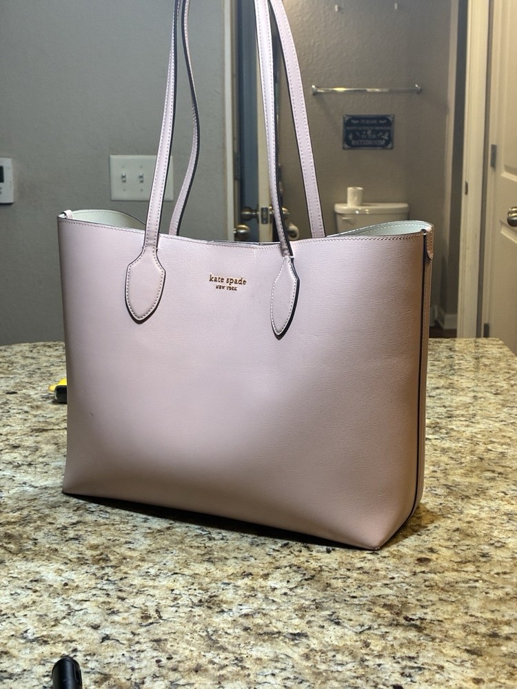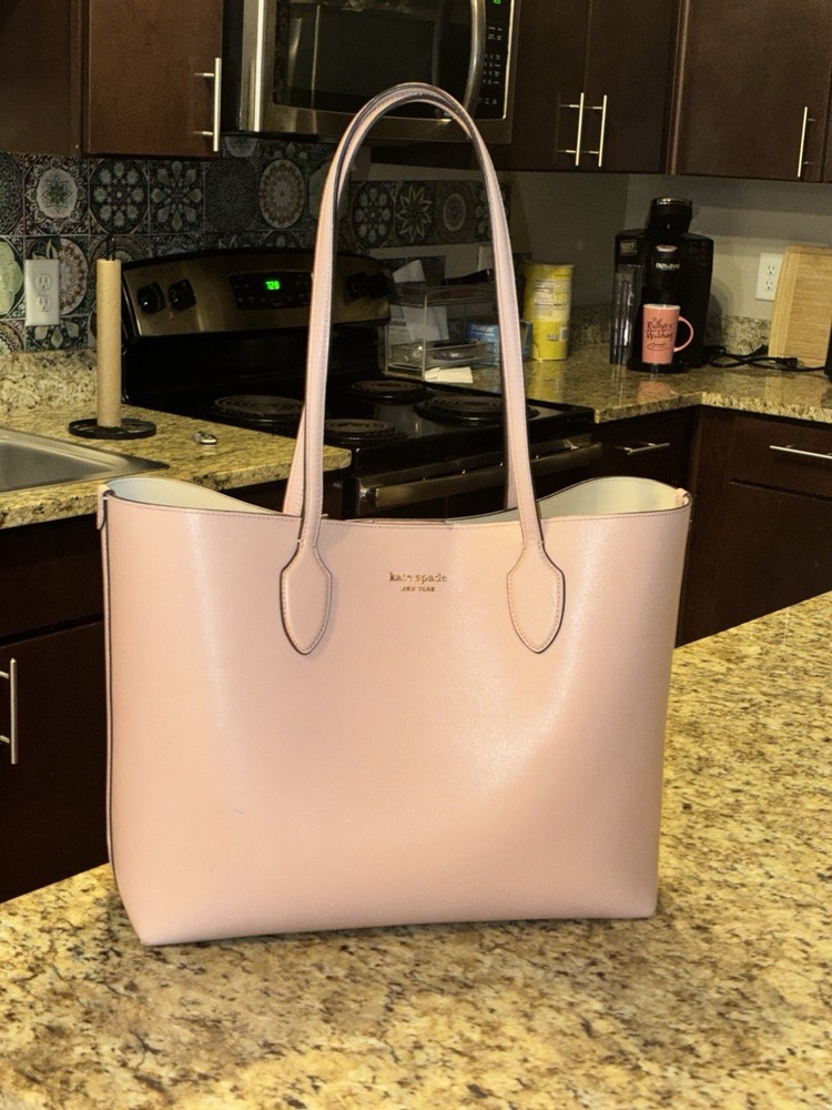 Style: Tote Accents: Zipper Handmade: No Bag Depth: 6 in Shape: Rectangle Theme: Designer Exterior Material: Leather Department: Women Handle/Strap Material: Leather Brand: kate spade new york Lining Color: Pink Size: Large Handle/Strap Color: Pink Bag Height: 11 in Features: Inner Pockets Vintage: No Pattern: Solid Handle Style: Double Handles Personalize: No Closure: Zip Hardware Color: Gold Exterior Color: Pink