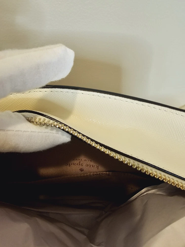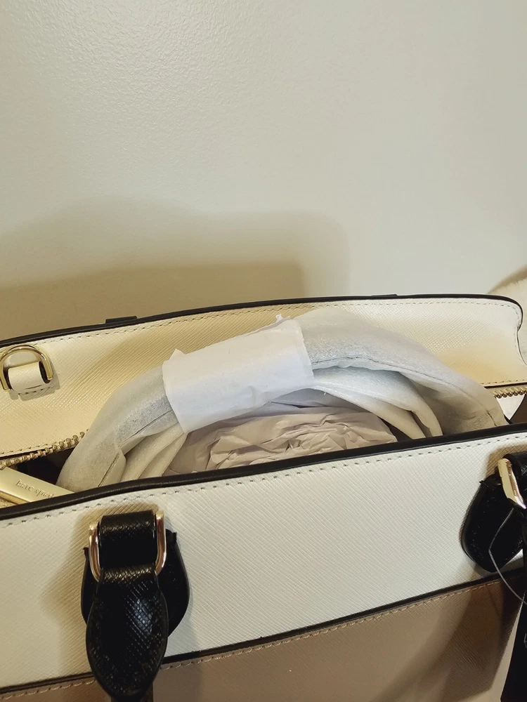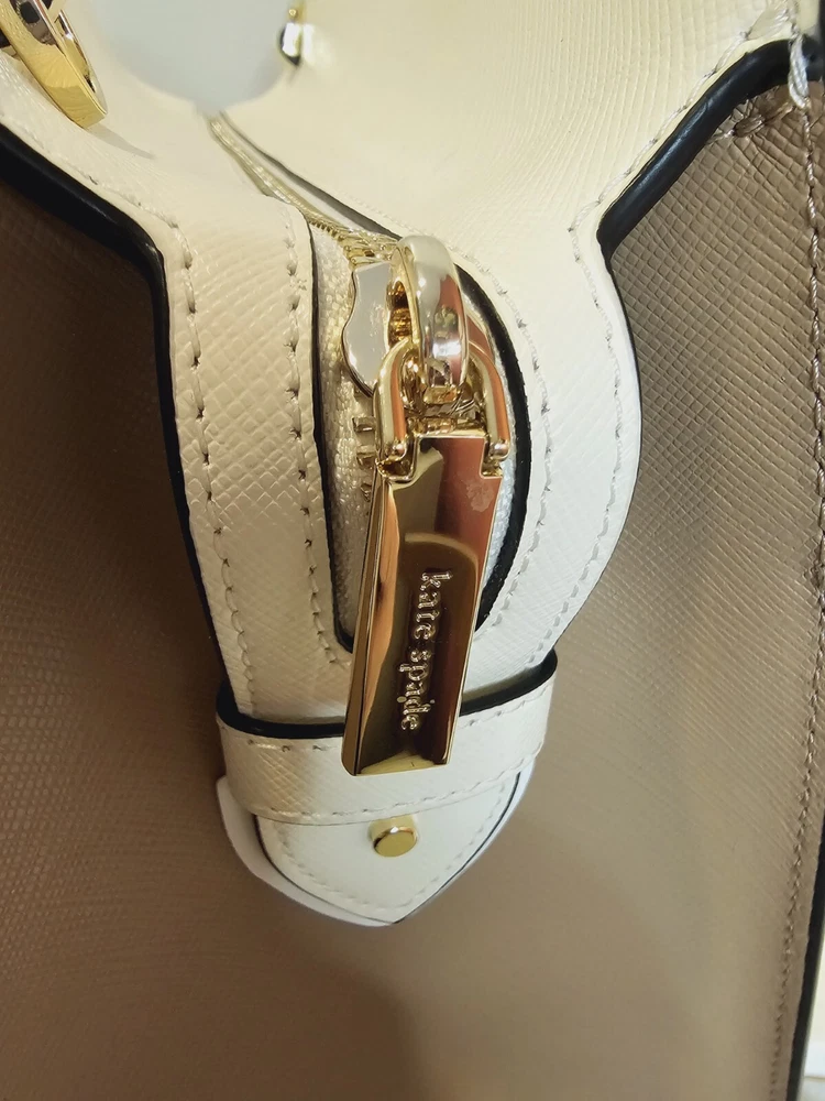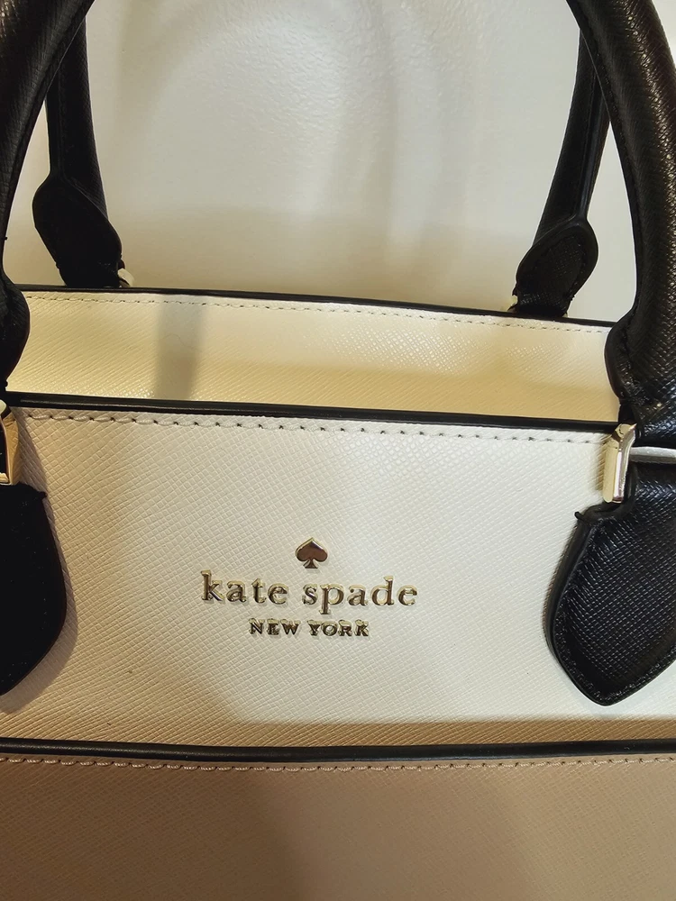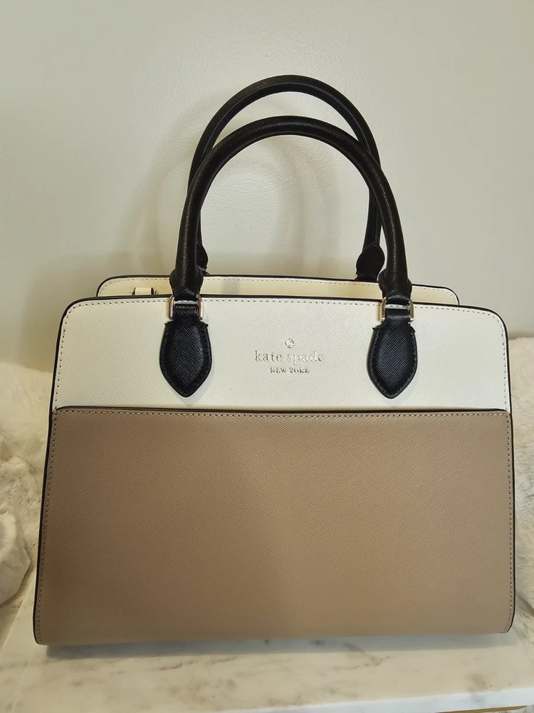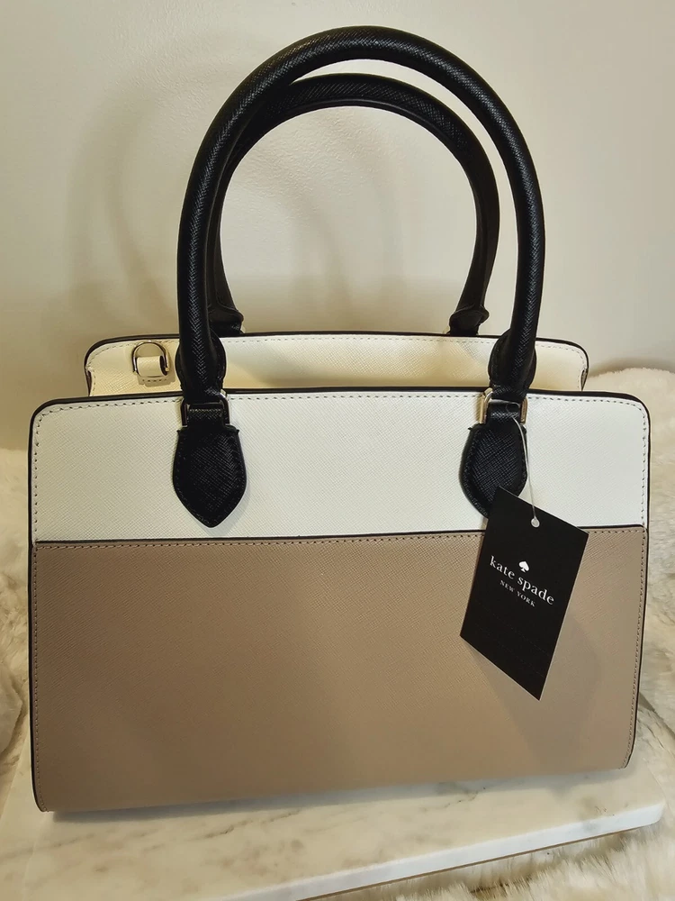New with tags, this Kate Spade Madison satchel is a stylish and versatile bag suitable for various occasions. It features a colorblock pattern in tan, creme, and black, with a rectangular shape and a zip closure. The bag has a top handle and a detachable strap, both made of leather, and gold-plated hardware accents. The interior lining is made of brown fabric, and the bag includes inner pockets for storage. The satchel is medium-sized and unisex, making it a perfect choice for travel, casual outings, workwear, or business meetings. This designer bag is part of the Kate Spade Madison Saffiano Leather Medium Satchel Bag Crossbody product line, and it is a must-have for anyone who wants a fashionable and functional accessory.