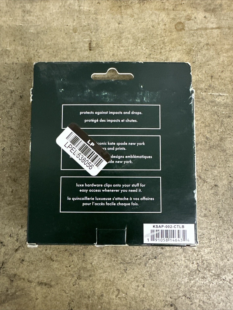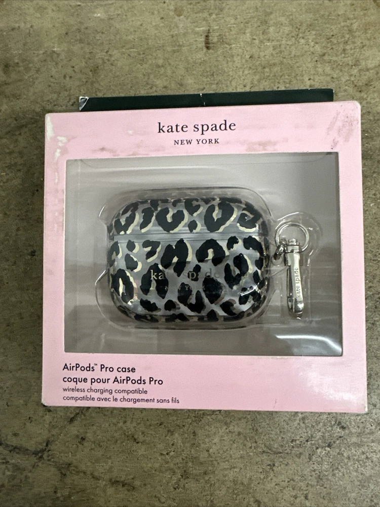 This Kate Spade New York smart case is the perfect accessory for your Apple AirPods Pro. Featuring a stylish city leopard print in black, gold, and clear, this case is made of durable TPU material and comes with a convenient clip for easy attachment. The case is designed specifically for the Apple AirPods Pro and is compatible with that brand. In addition to its chic design, this case also offers functional features such as a secure closure and protective padding to keep your AirPods safe from scratches and damage. With its slim profile and lightweight design, this Kate Spade New York case is the ideal choice for anyone who wants to add a touch of sophistication to their AirPods while keeping them safe and secure. New in box but box does have some marks on them