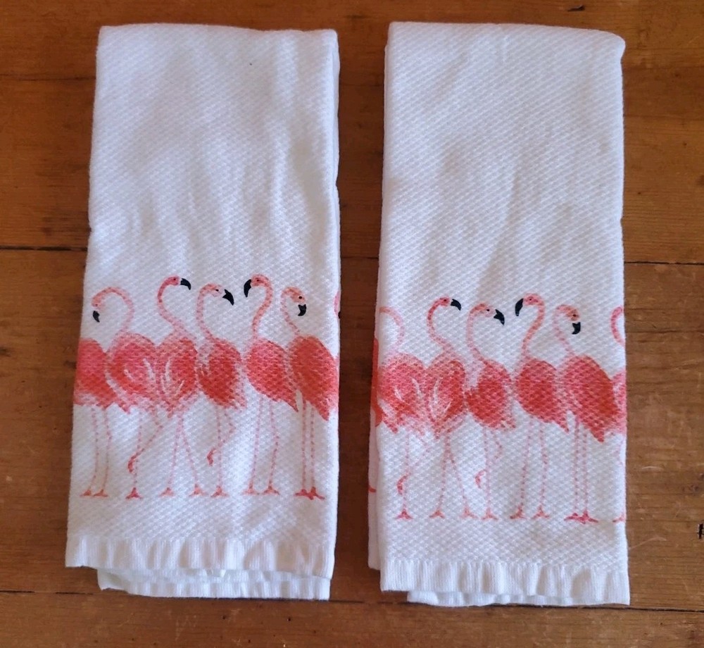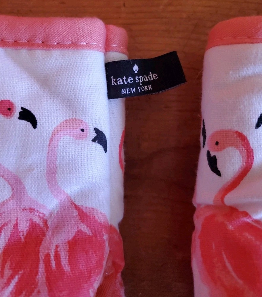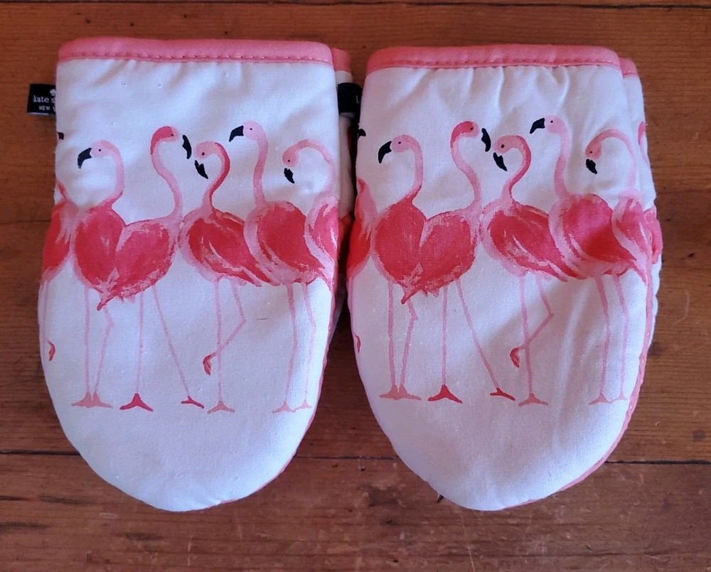 Kate Spade Of New York Pink Flamingos Kitchen Towels Mini Oven Mitts Set Of 4 In new unused condition Set includes: Kate Spade 1 pair of oven mitts and 2 tea towels Lot