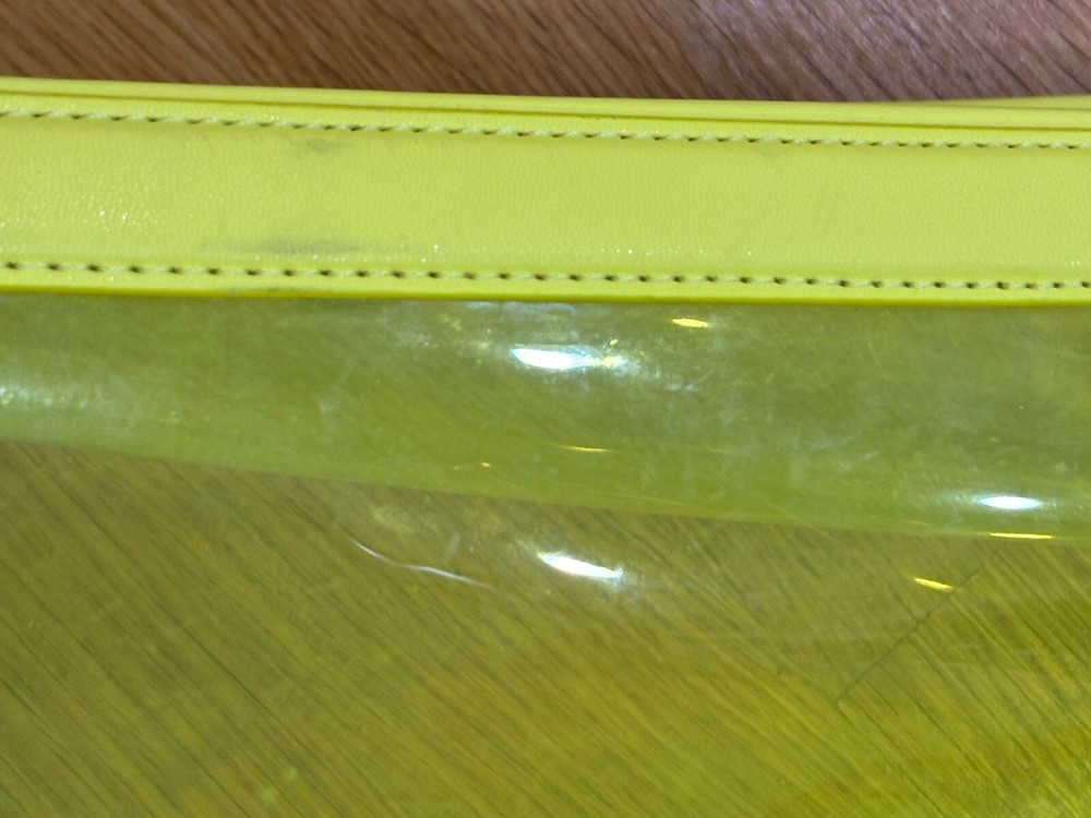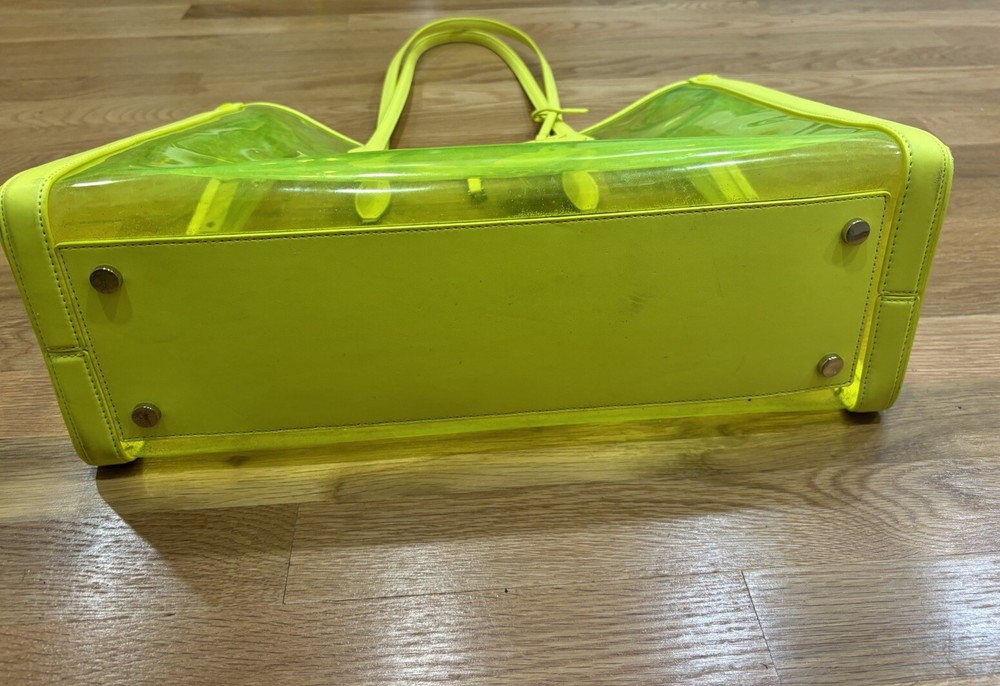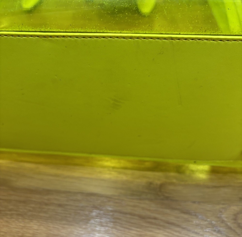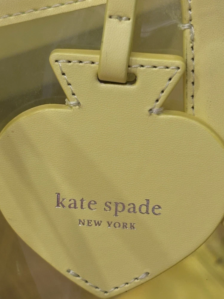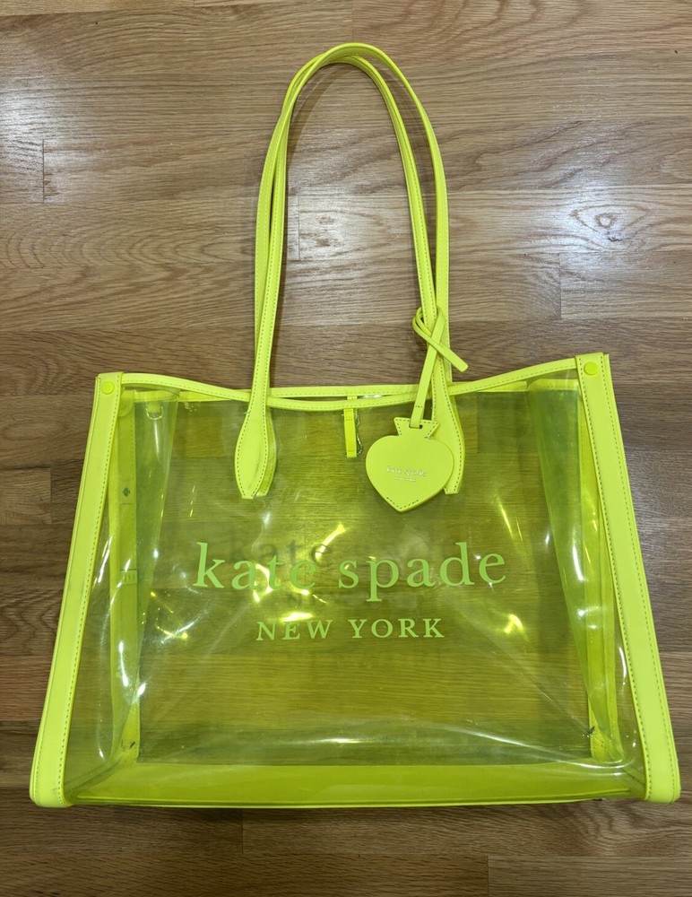 Kate Spade Clear Transparent Colorful Yellow Bag. Twin handles/straps. Branding on front and on hangtag. Wipe clean surface. Bag has a hook fastener. Bottom studs. The bag measures approximately 17” by 12” by 6”. The strap drop is approximately 12”. Preowned. Very good condition.