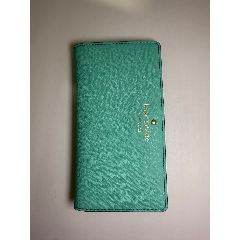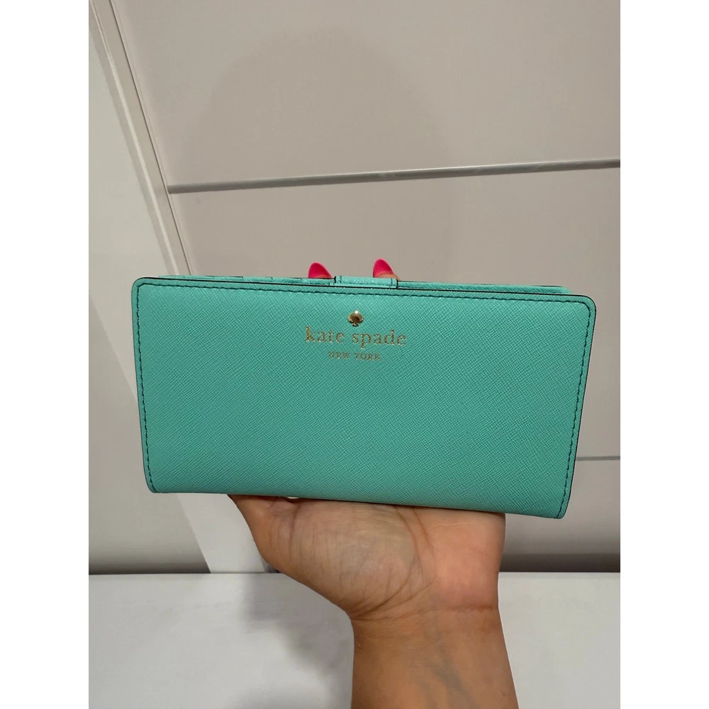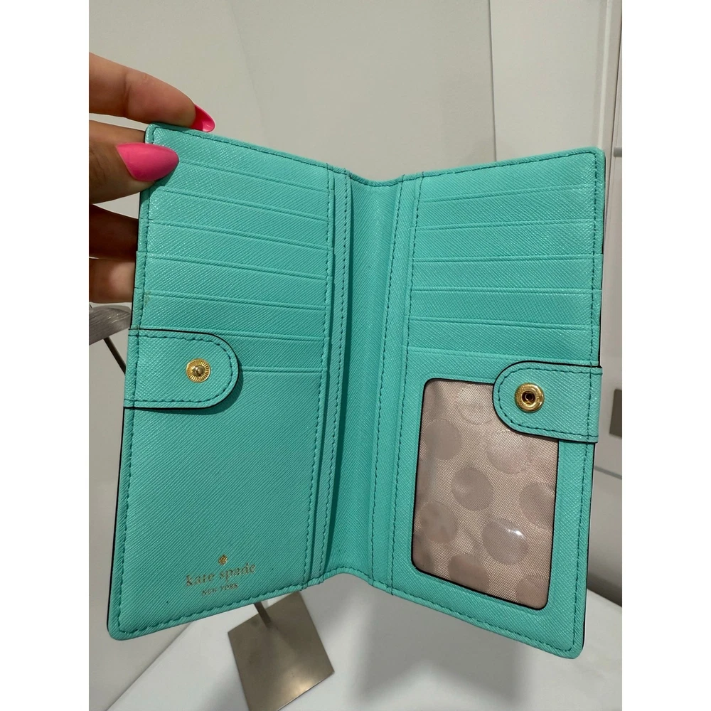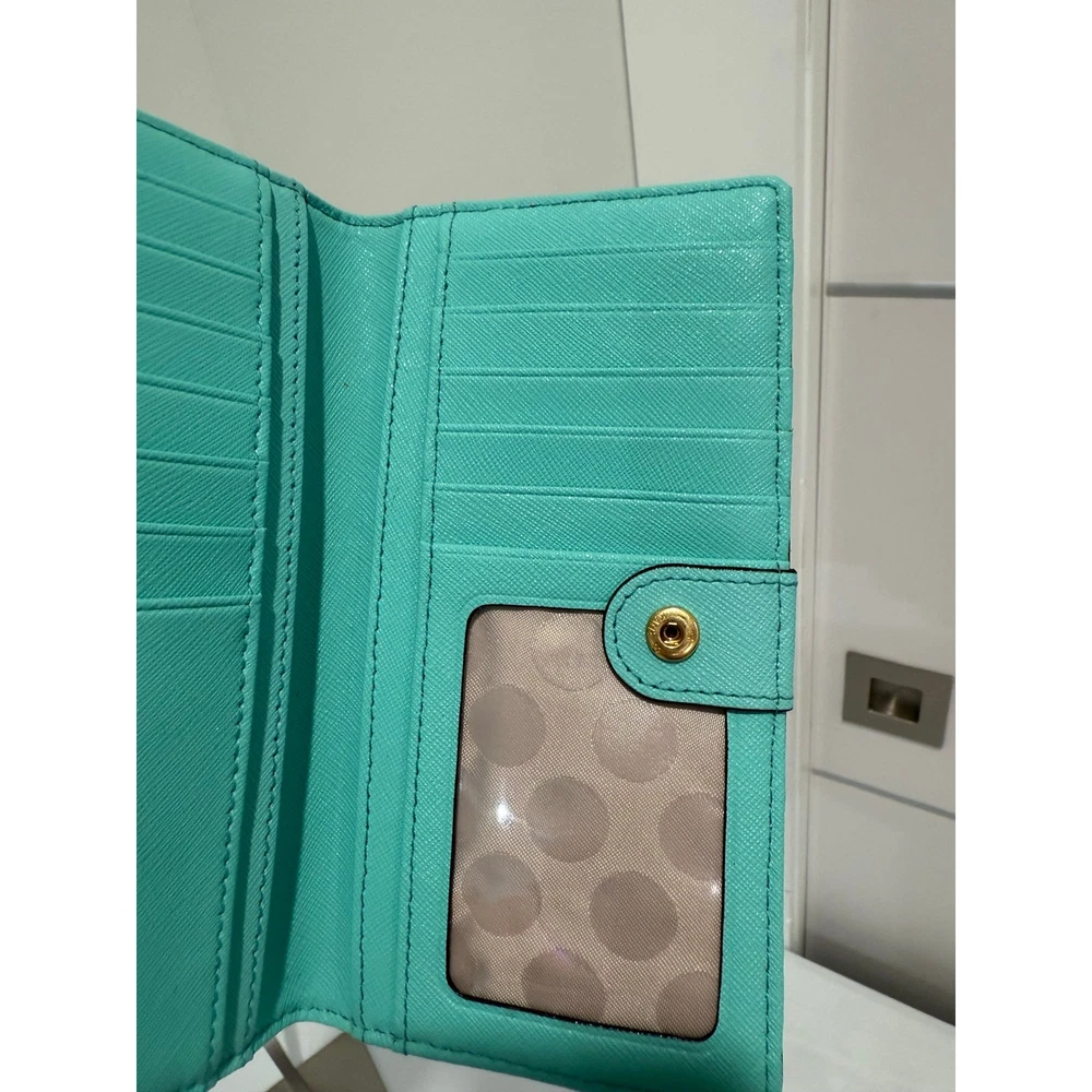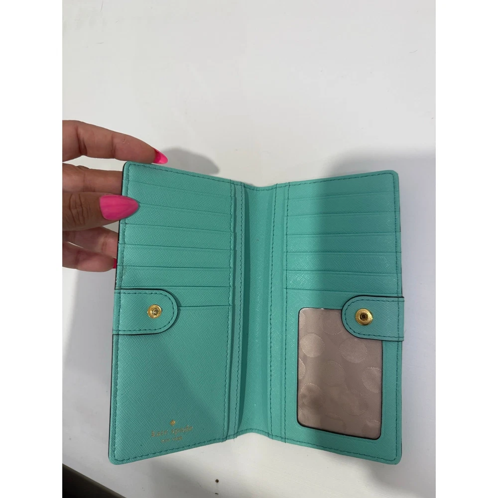 The Kate Spade Turquoise Leather Zip-Around Wallet is a stylish and functional accessory crafted from high-quality turquoise leather. It features a zip-around closure that secures your essentials, including multiple card slots and compartments for organized storage. The wallet’s dimensions are approximately 7.5 inches in width and 4.5 inches in height, making it spacious enough to hold your cards, cash.