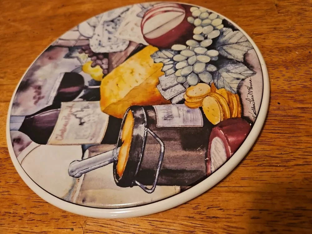 This beautiful Kathleen Parr McKenna porcelain cheese board is perfect for any wine and cheese lover. With a gorgeous multicolor design, this 9" round board is sure to impress your guests. Made by Santa Barbara Ceramic Designs, this cheese board features a unique wine and cheese pattern that is sure to make your dining experience special. Crafted using a mold making method, this porcelain cheese board is both durable and dishwasher safe. Measuring 9 inches in height, this board is perfect for serving a variety of cheeses and meats. Whether you're hosting a party or enjoying a snack, this cheese board is a must-have for any kitchen.
