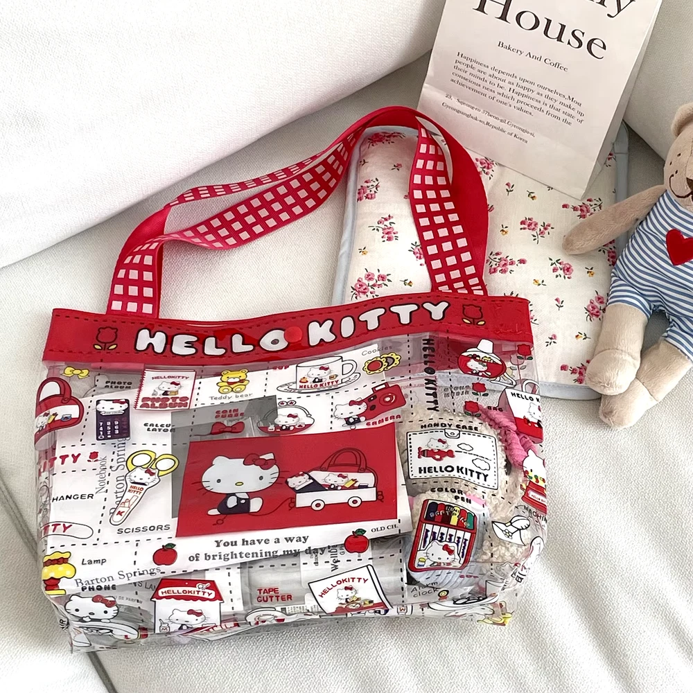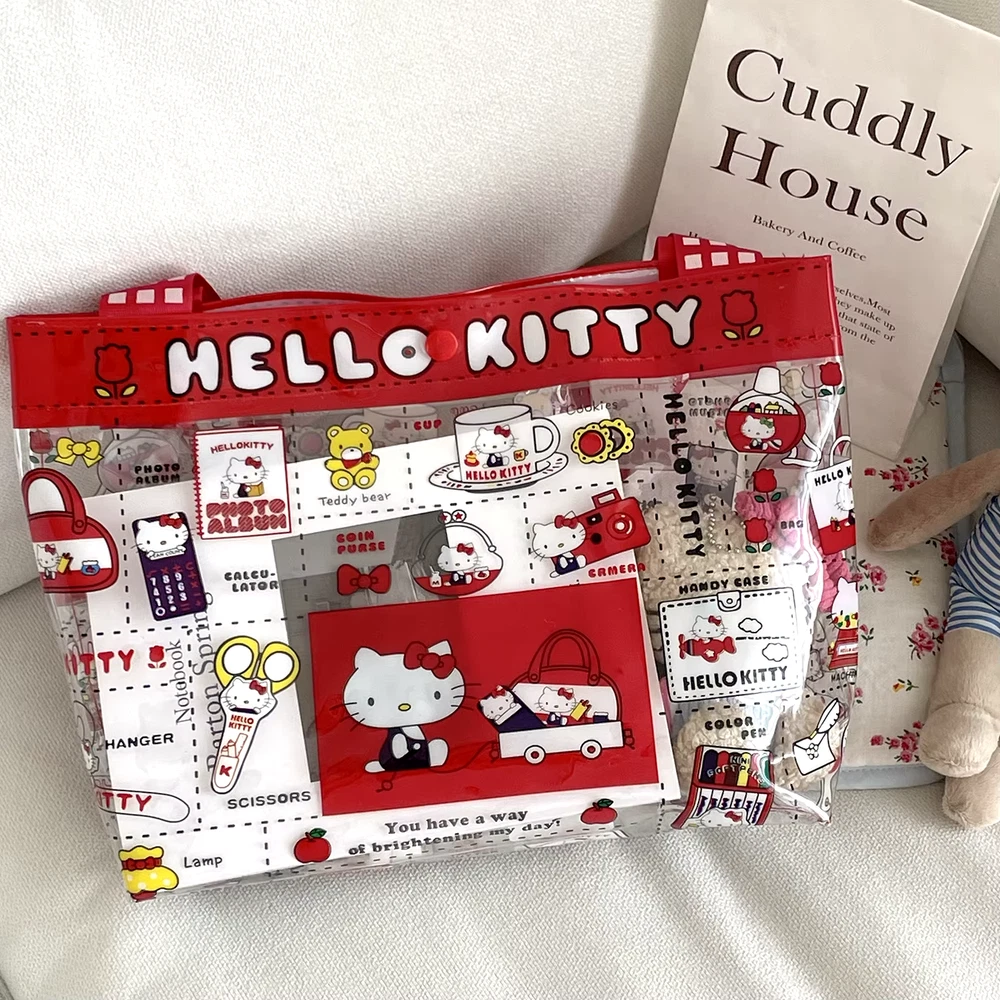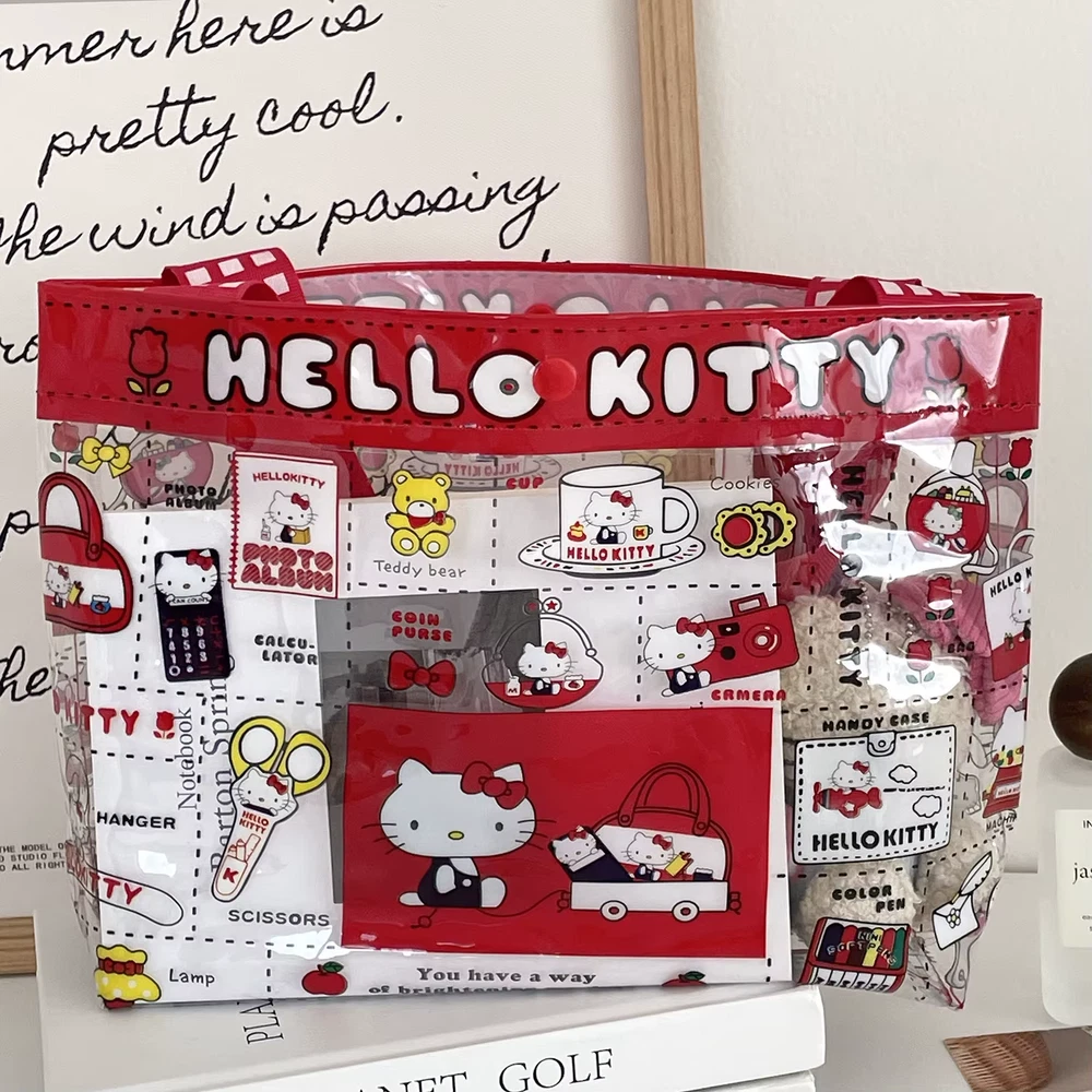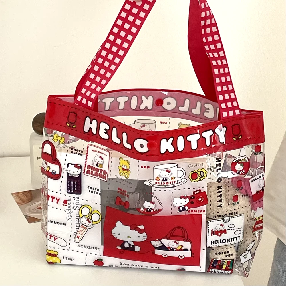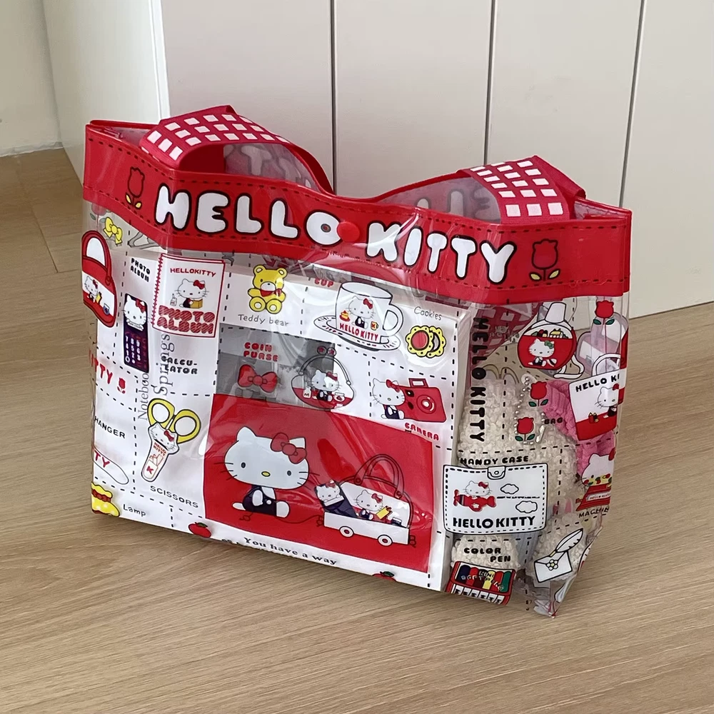 Cute PVC handbag with a Hello Kitty design in vibrant red. Features a spacious transparent compartment, ideal for makeup, storage, or travel essentials. Portable and stylish for everyday use. delivered within 2 weeks