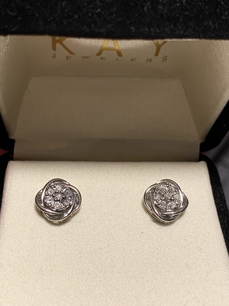 Absolutely love these vintage Kay earrings! The sterling silver has a beautiful shine, and the diamond clusters add just the right amount of sparkle. They're lightweight yet feel sturdy, perfect for everyday wear or special occasions. The classic design is timeless, and they pair well with any outfit. Definitely a great addition to my jewelry collection!