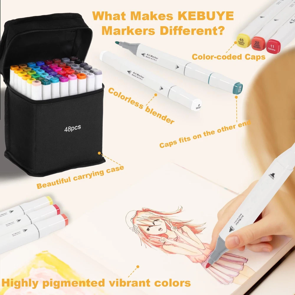 【SUPERIOR QUALITY MARKERS】Kebuye super quality permanent ink provides a rich colour saturation and allows the colors to be laid down clean, smooth and evenly. Perfect colour match every time you use them because the tips share a single ink reservoir. Alcohol markers are non-toxic, acid free 【48 BRIGHT COLORS】48 colors unique drawing markers bring your art to life. Includes all the colours artists need for drawing, writing,sketching,illustrating,shading,designing,rendering,manga,anime,adult coloring books and more.Alcohol markers are stored in a convenient storage box 【DUAL TIP IN ONE】Dual Tip Markers that allow you to create fine details with the fine tip(0.5mm-2mm) or broad, sweeping strokes (2mm-7mm) with the chisel tip and immerse yourself in art. Blend shades beautifully with alcohol markers sets that also reduce coloring lines, helping even beginners create professional effects with these art markers 【COLOR-CPDED CAPS】Artist markers color-coded caps allow for ease in organization and to identify colors quickly. you’ll never waste time searching for the perfect color.Ergonomic design makes working with these markers easy for a long time. Equipped with a beautiful black carrying case perfect for storing 【PERFECT GIFT】The alcohol-based ink used in these markers is safe for all-ages users, beginners, and professionals. These art markers make for a perfect gift idea for Christmas, Thanksgiving and school students. They come equipped with a beautiful form-fitting black case that is perfect for traveling and storing your paint markers