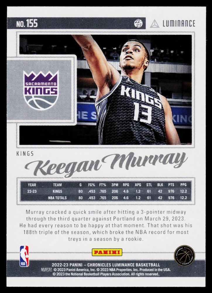 You will receive a Near Mint or Better, Keegan Murray, 2022-23 Panini Chronicles, Rookie, 155 Sacramento Kings card PLEASE NOTE: SOME CARDS THAT GO THROUGH OUR SCANNER MAY APPEAR TO HAVE LINES THROUGH THEM. THEY ARE NOT ACTUAL SCRATCHES, SIMPLY FALSE IMAGE LINES. WE WILL NOT INTENTIALLY SELL, DAMAGED CARDS. NEW CARDS LISTED DAILY ORDERS SHIP NEXT DA Y (Weekends as mail service is available) VISIT OUR STORE FOR MORE DEALS! USE THE SEARCH ICON IN THE STORE TO FIND YOUR FAVORITE TEAMS & PLAYERS! Be sure to save us as sellers to be the first to be notified when new and exciting cards are posted! Please note, we are not professional graders, and the condition of the card you purchased is highly subjective. Please refer to the high quality scans of the card you are viewing, and determine the condition of the card for yourself. Feel free to reach out with questions! All cards are in EX-NM+ condition, unless stated otherwise Chrome cards from various brands might have minor light surface scratches, which is typical with these type of cards. Any major, deep scratches or major surface issues will be noted, if present. We take pride in the condition of all of our cards, including commons. Our promise to you, is that we will not sell a card we would not buy ourselves. Of course things slip by, however customer service is our #1 Priority, and we are always here for a message for ANY, and ALL issues. Thank you very much for stopping by, feel free to reach out! - Titan (Son) & Andy (Dad)