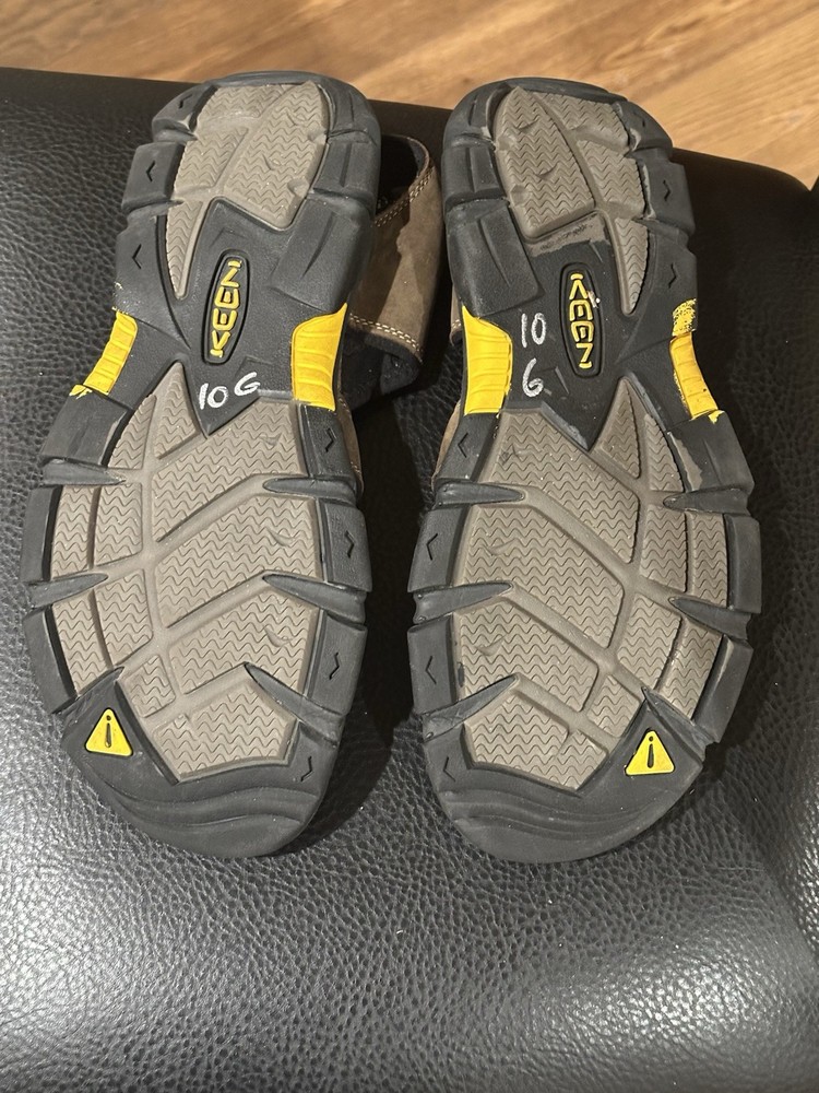 These Keen sandals are a summer must-have! The brown leather looks stylish yet rugged, and the breathable fabric lining keeps my feet cool all day. The adjustable drawstring lets me customize the fit, and the sturdy sole gives great support for walking. They’re perfect for hikes, beach trips, or just casual outings—super versatile and built to last. Love the open toe for breathability, and they still feel supportive. The gently worn look adds character, and they’re just as comfy as new. Highly recommend for anyone wanting durable, good-looking sandals!