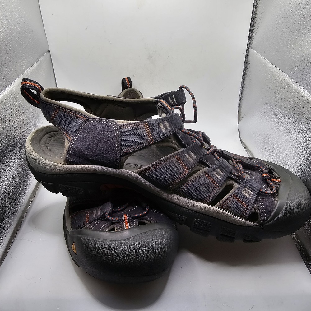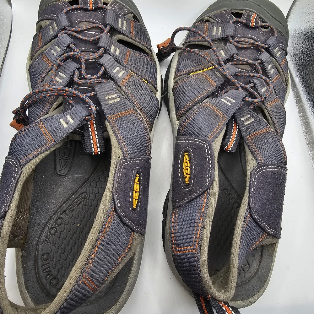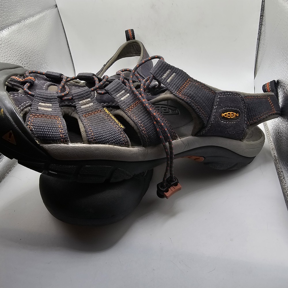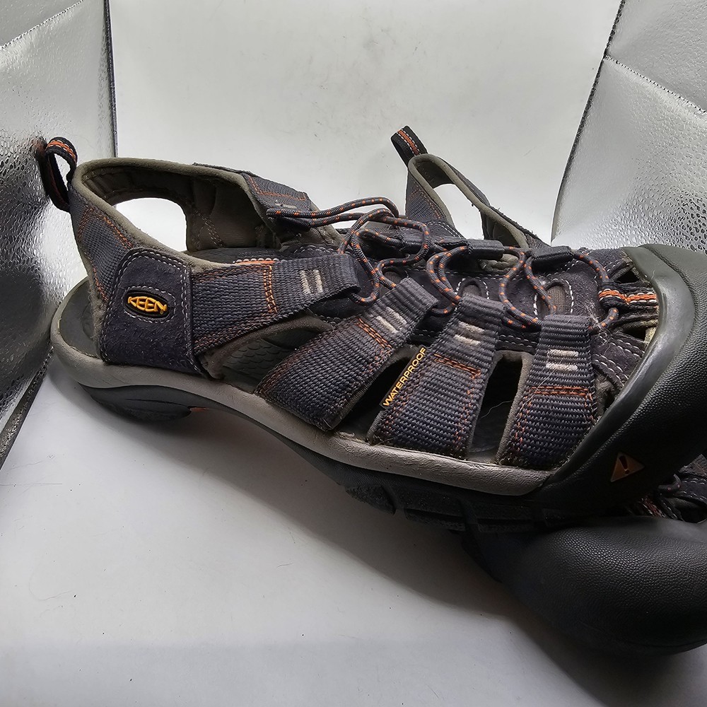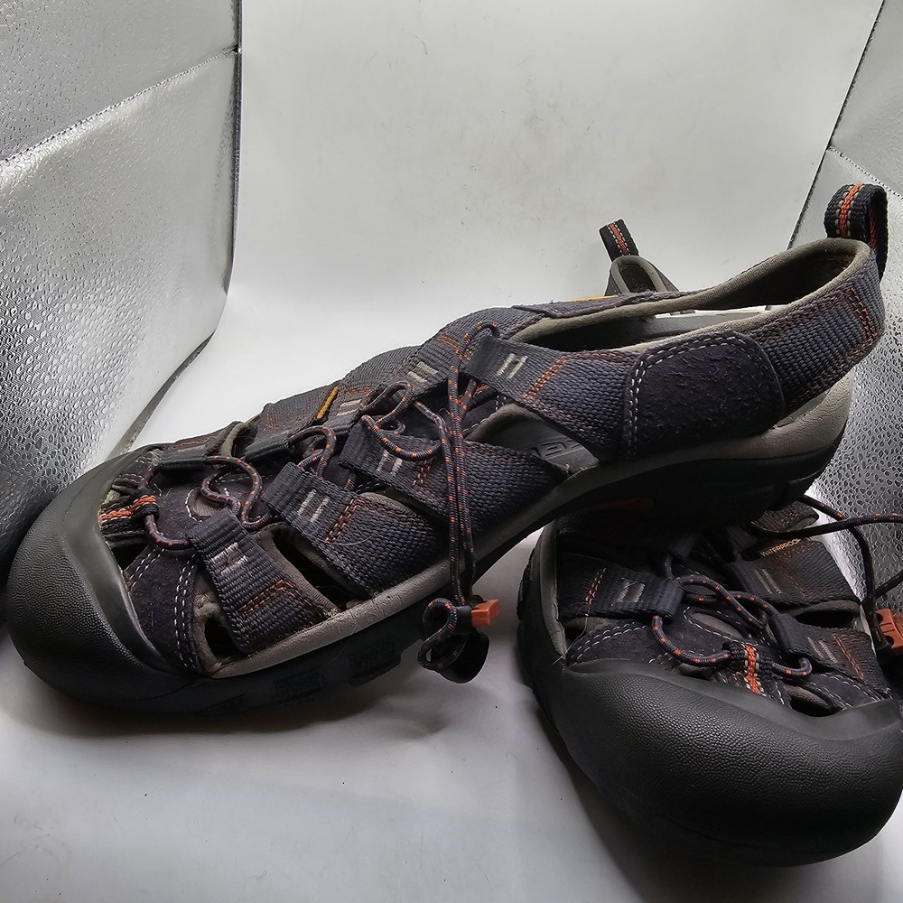 The Keen Men's size 10.5?? hiking sandals in gray and orange feature a closed toe design, lace-up closure, and a slip-on style for easy wear. Made with waterproof synthetic materials, these sandals are lined and cushioned for all-day comfort. Perfect for outdoor activities in all seasons, these sandals also boast a rubber outsole for traction and durability. The limited edition design with the KEEN logo adds a touch of style to your casual or activewear ensemble. Ideal for travel, beach outings, or everyday wear, these sandals are a versatile and practical choice for any man on the go. See measurements. There is no tag for size. Sold as is