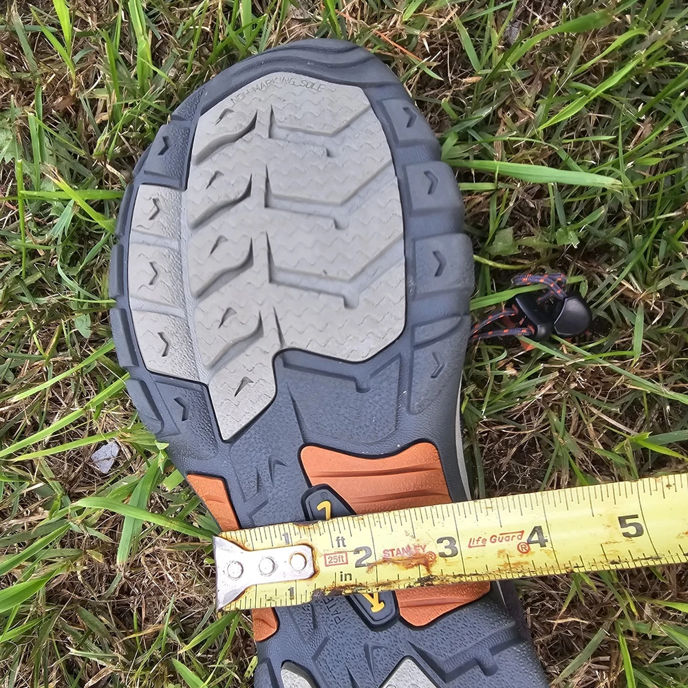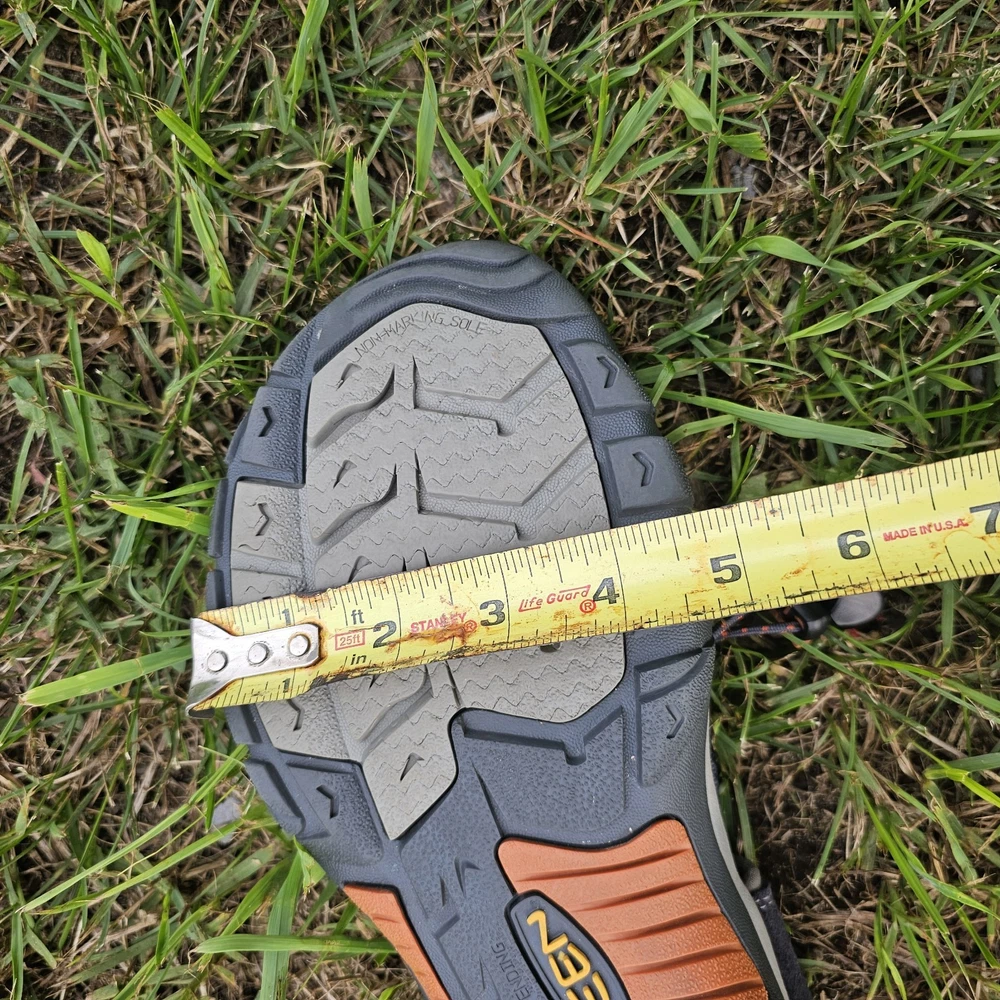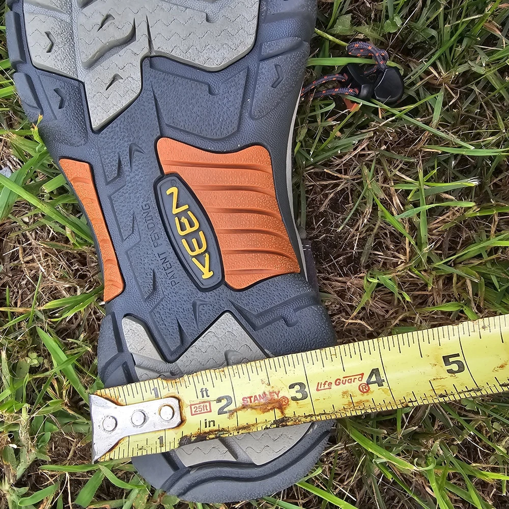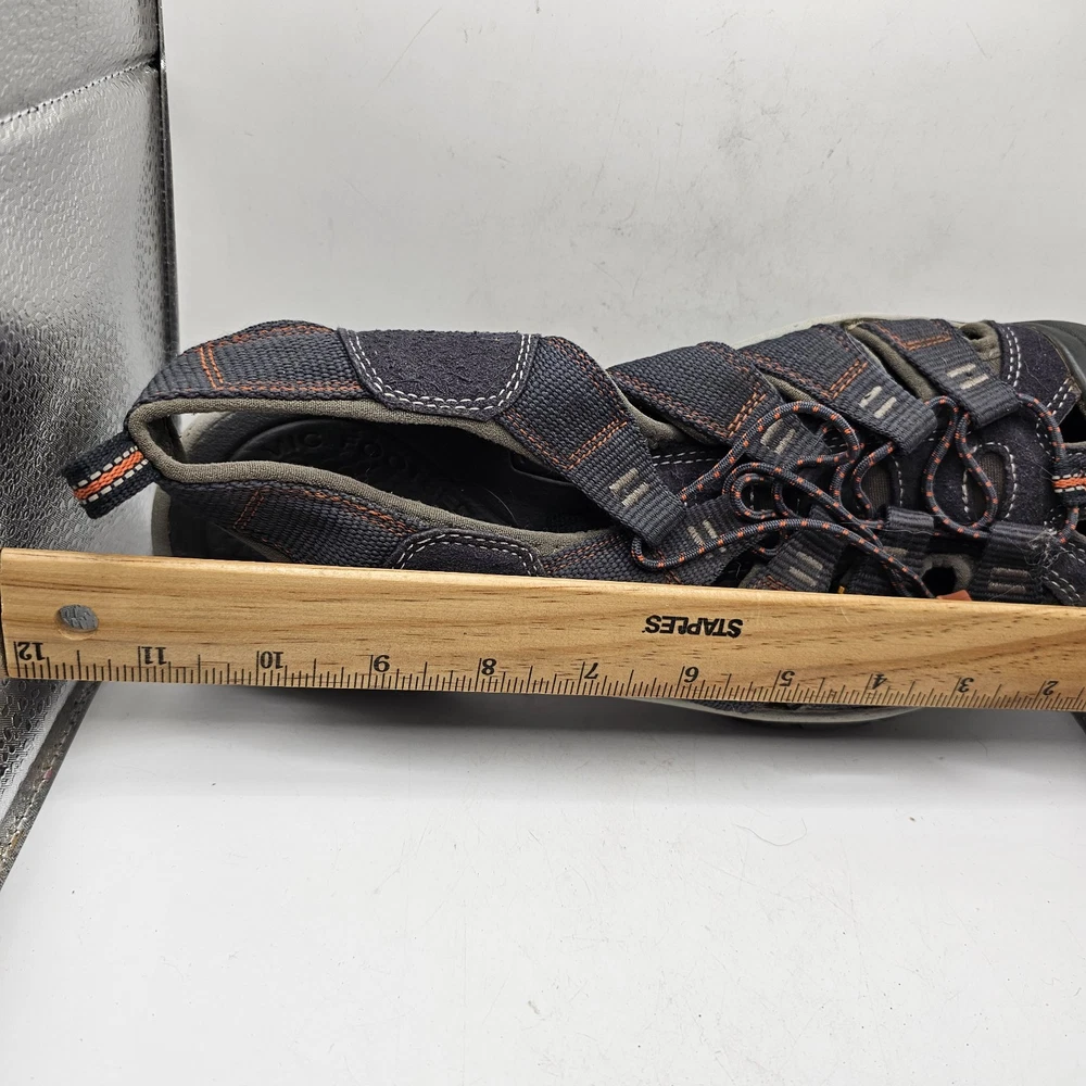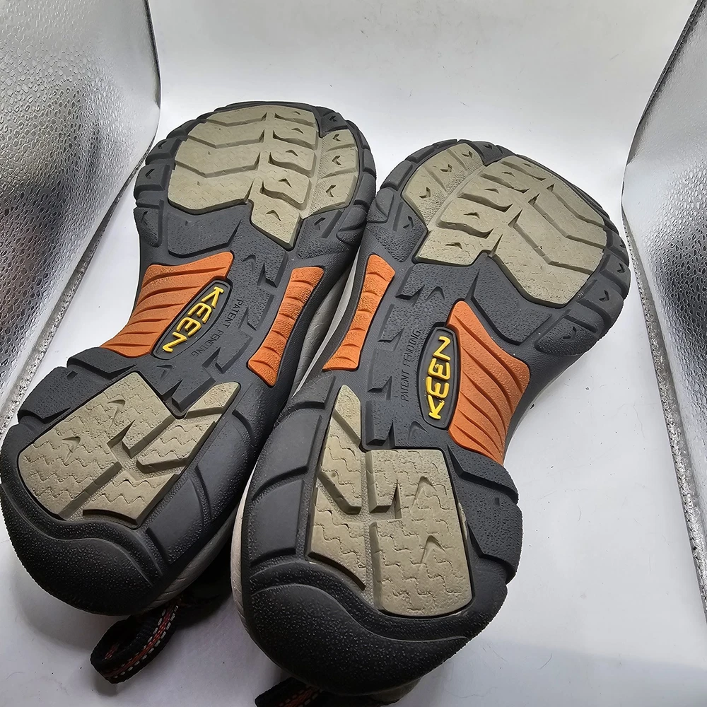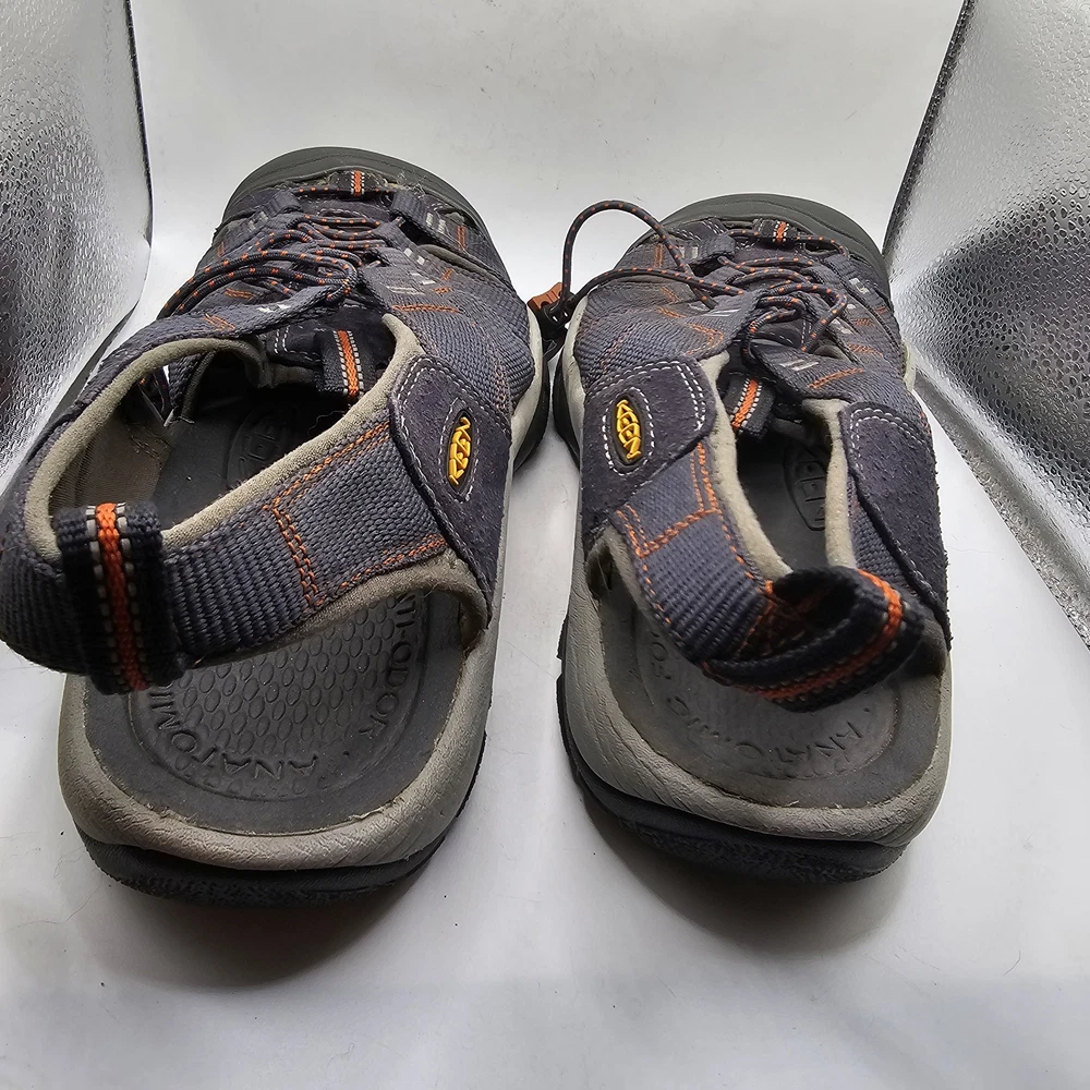 The Keen Men's size 10.5?? hiking sandals in gray and orange feature a closed toe design, lace-up closure, and a slip-on style for easy wear. Made with waterproof synthetic materials, these sandals are lined and cushioned for all-day comfort. Perfect for outdoor activities in all seasons, these sandals also boast a rubber outsole for traction and durability. The limited edition design with the KEEN logo adds a touch of style to your casual or activewear ensemble. Ideal for travel, beach outings, or everyday wear, these sandals are a versatile and practical choice for any man on the go. See measurements. There is no tag for size. Sold as is