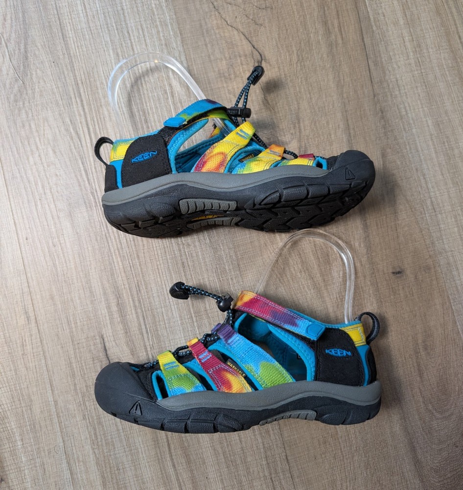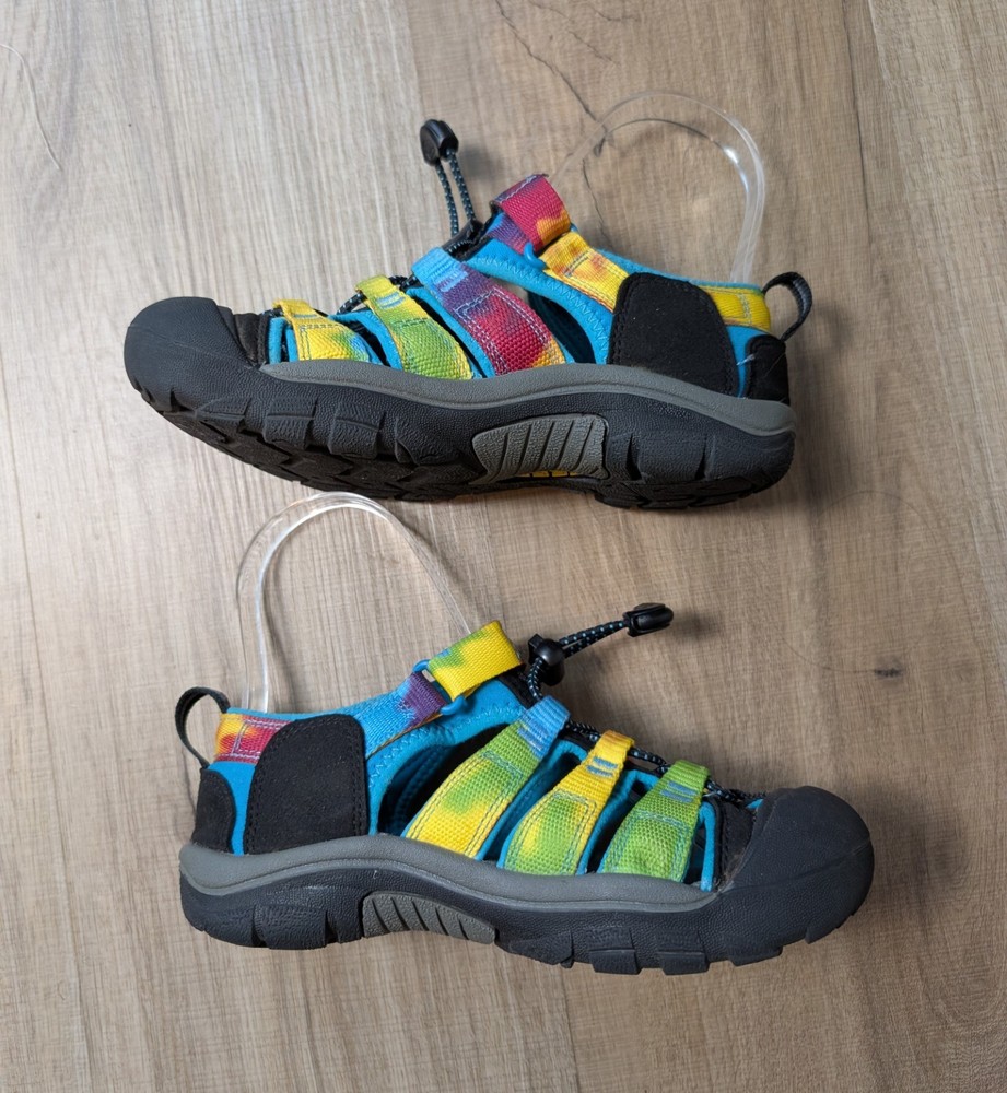 Used in great condition. Please see pictures for details. The Keen Newport H2 Big Kids Tie Dye Sandals are colorful water shoes designed for beach and water sports activities. With a durable rubber outsole and polyester upper material, these sandals feature a convenient hook & loop closure for easy on and off. The vibrant rainbow tie dye pattern adds a fun and stylish touch to these water shoes, making them perfect for both boys and girls. Made by the trusted brand KEEN, these sandals are a reliable and fashionable choice for any outdoor adventure.