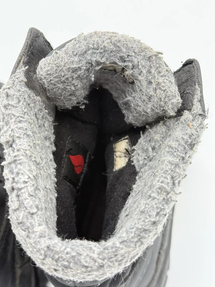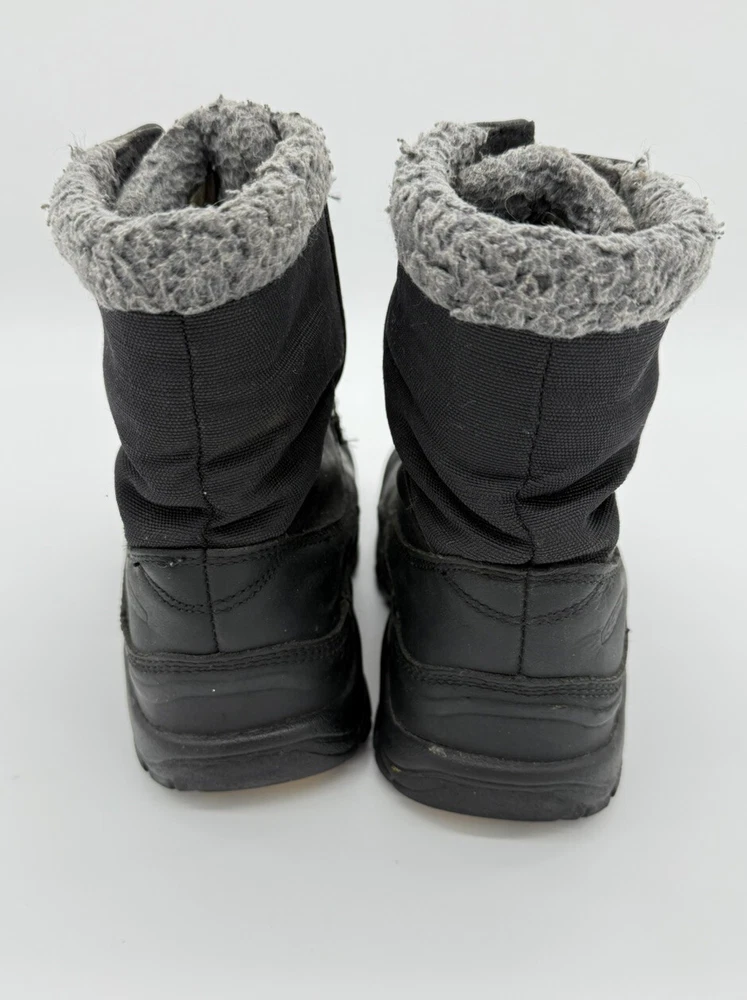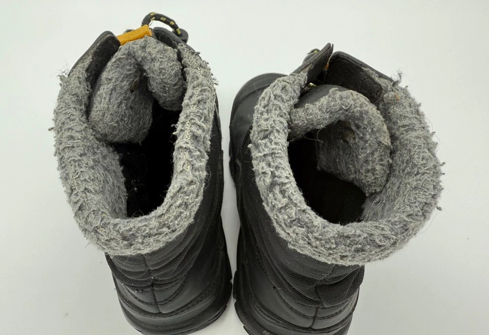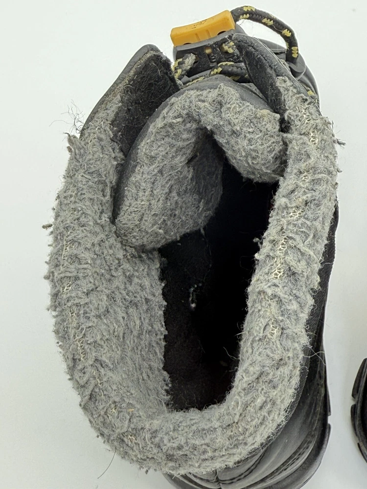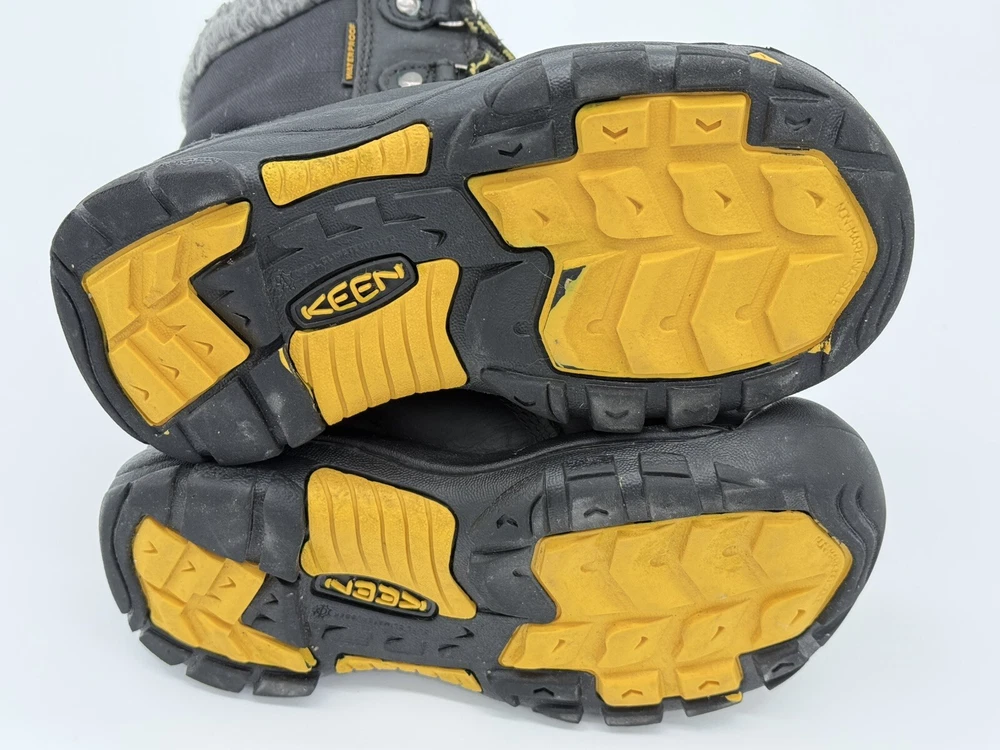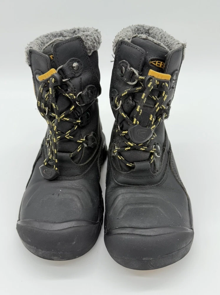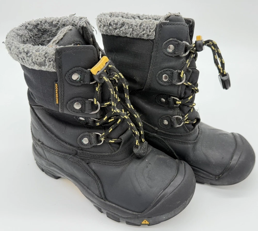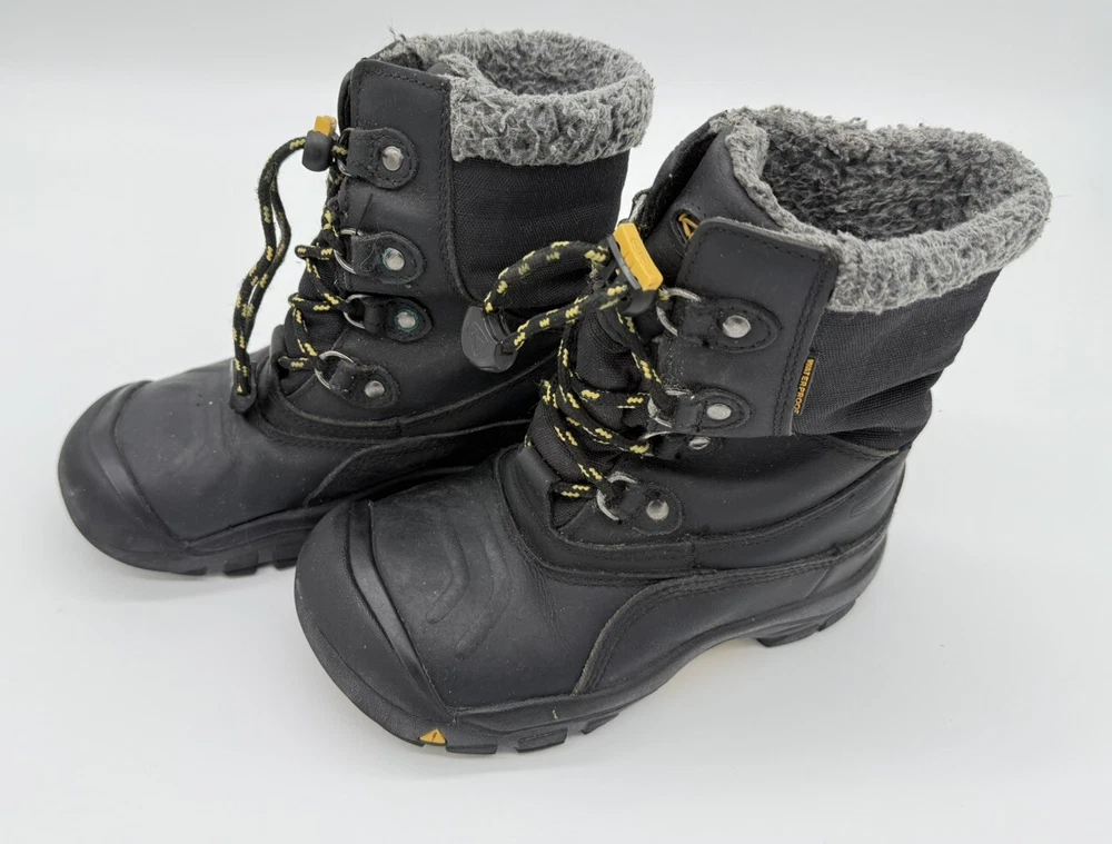 Boots are in good condition, no rips or tears. The labels in the boot are hard to read. They do show some wear on the cleats of the boots and fabric around the boot opening, but still have a lot of life left in them. The gray fabric at the top of the boot is a little "pilly". Laces have a cinch on them, so no need to tie them. Keen Warm 200 gram insulation. Wrap up your young one's feet in the dependable warmth and protection of KEEN's Warm Basin Boots. Designed with a versatile 200 gram lining, these boots are suitable for a range of seasons, ensuring comfort whether hiking in the spring or embarking on a winter adventure. The sleek black color and classic high-top lace-up closure make these boots a timeless addition to any active boy's wardrobe.Crafted with a durable leather textile upper and featuring a cap toe design, these boots are built for enduring style and waterproof performance. Ideal for both hiking and hunting, the robust construction paired with the thoughtful features such as the solid pattern and standard shoe width cater to practicality without compromising on style. The KEEN Warm Basin Boots are a solid choice for youth sizes 13.5 US and 13 UK ready to take on any outdoor challenge.