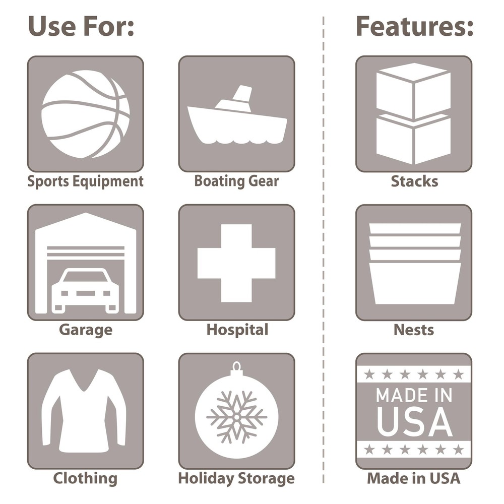 DURABLE STORAGE TOTES: The 12 Gallon KeepBox is made from industrial-grade plastic; These storage bins withstand heavy use and the textured bottom ensures a no-slip grip, preventing unwanted movement during storage or transport STORAGE BINS WITH LIDS ATTACHED: The storage containers feature hinged lids to keep your items safe and secure and eliminate the need to search for lost lids; Steel hinge pins provide strength and durability; Padlock eyes on the lids accommodate zip ties CLEAR SIDES FOR VISIBILITY: Clear plastic storage totes make it easy to see what is inside; Use them for garages, attics, basements, sheds, RVs, sports equipment, fishing, boating, camping supplies, holiday decorations, craft rooms, or home office storage STACKING AND NESTING: Stacks with lids closed and nests with lids open, adding to storage efficiency; Handles are molded into the sides to make them easy to carry; These storage totes are a reliable choice for moving, shipping, or as a truck bed organizer DIMENSIONS: With dimensions of 21.5-Inch x 15.25-Inch x 12.5-Inch, these large storage bins are perfect for organizing a variety of items; Proudly made in the USA, this storage tote is versatile for all activities