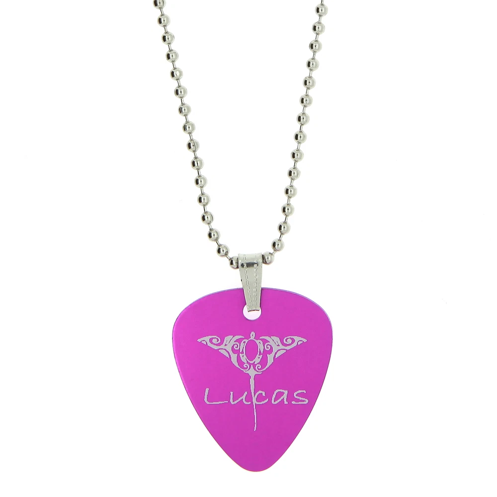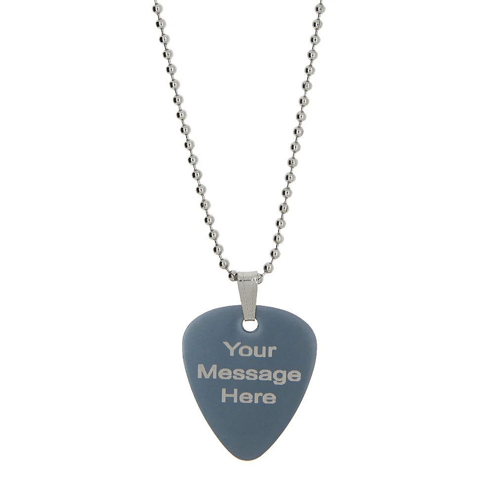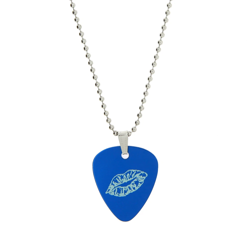 Custom Made Double Sided Full Vibrant Color Light Weight Aluminum Pendant GUITAR PICK Dog tag with 24" Military Ball Chain This Guitar Pick dog tag is not cheap and NOT A dull sublimation dog tag. We can print your logo, name, initials or whatever the message that you want us to etch it in! Guitar Pick Measures: 29mm X 33 mm (1.14" X 1.3") Chain Measurement: 24" Stainless Steel Ball Chain Colors to choose from: Hot Pink, Black, Blue, Purple or Pewter FRONT SIDE PERSONALIZATION ONLY BACK SIDE CAN BE DONE AT EXTRA $8 AFTER YOU PURCHASE THE ITEM WE NEED BELOW INFORMATION FOR YOU: 1. MESSAGE, WORDS, INITIALS, NAMES, OR LOGO THAT YOU WANT US TO ETCH OR IF YOU WANT US TO DO LIP PRINT; PLEASE SEND US THE SCAN PICTURE OF YOUR LIP PRINT OR WE CAN PRINT ONE JUST LIKE PICTURE! HOW TO DO LIP PRINT: PUT ON RED LIPSTICK SO IT CAN STAND OUT GOOD KISS IT ON THE PAPER THEN SCAN IT WITH YOUR SCANNER TO SEND THE PICTURE 2. Color of Dog Tag you want us to put it on if you do not choose then we'll choose one for you ***** PLEASE DO NOT PLAY GUITAR TO KEEP PROLONG LIFE OF THIS PENDANT ******* We may display your fully made item on our eBay and our other websites for sample purpose only (not for sale). If you don't want us to display your case, please let us know. *Licensed Logos, Trademarks, and Professional Pictures are Prohibited without Permission* *Above pictures are super magnified. Actual item can be smaller or bigger than the picture* (Since it is super magnified little scratches/ holes might not even noticed with naked eye.) Thank you. Colors may be vary depending on your monitor FOR INTERNATIONAL BUYERS: CUSTOMS TAX IS BUYERS RESPONSIBILITY