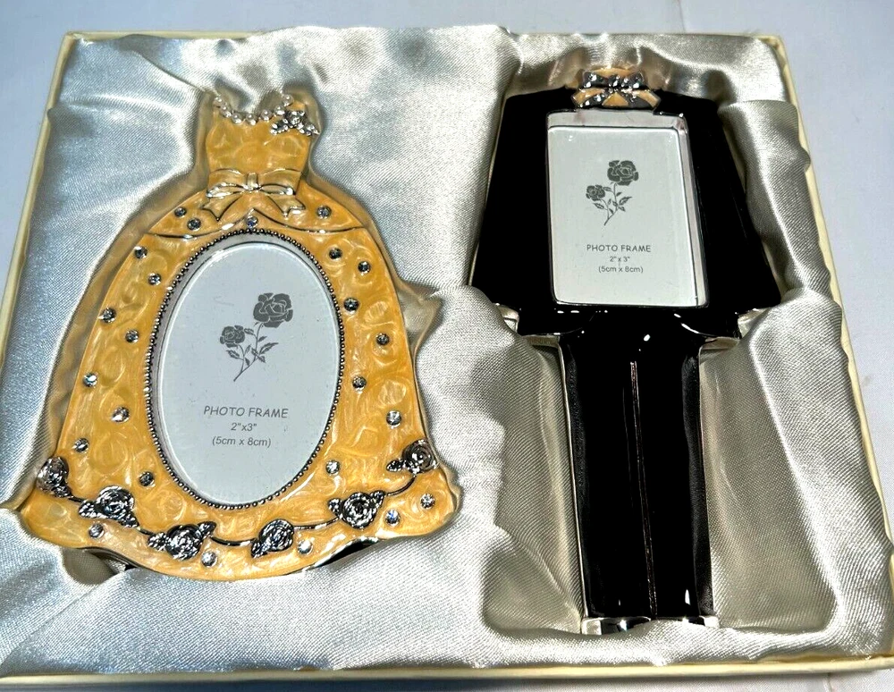 The "Keepsakes and Memories Picture Frames Wedding/Prom Dress and Tuxedo" is a set of two contemporary metal tabletop frames designed for special occasions like weddings, anniversaries, or engagements. The frames feature a dress and suit pattern, suitable for displaying photos in portrait orientation. The interior dimensions accommodate photo sizes of 3"×2" and 2-1/2"×1-5/8", with item heights of 5-1/2" and 6-1/2" and widths of 4-1/2" and 3-1/2" respectively. These rear-loading frames are freestanding and make for a stylish way to preserve cherished memories from formal events.