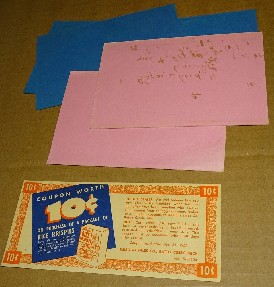 the Rice Krispies coupon is dated 1955 (2.75 x 6") the ink blotters are not dated but look like 1930s/1940s (3.75 x 5.5") Code JSB251