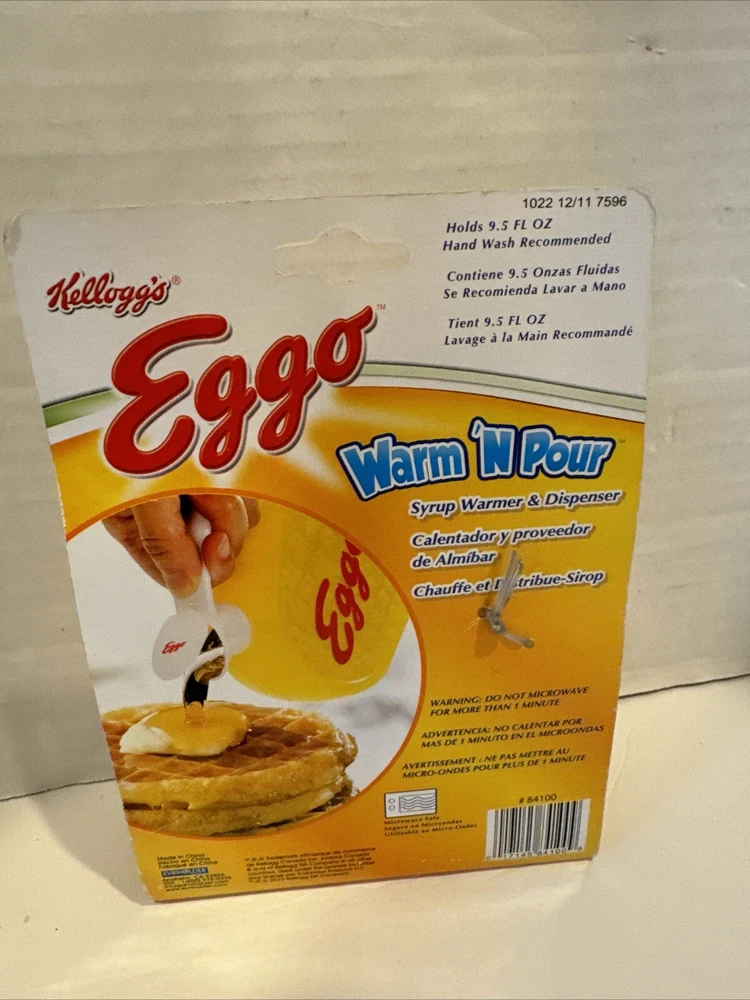 Add a vintage touch to your breakfast table with the Kellogg's Eggo Waffle Warm and Pour Waffle Shaped Syrup Dispenser. This original bottle-shaped dispenser, created in 2011, is designed to resemble waffles and can hold up to 4 bottles of your favorite syrup. The yellow and red colors give it a fun and playful vibe that will make your kids smile. Perfect for collectors and fans of Kellogg's, this dispenser is a must-have for any cereal-themed kitchen. It is made in China and can hold up to 4 bottles of syrup, making it a great addition to your breakfast table. Get your hands on this original piece of advertising and make your mornings a little more fun.