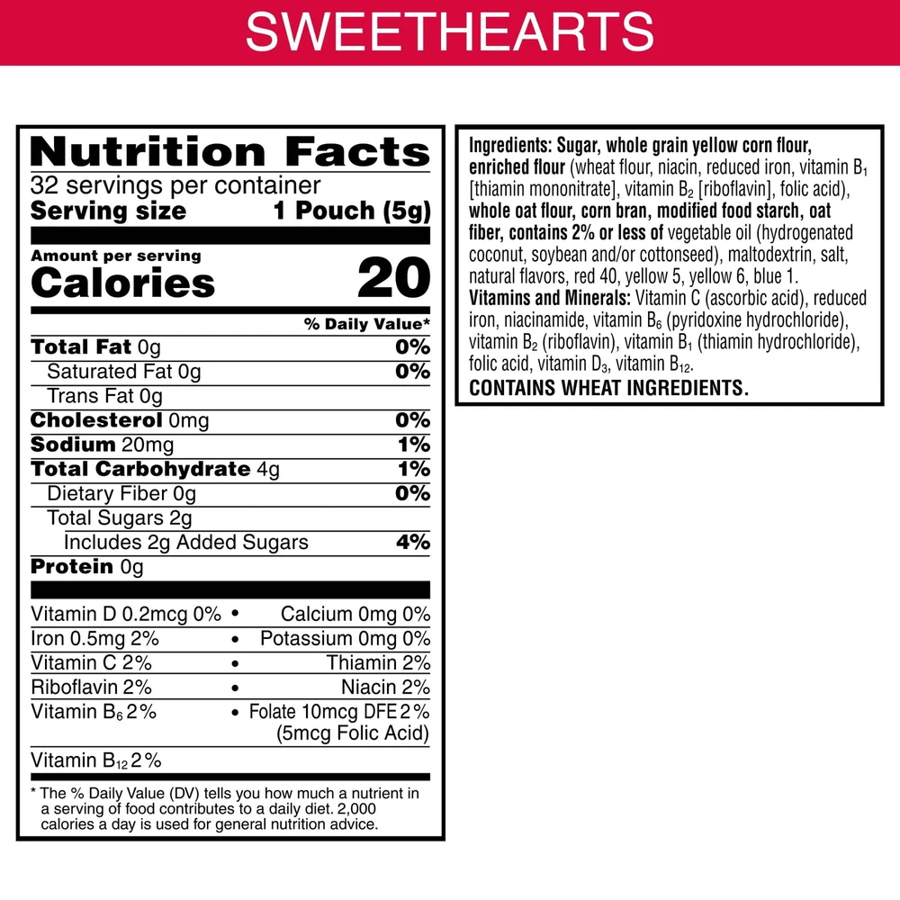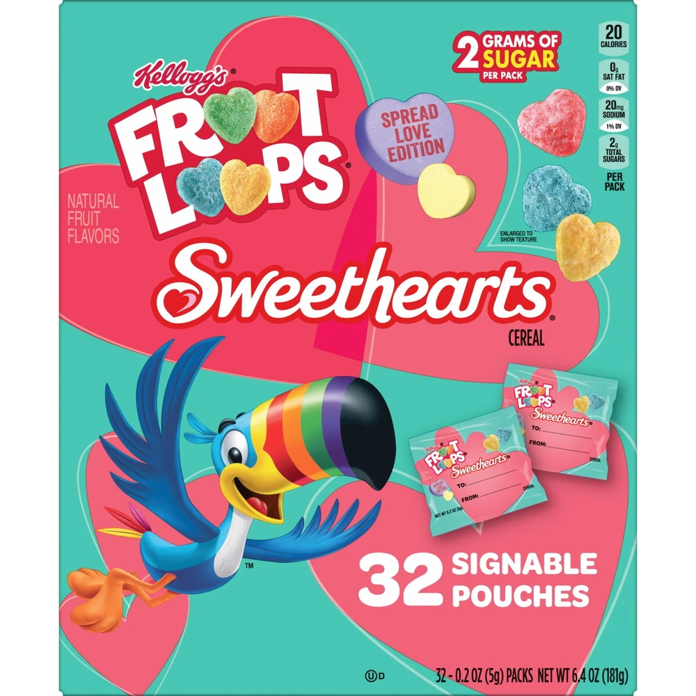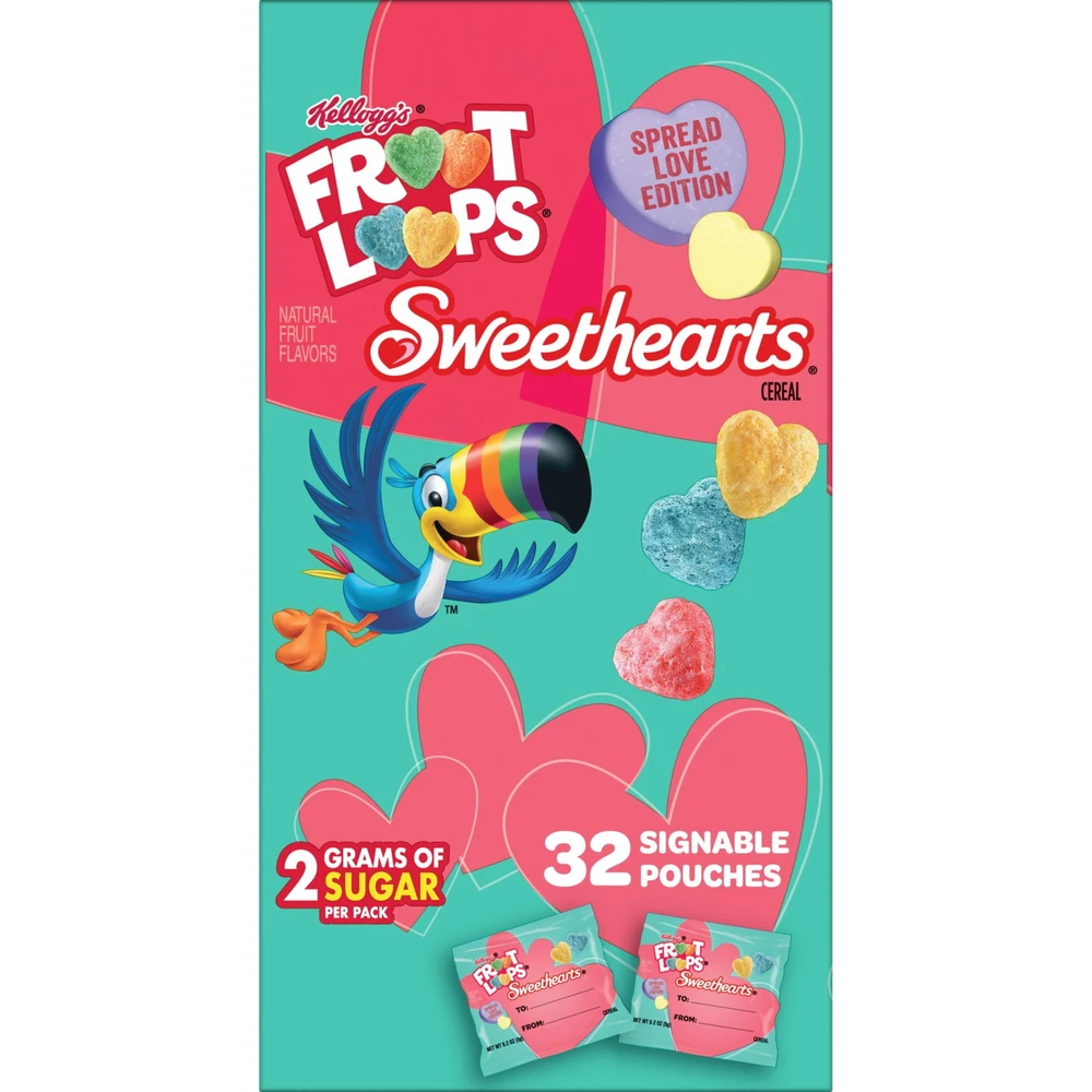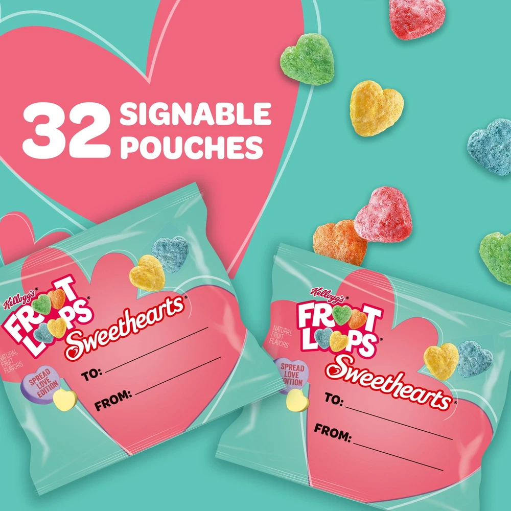 Follow your nose to delicious bursts of fruity flavor in Kellogg's Froot Loops Sweethearts cereal snacks. Perfectly sweet for Valentine's Day snacking, dig into vibrant crunchy heart-shaped pieces everyone will enjoy. It's like a heart-shaped rainbow in every pouch. Fun to eat for adults and kids, these healthy cereal snacks come in signable pouches that make classroom sharing easy; The entire family can enjoy as a quick morning snack, afternoon pick-me-up or as a late-night treat. These delicious crunchy Froot Loop snacks are perfect for Valentine's Day festivities, Valentine's Day classroom parties, Galentine's Day, or for simply celebrating the holiday. Always have these sweet cereal snacks handy, add fruity goodness to any lunch box, tote bag, or backpack. Any time you want an instant flavorful pick-me-up in your day, reach for a pouch of Kellogg's Froot Loops Sweethearts Spread Love Edition cereal snacks. Enjoy the sweetest time of year with cereal snacks bursting with fruity flavor in cute Sweethearts shapes perfect for Valentine's Day parties Froot Loops Sweethearts Spread Love Edition feature heart-shaped pieces with fruity flavors; Share Valentine's Day Froot Loops pouches with loved ones Healthy, delicious cereal snacks; Kosher Dairy; Contains wheat ingredients Pack in bags for Valentine's Day classroom parties and holiday festivities with friends and family; Signable pouches make classroom sharing easy Includes 1, 6.4oz cardboard box containing 32 pouches of Kellogg's Froot Loops Sweethearts cereal snacks; Packaged for instant freshness and great taste