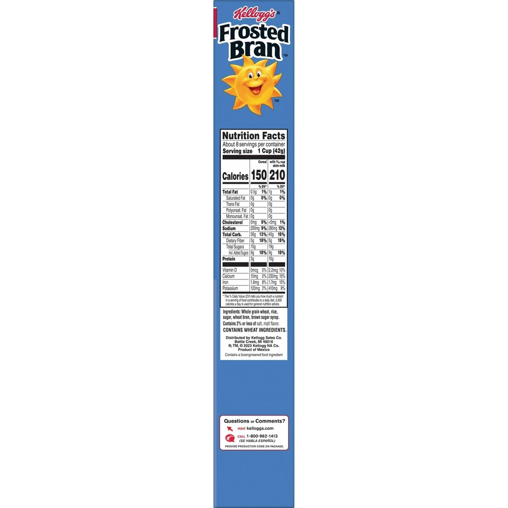Kellogg's Frosted Bran Breakfast Cereal, Fiber Cereal, Family Breakfast, Original, 12.7oz Box (1 Box) Description Wake up with Sunny and the simple goodness of Kellogg's Frosted Bran, a deliciously crafted cereal that's bursting with delicious. This crunchy, healthy cereal is made with crispy, toasted whole grain and bran flakes with a perfect amount of sweetness in every spoonful. Just as nutritious as it is delicious, this breakfast cereal is heart-healthy (while many factors affect heart disease, diets low in saturated fat and cholesterol may reduce the risk of this disease); Frosted Bran cereal provides a good source of fiber and is made with 16g whole grain per serving to help you start your day off strong. It's our best in every bite, a crunchy cereal that's filled with wholesome ingredients. Whether you enjoy your Frosted Bran in a bowlful of your favorite milk for a quick breakfast, sprinkled over yogurt for an afternoon treat, or as a crispy snack straight from the box after your workout, Kellogg's Frosted Bran cereal lets you rise, shine, and make the most of your day. Features: A healthy cereal with crisp, toasted bran flakes dusted with sweet frosting in every irresistible spoonful Start your day with crunchy bran flakes with a perfect amount of sweetness; Kellogg's Frosted Bran cereal is bursting with delicious Made with 16g whole grain per serving; Good source of fiber; Kosher Pareve; Contains wheat ingredients A low-fat cereal to enjoy with your favorite nut or dairy milk; Makes a tasty snack at work or as a quick dinner Includes 1, 12.7oz box of ready-to-eat Frosted Bran Original cereal; Packaged for freshness and great taste Product Details: Brand: Kellogg's Flavor: Frosted Age Range (Description): Adult Item Form: Flaked Specialty: Dairy Free, Kosher Certified Package Dimensions : 11.18 x 7.8 x 1.85 inches; 14.82 ounces UPC : Manufacturer : Kellogg's Country of Origin : USA Handling We will ship all orders within 3 business days of payment. Delivery We do not ship outside of the Continental US. Feedback We take our reputation seriously, we buy and sell online, so we understand the value of trust. If you are unsatisfied with your order, please contact us and we will work with you to resolve it to your satisfaction.