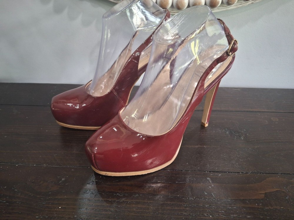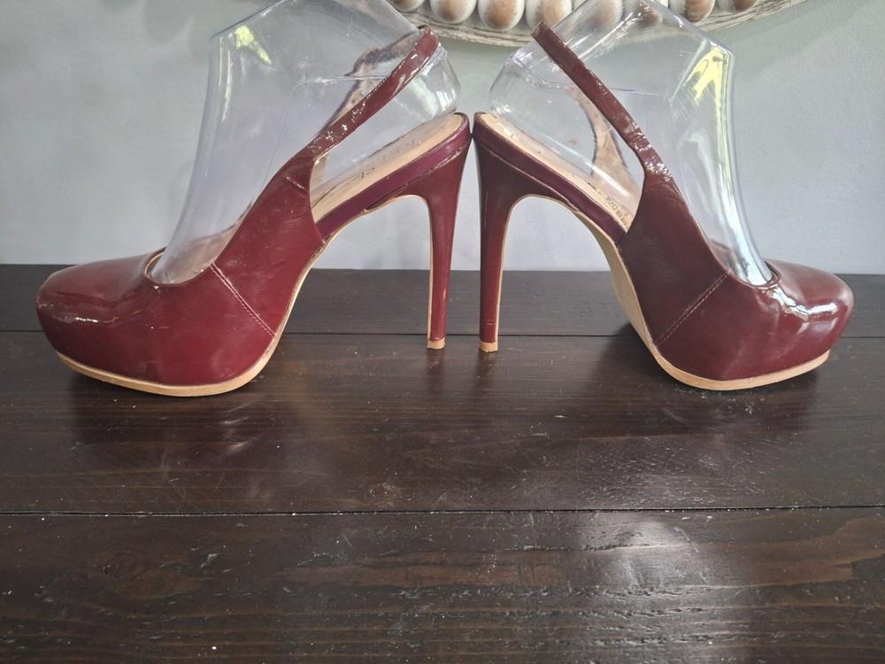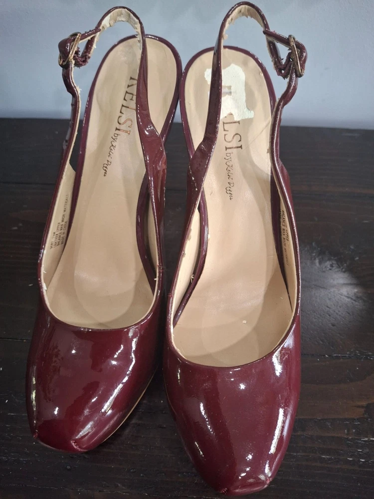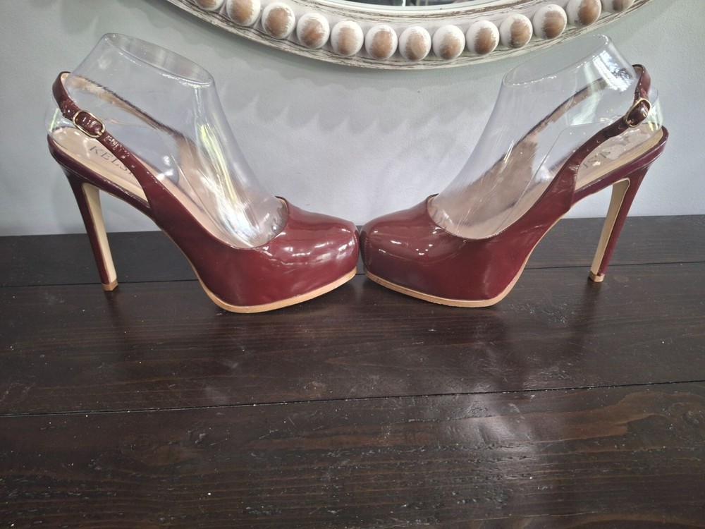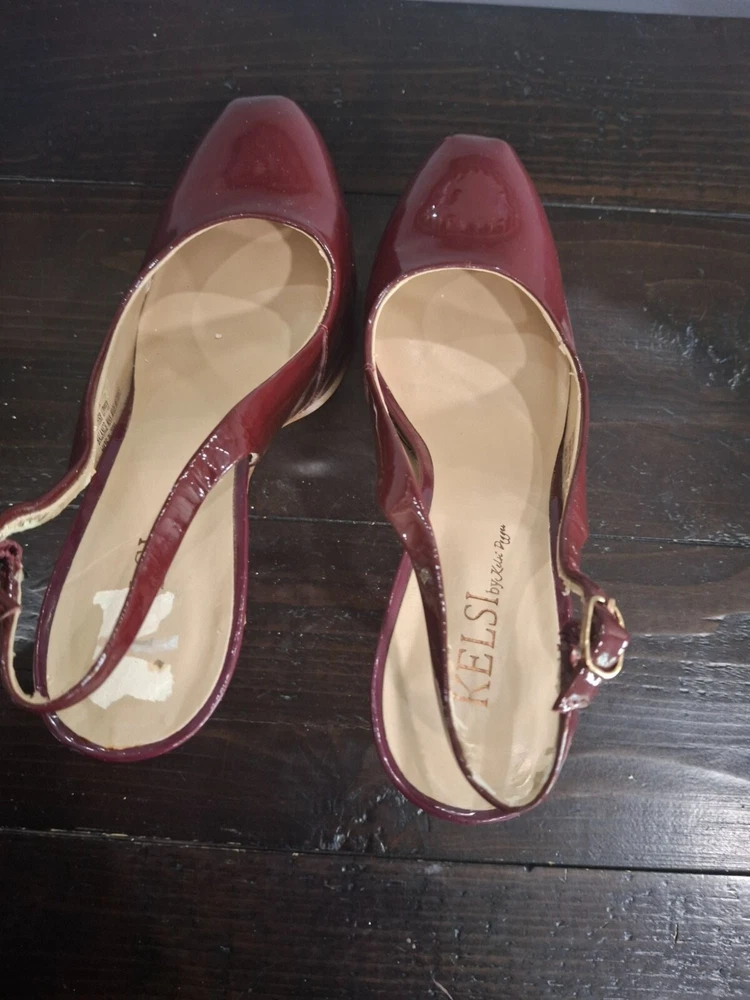 Elegant Kelsi Dagger slingback heels in burgundy patent leather, offering a chic and sophisticated look. Perfect for any occasion, these pre-owned shoes combine style and comfort with a medium fit. Ideal for fashion-forward individuals seeking a timeless addition to their wardrobe. • Burgundy patent leather • Slingback design • Pre-owned good condition-there is peeling on the inner lining and inner sole where retail sticker was removed • Chic and sophisticated • Comfortable fit • Ideal for various occasions Features: • Patent Leather • 5" Stiletto Heels • Adjustable Slingback Strap • Slingback Heels, Stilleto Heels Size: Womens 7.5M Condition: Pre-Owned Good