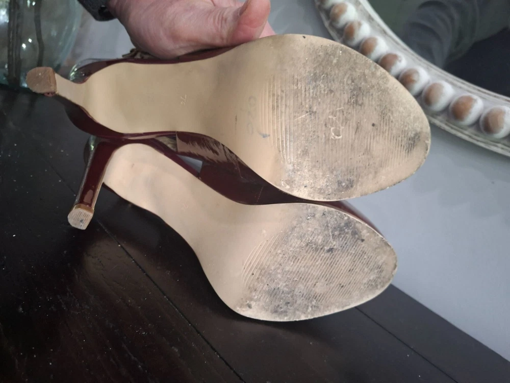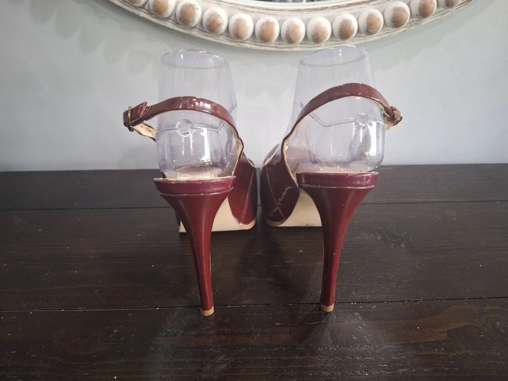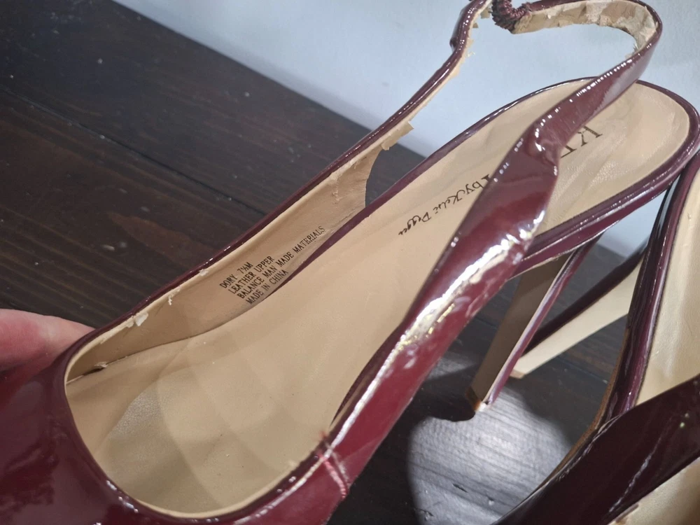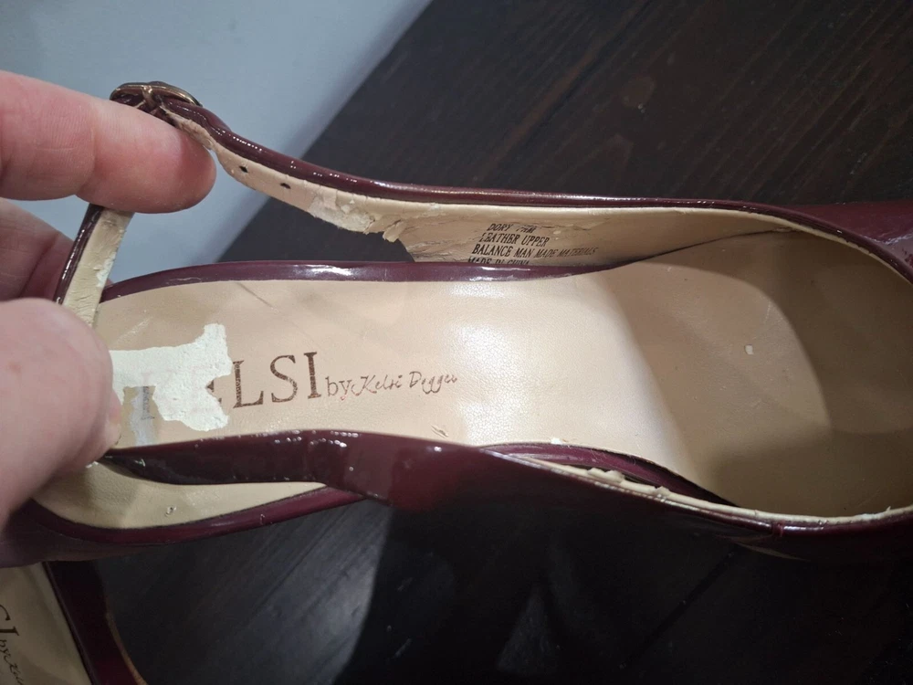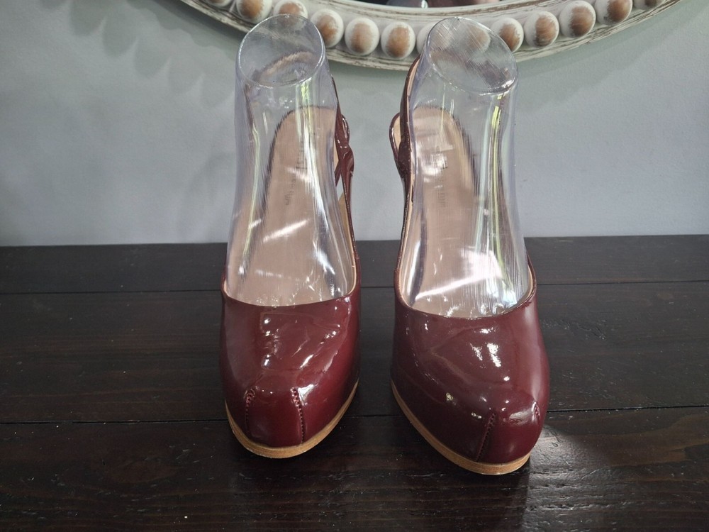Elegant Kelsi Dagger slingback heels in burgundy patent leather, offering a chic and sophisticated look. Perfect for any occasion, these pre-owned shoes combine style and comfort with a medium fit. Ideal for fashion-forward individuals seeking a timeless addition to their wardrobe. • Burgundy patent leather • Slingback design • Pre-owned good condition-there is peeling on the inner lining and inner sole where retail sticker was removed • Chic and sophisticated • Comfortable fit • Ideal for various occasions Features: • Patent Leather • 5" Stiletto Heels • Adjustable Slingback Strap • Slingback Heels, Stilleto Heels Size: Womens 7.5M Condition: Pre-Owned Good