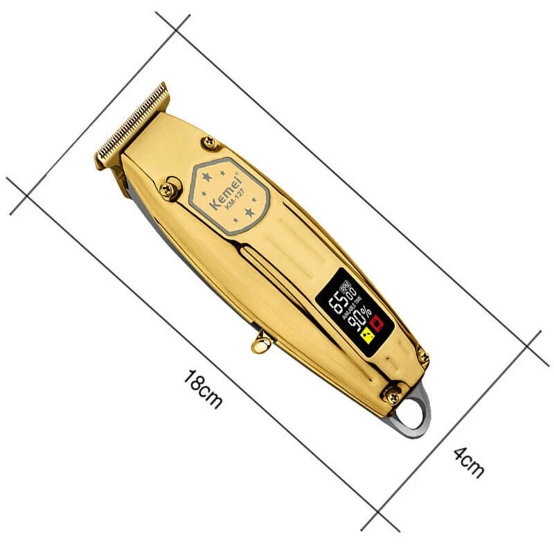 Kemei KM-127 Metal Rechargeable Cordless Hair Clipper Trimmer Pro Barber Machine Features: 100% brand new and high quality. The adjustable clipping comb (1 / 2 / 3mm) is applicable for clipping hair of different length. Carbon steel cutter head, sharp, never cut hair, no hurt to skin, low noise. USB rechargeable, charging 2 hours last 150min. It adopts the high-hardness hair clipper blades. Super nice design, with cutting length control wheel. Fit for both baby, kids and adults. Cutting the hair just like combing the hair, quickly, easily and safe. Great gift to kids, parents, friends. Specification Product Name: E lectric H air C lipper Model: KM-127 Material: ABS + S tainless steel cutter head Color: Gold, Silver Net weight: 320 g / 12oz Body size: 1 8 x 4 x 3 cm (7.09 x 1. 57 x 1. 18 " ) Charging time: 2 h Use time: 150min s Voltage: 100-240V 50/60H z Power: 12 W Power mode: USB rechargeable Packing size: 18 x 9.5 x 6 cm (7.09x 3.74 x 2.36 ” ) Gross weight: 500 g / 19oz Cleaning method: knife head washing Package Included: 1 x Hair Clipper 3 x Limit Combs (1mm /2mm /3mm) 1 x Cleaning Brush 1 x USB Cable 1 x User Manual