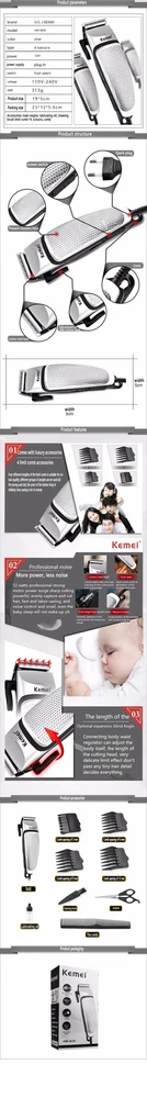 SPECIFICATIONS Brand Name : Kemei Origin : Mainland China Commodity Quality Certification : ce Hign-concerned Chemical : None Material : ABS+Metal Motor type : ROTARY Size : Original Number of nozzles : 3 - 4 pcs Length adjustment method : Change of nozzles Battery Charging Time : up to 2 hours Battery Life : over 90 minutes Item Type : hair trimmer Power type : Mains operation Function : Electric length adjustment Function : wet haircut Function : dry haircut Function : Automatic power selection based on bristle density Function : Washing knives under water Function : fast charging Function : Charging indication Maximum cutting length : 5 - 10 mm Purpose : For beard and mustache Purpose : For body Purpose : For the head Blade Material : STAINLESS STEEL Minimum cutting length : less than 0.5mm Choice : yes Specification: KM - 4639 is designed for all kinds of hairstyles and widely used, it is just for the household. The blade is high quality and durable, so it will not tangle your hair and always cut it neatly. Besides, you could choose the guide combs according to your need and will have an excellent haircut experience. Features: - The blade of carbon steel material, helpful for cutting smoothly - 4 guide combs (3mm/6mm/9mm/12mm) trim length, applying to different people and hair quality - Strong power with low noise design, rapid and effective - Thumb-adjustable taper lever, easy to handle minute hairs - Exquisite anti-skid holes design, more convenient to grasp and control - The rear hook of the body, perfect for storage and save space - The voltage is 220-240V, but the power will be weakened when used at 110V. Package Include: 1x Hair Clipper 1x Scissors 1x Comb 1x Cleaning Brush 1x User Manual 4x Limit Combs