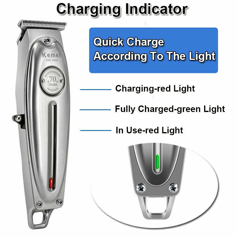 Kemei KM-1949 All-metal Professional Hair Clipper Electric Cordless Hair Trimmer Product Description Gender: Male, female. child Power Type: Rechargeable Use: Face, beard, moustache, barber Charging time: 2.5 hours Working time: 180 minutes Power: 5W Engine: very powerful Color: silver Material: metal Size : 16*4cm Package includes : 20.5*10.5*7.5cm Feature: All metal hair clipper professional barber tool , or home use 1400 mAh lithium battery fast charging and strong power *Combined with the ergonomic construction make this clipper top notch in both durability and comfort *Complete with a traditional steel set, its everything you need all in one *Innovative motor system drives power to both the precision hair clippers and the vacuum suction *Powerfully cut through even the thickest hair with ease *Professional Hair cutting kit features an easy-to-use compact clipper for multi-purpose grooming *Clipper has a durable, long-lasting powerful motor and self-sharpening precision ground blades that stay longer, provides accurate and consistent performance Package Included: 1 x Hair Clipper Host with Head 1 x Brush 3 x Limited Comb 1 x USB Cable 1 x User Manual