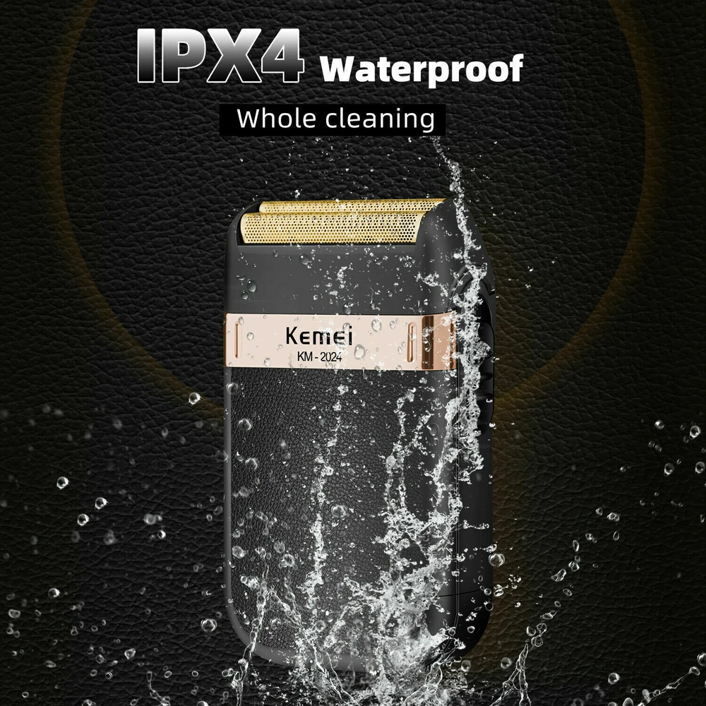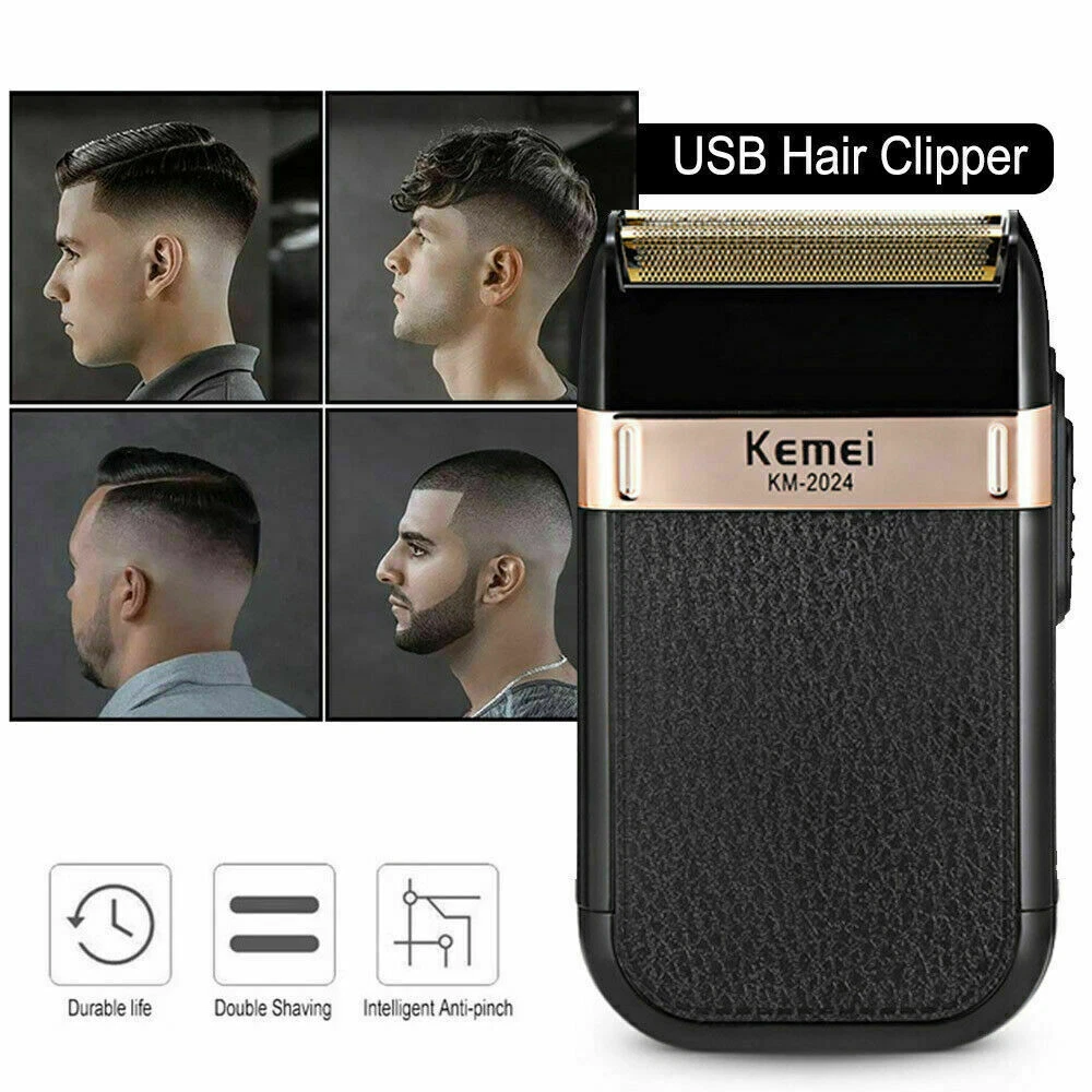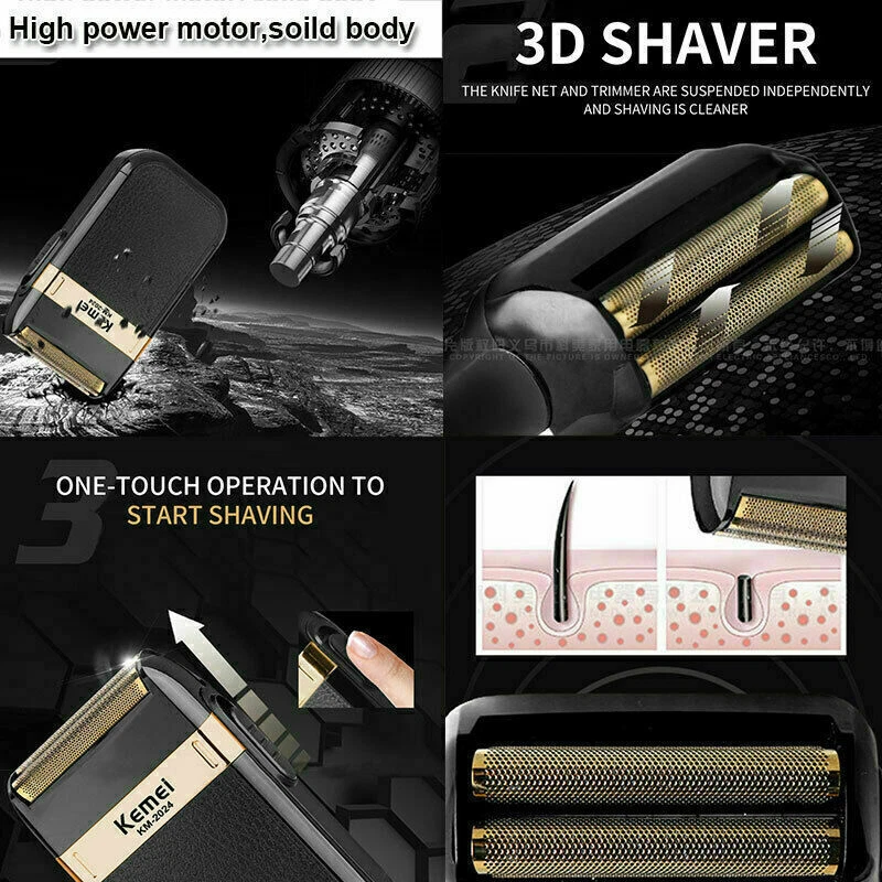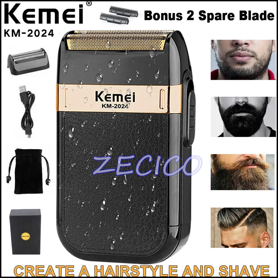 Men's Electric Shaver Trimmer Razor Rechargeable Hair Beard Shaving Machine Description: KEMEI KM-2024 Twin Reciprocating Mesh Blade Electric Shaver Waterproof USB Rechargeable Razor Barber Beard Shaving Trimmer Specifications: Brand Name: KEMEI Model: KM-2024 Power supply mode: USB charging Cleaning method: Whole body washable Full Charge time: 8 hours Razor blade: Twin Reciprocating Blade Maximum power: 3W Net weight: 100g Size: 120 X 60 X 30mm/4.72 X 2.36 X 1.18" Included: 1 X Shaver 1 X Mesh Blade 1 X Carrying/Travel Velvet Bag 1 X Cleaning Brush 1 X USB Charging Cable Notes: 1. Due to the different monitor and light effect, the actual color of the item might be slightly different from the color showed on the pictures. Thank you! 2. Please allow 1-3mm measuring deviation due to manual measurement.