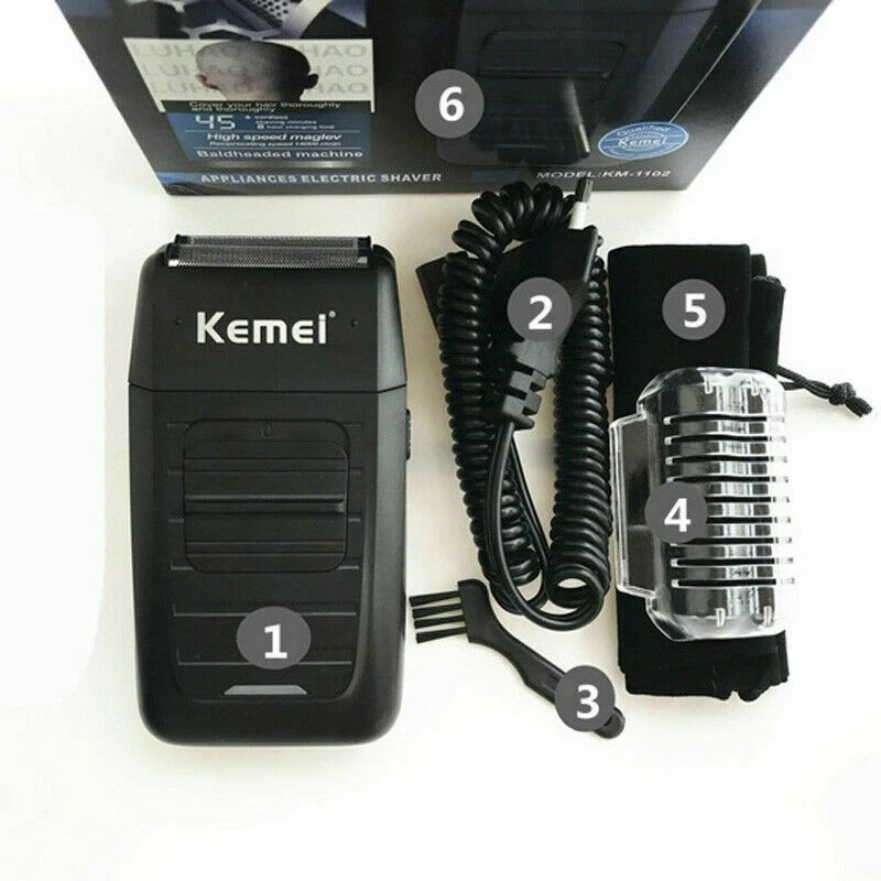 Features: Double mesh cutter head, two layers of independent floating knife net, shaving without dead ends Pop-up corner knife for easy handling of difficult parts Specifications: Power Type:Rechargeable Blade Use:Face, for barber. Plug:EU Usage Time:45Mins Washing Mode:Cleaning brush clean With trimming device:Yes Charging Time:8h Model Number:km-1102 Power:3W Color:Black Material:abs+stainless steel Size:13.7*5*15CM Voltage:(220V, it can be charged at 110v too )50hz/60Hz What's included: 1* Shaver 1* Protective cover 1* chagrer 1* Cleaning brush 1* Manual Note: Light shooting and different displays may cause the color of the item in the picture a little different from the real thing. The measurement allowed error is +/- 1-3cm.