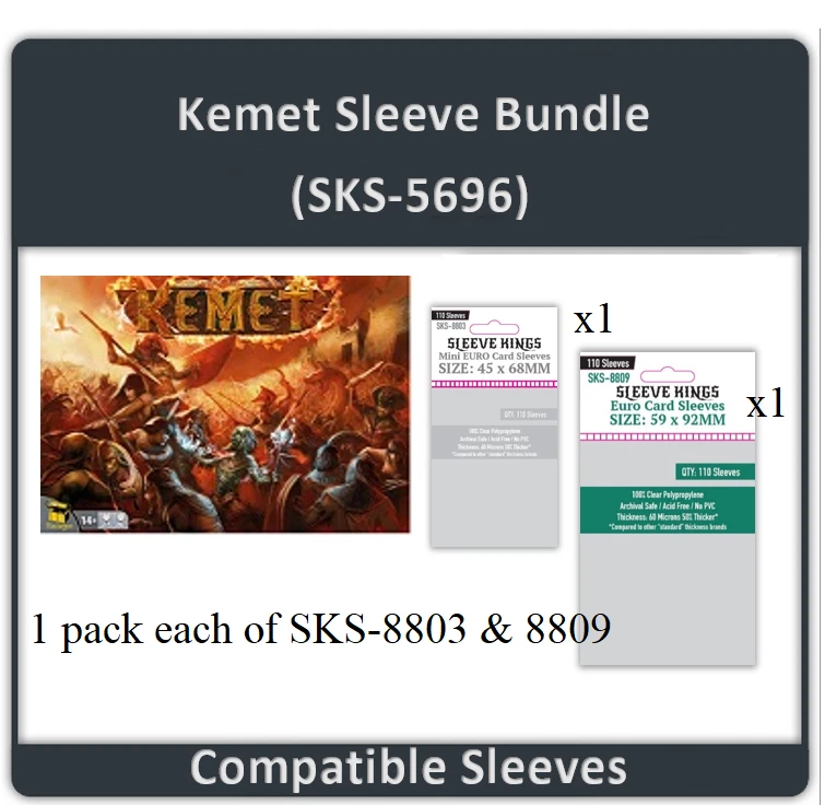 This is all the sleeves for the game "Kemet" Compatible Sleeve Bundle (8803 X 1 + 8809 X 1) Note we have calculated the number of packs for this bundle based on THIS page. ** Note Game Titles and their intellectual property rights are © and TM of their respective rights holders, no challenge to these rights is expressed or implied. Compatibility claims only extend to the physical size of the cards in each respective game and no claim to endorsement or authorization by the respective rights holders is expressed or implied by Sleeve Kings. Our products are compatible with the respective games only and all rights are reserved by the respective rights holders.