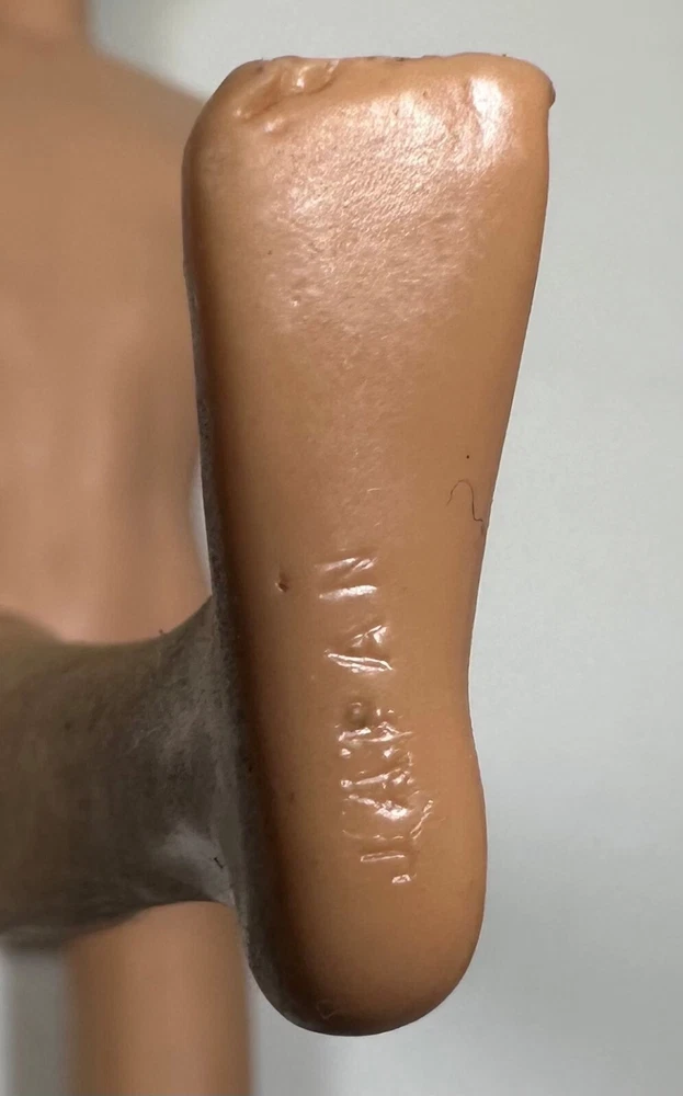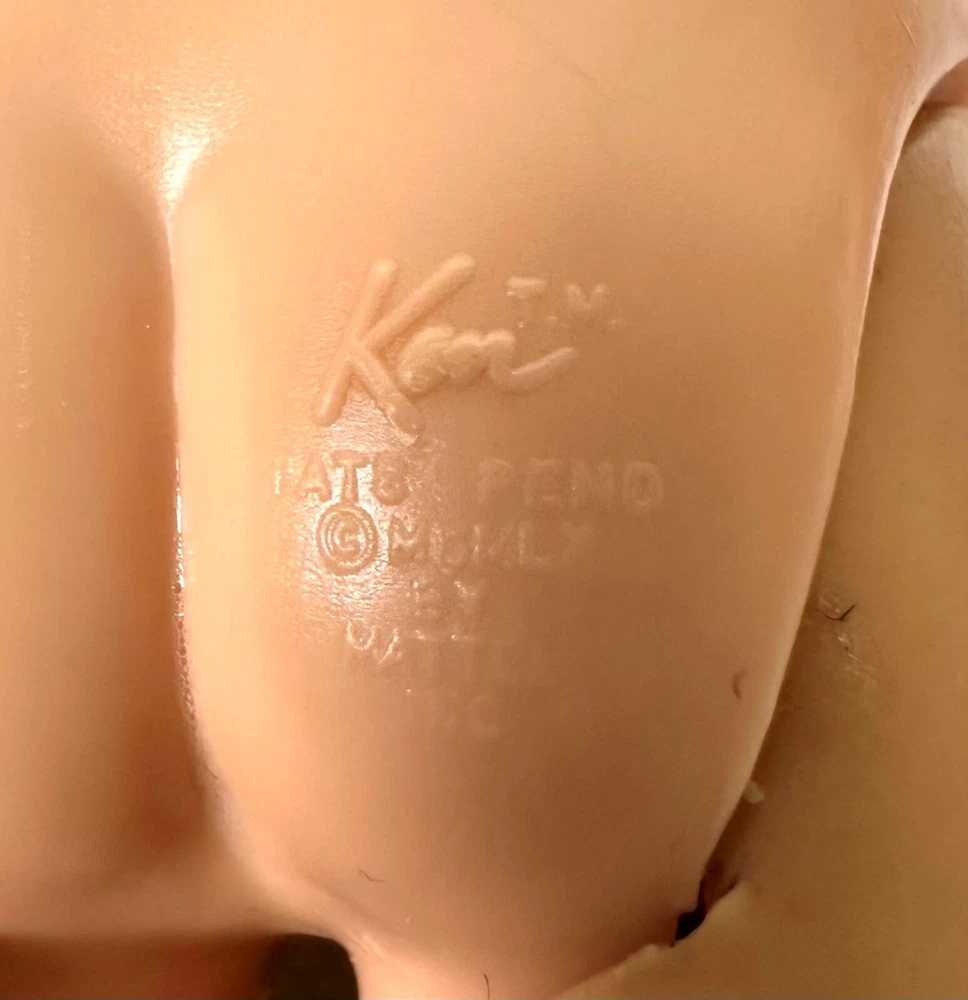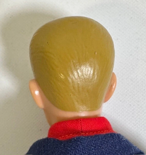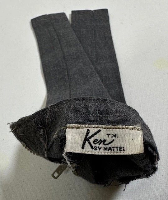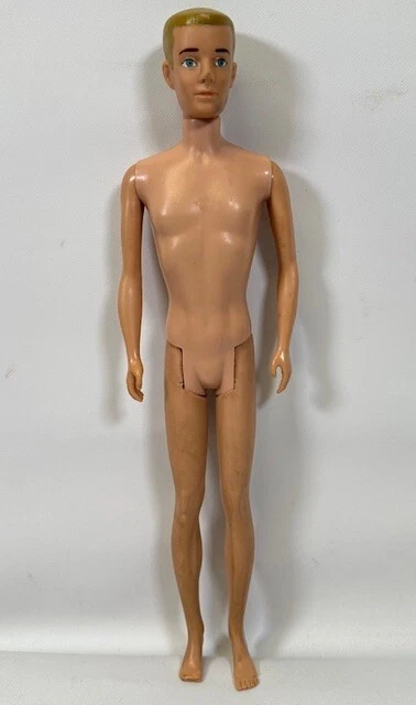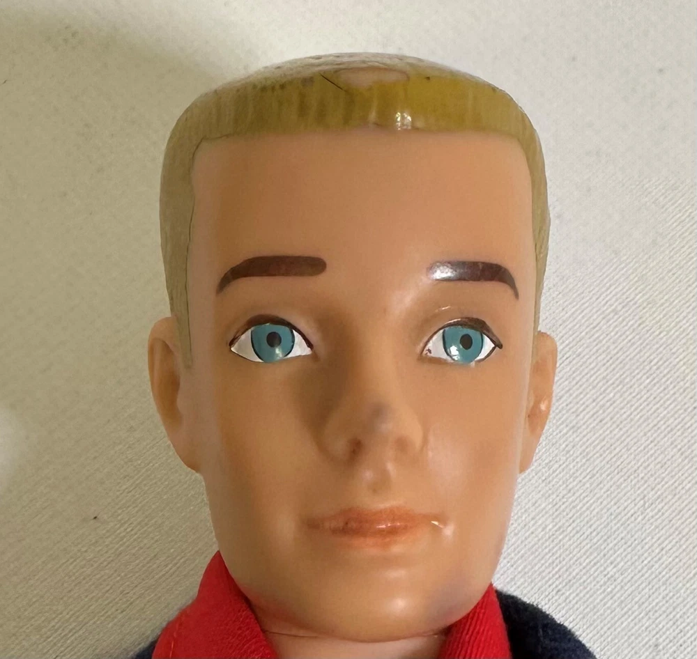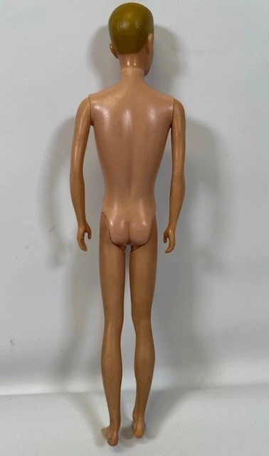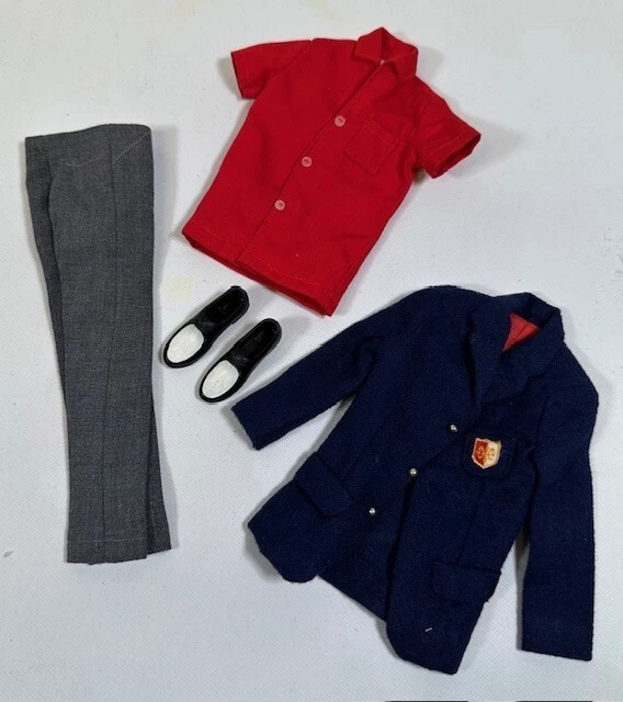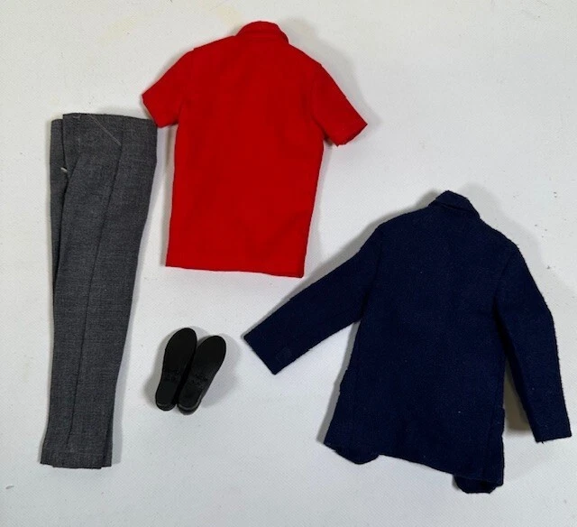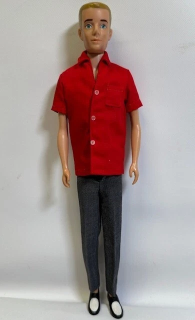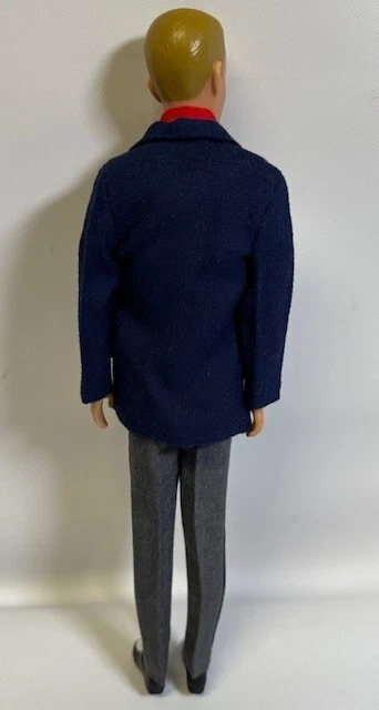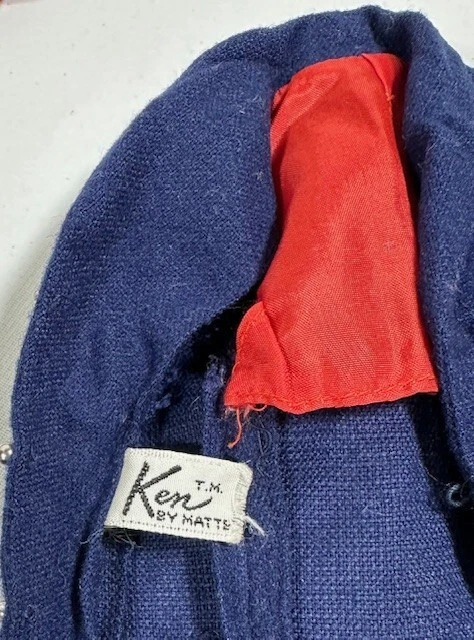 You are looking at a vintage Ken doll manufactured by Mattel in Japan in 1961. This Ken doll has blonde hair, blue eyes, and is 12 inches tall. Ken Patent Pending on right buttock. Japan on bottom of right foot. H.K. on bottom of shoes. It comes without packaging. *Toes on right foot are missing .* Includes the following clothing: · Going Bowling Red Shirt & Grey Pants · Pak Navy Blazer · Black Shoe Navy blue soft knit blazer with a red and white crest with a gold embroidered Fleur-de-lis on the upper breast pocket, half red lining and three gold beads and loop closure. Red Short Sleeve cotton shirt that has three white buttons on front. Grey zippered pants. All snaps and the zipper work. The Ken ™ by Mattel tag is sewn into the blazer, shirt and pants. Black & White Shoes. Ken doll and clothing are in good condition. From a smoke free environment.