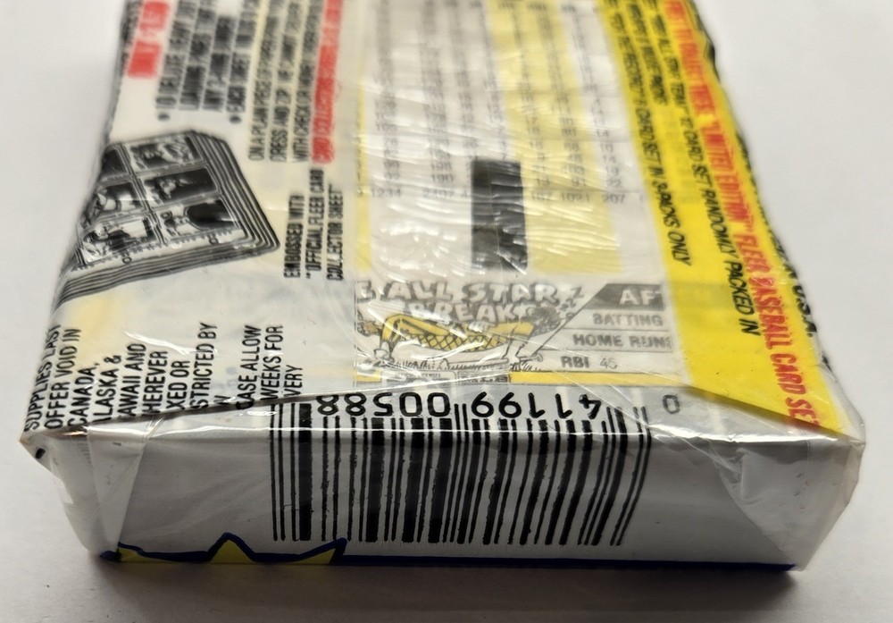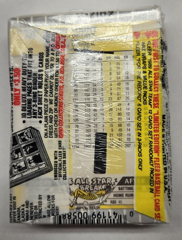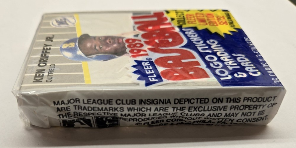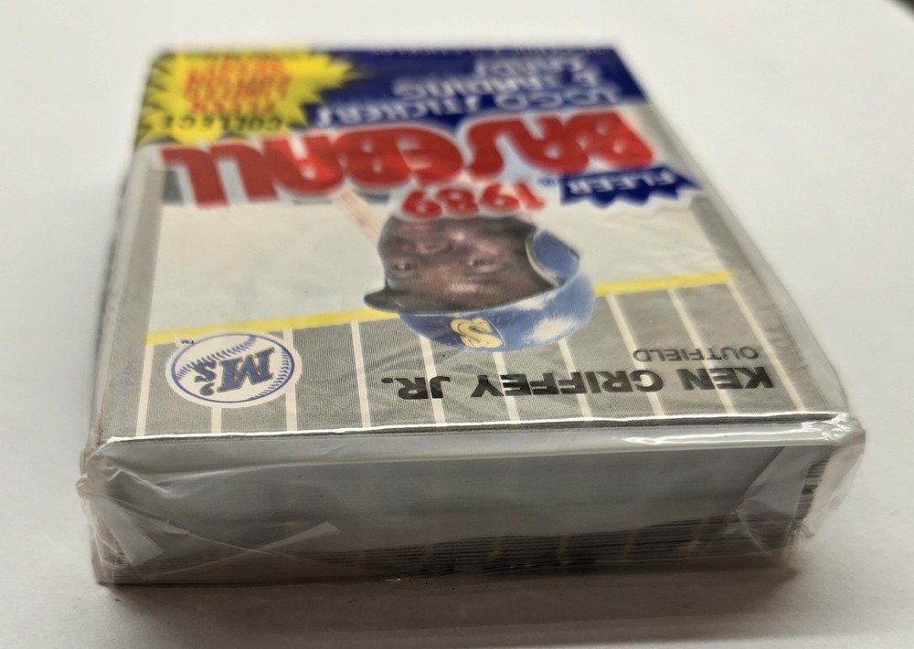 The 1989 Fleer Cello Pack featuring Ken Griffey Jr Rookie card on the top of the pack dispensed from a factory sealed box is a highly sought-after vintage collectible for baseball fans and card enthusiasts alike. This standard-sized trading card from the Major League (MLB) showcases the iconic player in his rookie year, making it a valuable addition to any sports memorabilia collection. this card is a prime example of the 1989 Fleer set, with features that make it a standout piece for collectors looking to own a piece of baseball history.