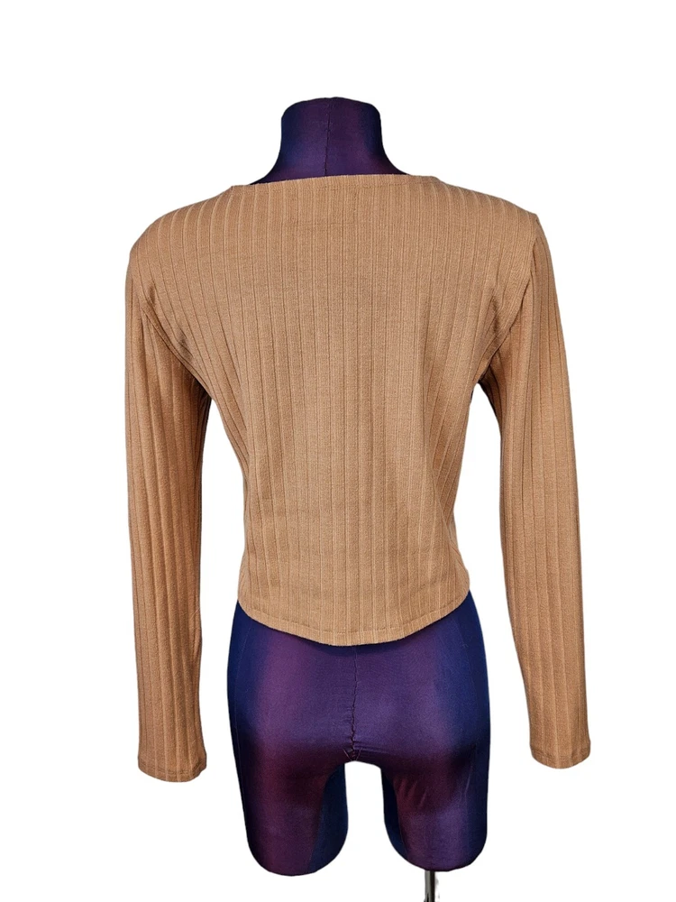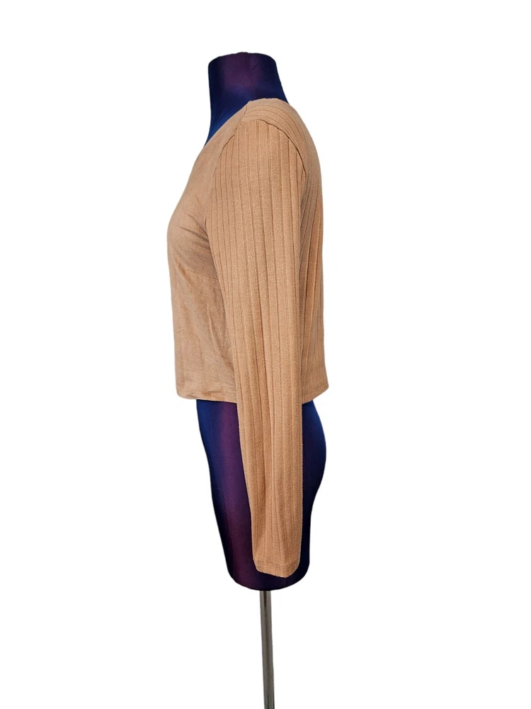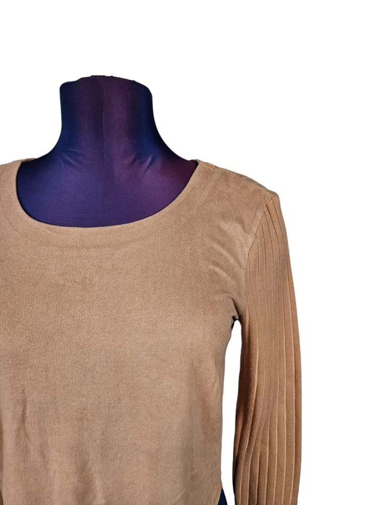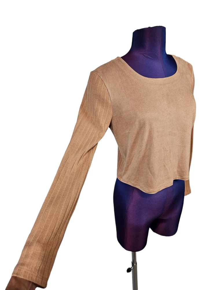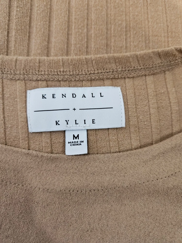 Kendall & Kylie Apricot Faux Suede Ribbed Knit Blouse Medium Women's Top M28 In like new condition Kendall & Kylie Apricot Faux Suede Ribbed Knit Blouse Medium Women's Top. Features soft apricot faux suede and ribbed knit top, faux suede front with ribbed knit fabric, long casual sleeve, crew neck, lightweight, form fitting, falls at natural waist. Measurements laying flat chest 17" length 18" arm inseam 16.5" Fabric polyester, spandex, rayon This is a pre-owned item that may show signs of wear. In like new condition, no flaws.
