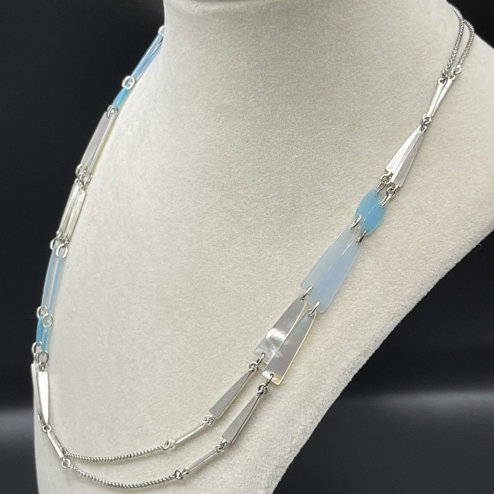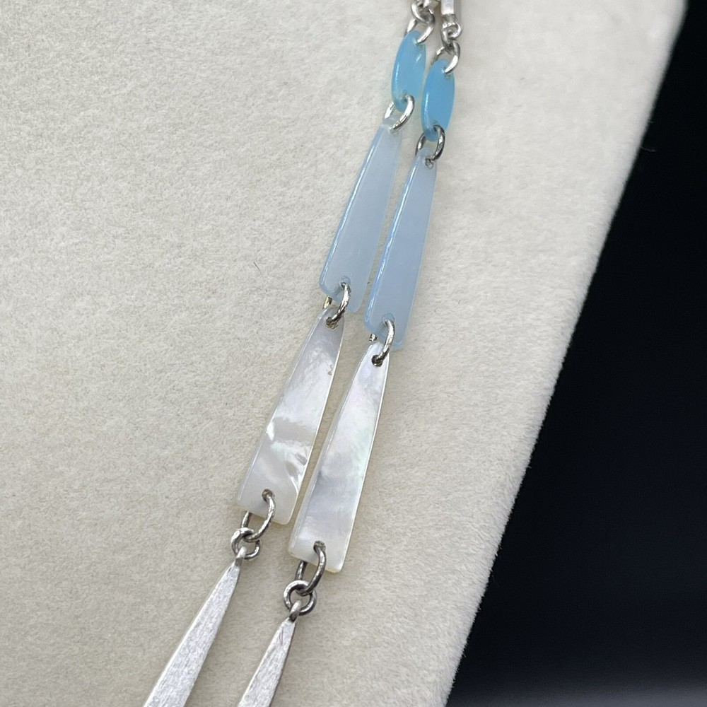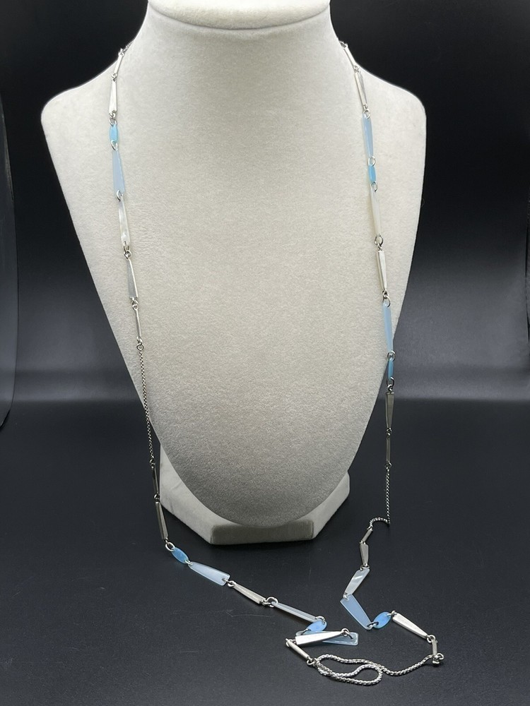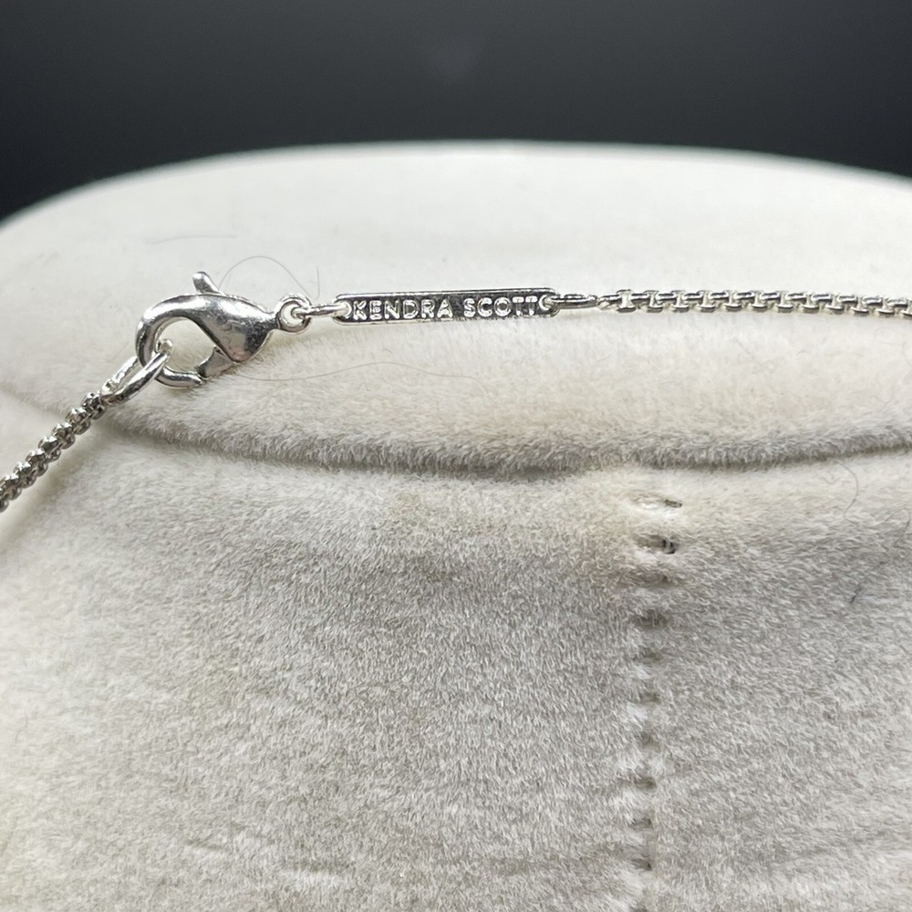 The Kendra Scott Aylin Long Necklace features a beautiful light blue shell pendant with a lobster clasp that adds a touch of elegance to any outfit. The pendant is made of high-quality acrylic material and is attached to a silver-plated metal chain that measures 40 inches in length. It can be worn long or layered. Pre- owned but in great condition.