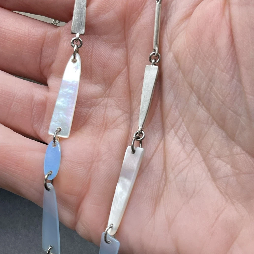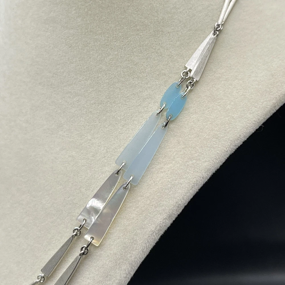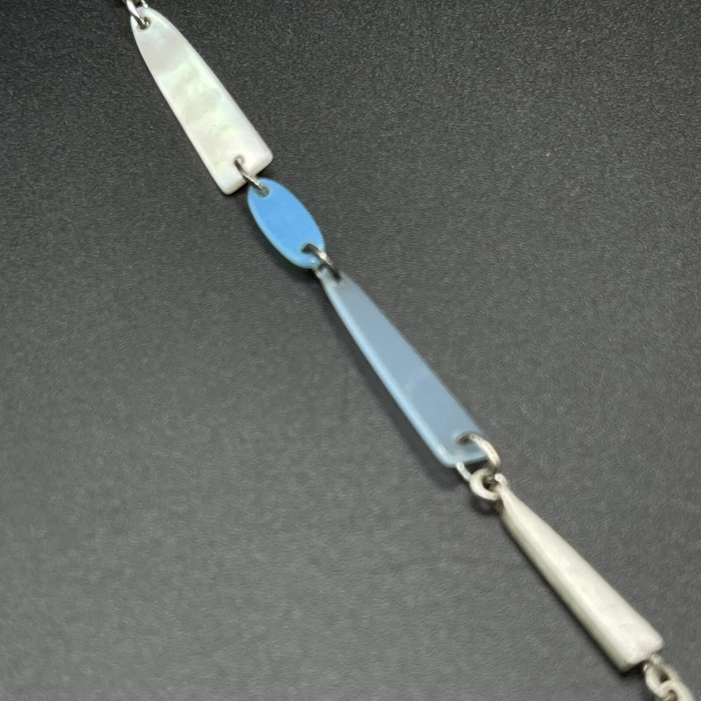 The Kendra Scott Aylin Long Necklace features a beautiful light blue shell pendant with a lobster clasp that adds a touch of elegance to any outfit. The pendant is made of high-quality acrylic material and is attached to a silver-plated metal chain that measures 40 inches in length. It can be worn long or layered. Pre- owned but in great condition.