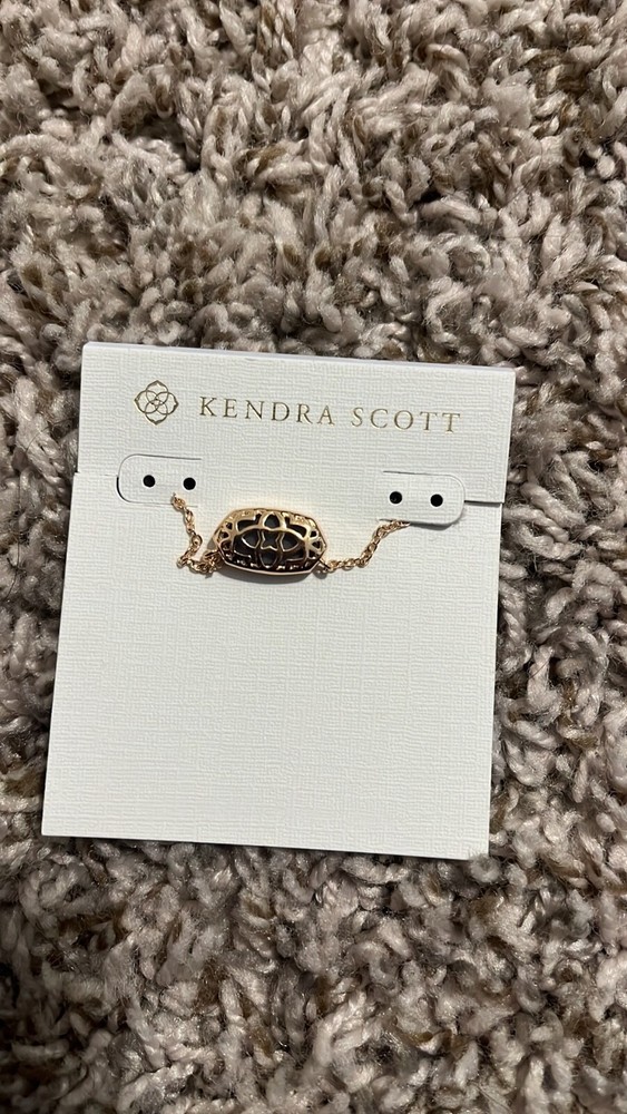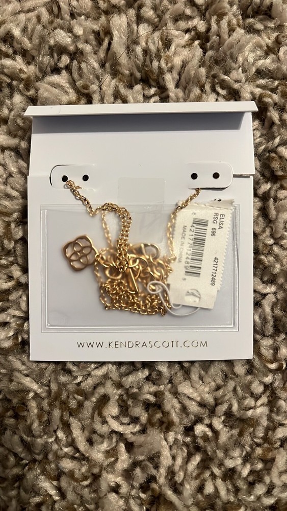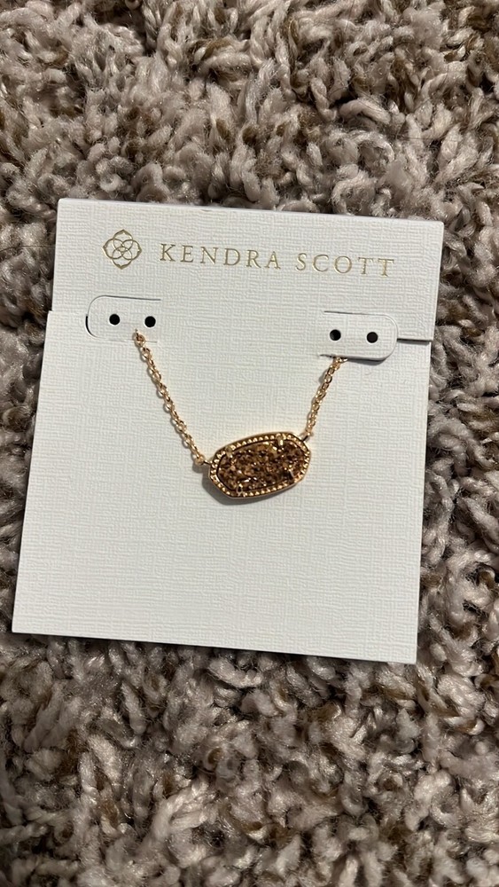 This is a Kendra Scott Elisa necklace in gold with a pendant featuring a drusy quartz stone. It is a new item with tags attached. This necklace is a fashionable and stylish piece of jewelry that would be a great addition to any collection.