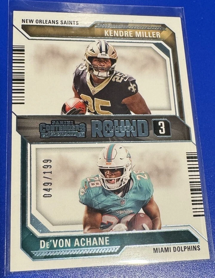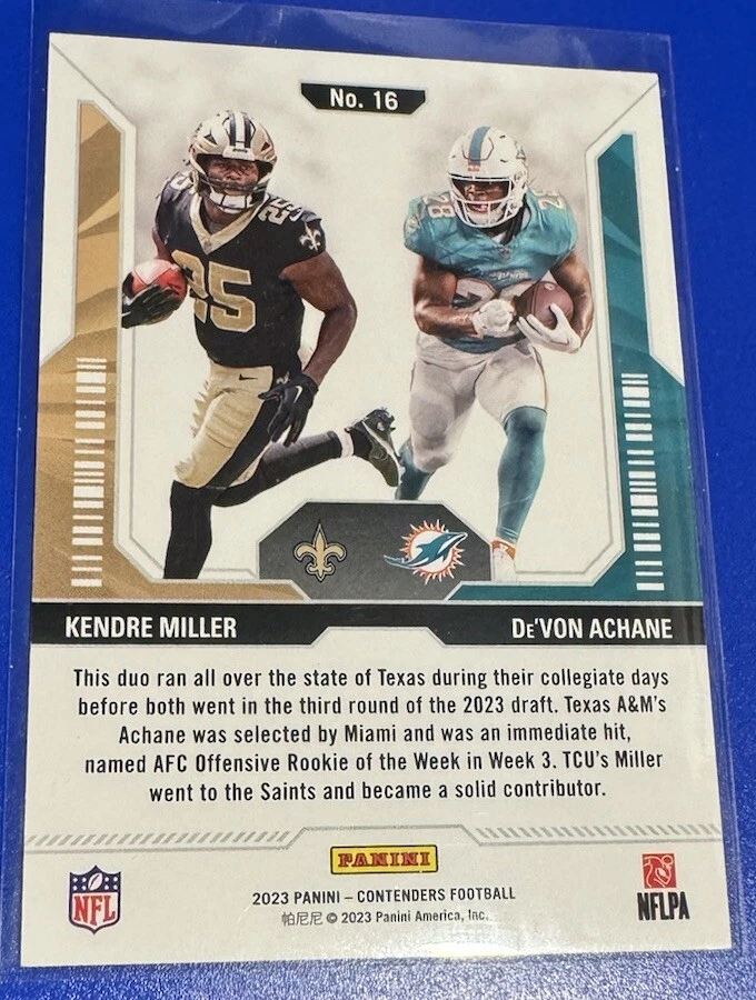 Team: Miami Dolphins, New Orleans Saints Card Name: Football Card Size: Standard Vintage: No Set: 2023 Contenders Season: 2023 Card Number: 16 Sport: Football Features: Insert, Parallel/Variety, Rookie, Serial Numbered, Short Print, 1st Edition, Base Set, Chase, Collectors Edition, Exclusive, Framed, Hologram, Limited Edition Country/Region of Manufacture: United States Type: Sports Trading Card Parallel/Variety: Teal Original/Licensed Reprint: Original League: National Football League (NFL) Player/Athlete: De'Von Achane, Kendre Miller Manufacturer: Panini Autographed: No