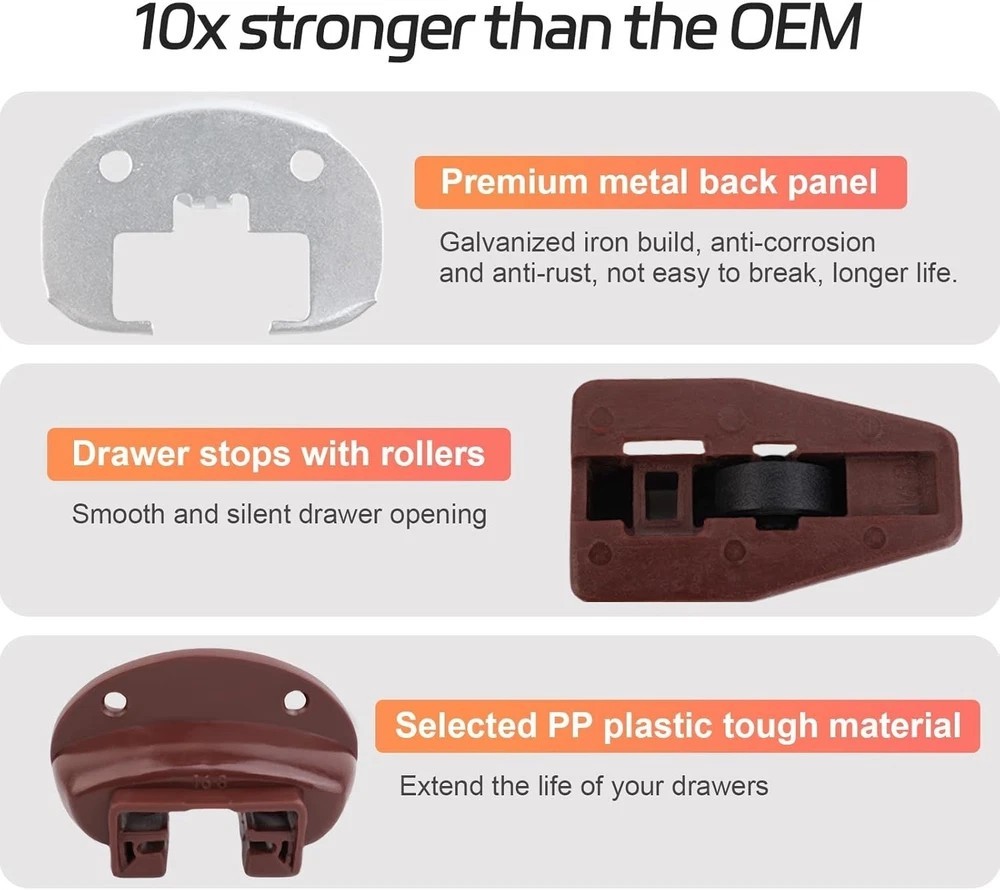 About this item 【Wide Compatibility】The drawer rail guide is UNIVERSAL and can replace drawer parts of the same shape and size. Compatible with kenlin rite-trak 2 fits manufacturers such as Vaughan Bassett, Legacy, Pulaski, Amish, Danish, Broyhill, Ashley, Pottery Barnand and more. ⚠️⚠️ You can know whether this item is suitable for your drawer repair parts according to pictures 2, 3. If you're not sure if a drawer rail replacement kit will fit, send us an email so we can confirm it for you. 【10x Stronger than the OEM】The rite-trak II replacement dresser drawer slides is a vast improvement over the original drawer guides. The plastic drawer guides are made of high quality PP hard plastic for longer life. The metal backs are made of galvanized iron, which is corrosion and rust resistant and will not break easily for a longer service life. 【Makes Drawer Feel Like New】Whether you’re fixing a dresser drawer system or restoring a vintage hutch, compatible with kenlin #168 drawer slides are a quick and inexpensive fix. Compatible with kenlin rite-trak ii replacement drawer track slide kits are a perfect upgrade to the plastic glides installed by the manufacturer. The extra metal cap provides sturdiness and longevity.You don't have to put up with squeaky, wobbly drawers anymore. 【Easy to Install】These are perfect drawer stoppers to replace the ones damaged on our chest of drawers in a move. Replacement was easy enough, just unscrewing the old ones and popping them off, then popping in the new ones and screwing them down - it will be the easiest part of your replacement or restoration project! You can find the installation video on Youtube, just search for "rite-trak II" to find the installation video. 【5 Years Supports】Sacumea is committed to giving buyers a happy shopping experience. And insist on providing excellent after-sales service for customers. If you have any dissatisfaction with the compatibility and quality of the rite-trak 2 drawer rail slide replacement kit, please click the seller information on the store or order page to contact us. We will provide you with services according to your needs. Product Description Drawer Slides for Rite-Trak II Replacement 168 Track Guides kenlin rite-trak II replacement 168 track guides The rite-trak 2 dresser drawer slides is a vast improvement over the original drawer guides. The drawer guides are made of high quality PP hard plastic for longer life. The metal backs are made of galvanized iron, which is corrosion and rust resistant and will not break for a longer service life. Makes Drawer Feel Like New Drawer Slides for kenlin Rite-Trak II Replacement 168 Track Guides The drawer repair kit With metal backing, and new style drawer stop with roller, extra plastic reinforcement, and larger head screws for reinforcement and extended life of guide system. Drawer Slides for kenlin Rite-Trak II Replacement 168 Track Guides The drawer guide is UNIVERSAL and can replace drawer parts of the same shape and size. This fits manufacturers such as Vaughan Bassett, Legacy, Pulaski, Amish, Danish, Broyhill, Ashley, Pottery Barnand and more. NOTE: You can know whether the item fit for your drawer according to pictures 2, 3. Product Size Package Includes: 5 dark-brown plastic track guides 5 new style drawer stop with roller 5 metal backing 15 Phillips drive pan head screws Drawer Slides for kenlin Rite-Trak II Replacement 168 Track Guides Application Range Drawer Slides for kenlin Rite-Trak II Replacement 168 Track Guides The rite-trak ii metal track replacement is great for your dresser, drawers on non-cabin, chest,armory, buffet, writing desks, study tables, storage cabinets, TV cabinets, etc. Drawer Slides for kenlin Rite-Trak II Replacement 168 Track Guides Shipping We offer FREE shipping on all orders! We ship within Three business days of payment, usually sooner. We use a selection of shipping services such as UPS, FedEx, USPS etc. We only ship to the lower 48 states, no APO/FPO addresses or PO Boxes allowed. Local pickups and combined shipping options are not provided at this time. Return You can return a product for up to 30 days from the date you purchased it. Any product you return must be in the same condition you received it and in the original packaging. Please keep the receipt. Payment We accept payment by any of the following methods: PayPal Please pay as soon as possible after winning an auction, as that will allow us to post your item to you sooner! Feedback Customer satisfaction is very important to us. If you have any problem with your order, please contact us and we will do our best to make you satisfied. Contact Us If you have any queries, please contact us via ebay. We usually respond within 24 hours on weekdays. Please visit our eBay store to check out other items for sale! Thank you for shopping at our store. Disclaimer We are working with different suppliers in USA to deliver the item to your doorstep. If you have any issues regarding the item, Feel free to ask.