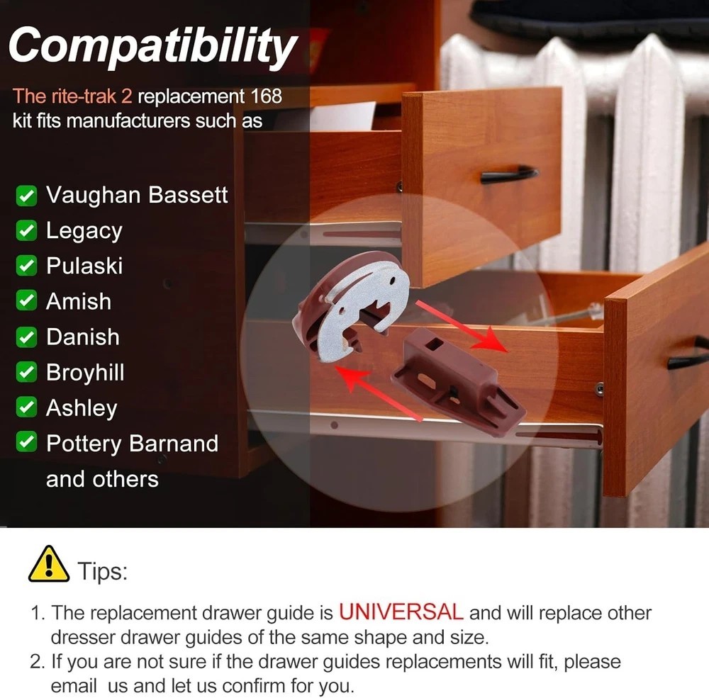 About this item 【Wide Compatibility】The drawer rail guide is UNIVERSAL and can replace drawer parts of the same shape and size. Compatible with kenlin rite-trak 2 fits manufacturers such as Vaughan Bassett, Legacy, Pulaski, Amish, Danish, Broyhill, Ashley, Pottery Barnand and more. ⚠️⚠️ You can know whether this item is suitable for your drawer repair parts according to pictures 2, 3. If you're not sure if a drawer rail replacement kit will fit, send us an email so we can confirm it for you. 【10x Stronger than the OEM】The rite-trak II replacement dresser drawer slides is a vast improvement over the original drawer guides. The plastic drawer guides are made of high quality PP hard plastic for longer life. The metal backs are made of galvanized iron, which is corrosion and rust resistant and will not break easily for a longer service life. 【Makes Drawer Feel Like New】Whether you’re fixing a dresser drawer system or restoring a vintage hutch, compatible with kenlin #168 drawer slides are a quick and inexpensive fix. Compatible with kenlin rite-trak ii replacement drawer track slide kits are a perfect upgrade to the plastic glides installed by the manufacturer. The extra metal cap provides sturdiness and longevity.You don't have to put up with squeaky, wobbly drawers anymore. 【Easy to Install】These are perfect drawer stoppers to replace the ones damaged on our chest of drawers in a move. Replacement was easy enough, just unscrewing the old ones and popping them off, then popping in the new ones and screwing them down - it will be the easiest part of your replacement or restoration project! You can find the installation video on Youtube, just search for "rite-trak II" to find the installation video. 【5 Years Supports】Sacumea is committed to giving buyers a happy shopping experience. And insist on providing excellent after-sales service for customers. If you have any dissatisfaction with the compatibility and quality of the rite-trak 2 drawer rail slide replacement kit, please click the seller information on the store or order page to contact us. We will provide you with services according to your needs. Product Description Drawer Slides for Rite-Trak II Replacement 168 Track Guides kenlin rite-trak II replacement 168 track guides The rite-trak 2 dresser drawer slides is a vast improvement over the original drawer guides. The drawer guides are made of high quality PP hard plastic for longer life. The metal backs are made of galvanized iron, which is corrosion and rust resistant and will not break for a longer service life. Makes Drawer Feel Like New Drawer Slides for kenlin Rite-Trak II Replacement 168 Track Guides The drawer repair kit With metal backing, and new style drawer stop with roller, extra plastic reinforcement, and larger head screws for reinforcement and extended life of guide system. Drawer Slides for kenlin Rite-Trak II Replacement 168 Track Guides The drawer guide is UNIVERSAL and can replace drawer parts of the same shape and size. This fits manufacturers such as Vaughan Bassett, Legacy, Pulaski, Amish, Danish, Broyhill, Ashley, Pottery Barnand and more. NOTE: You can know whether the item fit for your drawer according to pictures 2, 3. Product Size Package Includes: 5 dark-brown plastic track guides 5 new style drawer stop with roller 5 metal backing 15 Phillips drive pan head screws Drawer Slides for kenlin Rite-Trak II Replacement 168 Track Guides Application Range Drawer Slides for kenlin Rite-Trak II Replacement 168 Track Guides The rite-trak ii metal track replacement is great for your dresser, drawers on non-cabin, chest,armory, buffet, writing desks, study tables, storage cabinets, TV cabinets, etc. Drawer Slides for kenlin Rite-Trak II Replacement 168 Track Guides Shipping We offer FREE shipping on all orders! We ship within Three business days of payment, usually sooner. We use a selection of shipping services such as UPS, FedEx, USPS etc. We only ship to the lower 48 states, no APO/FPO addresses or PO Boxes allowed. Local pickups and combined shipping options are not provided at this time. Return You can return a product for up to 30 days from the date you purchased it. Any product you return must be in the same condition you received it and in the original packaging. Please keep the receipt. Payment We accept payment by any of the following methods: PayPal Please pay as soon as possible after winning an auction, as that will allow us to post your item to you sooner! Feedback Customer satisfaction is very important to us. If you have any problem with your order, please contact us and we will do our best to make you satisfied. Contact Us If you have any queries, please contact us via ebay. We usually respond within 24 hours on weekdays. Please visit our eBay store to check out other items for sale! Thank you for shopping at our store. Disclaimer We are working with different suppliers in USA to deliver the item to your doorstep. If you have any issues regarding the item, Feel free to ask.