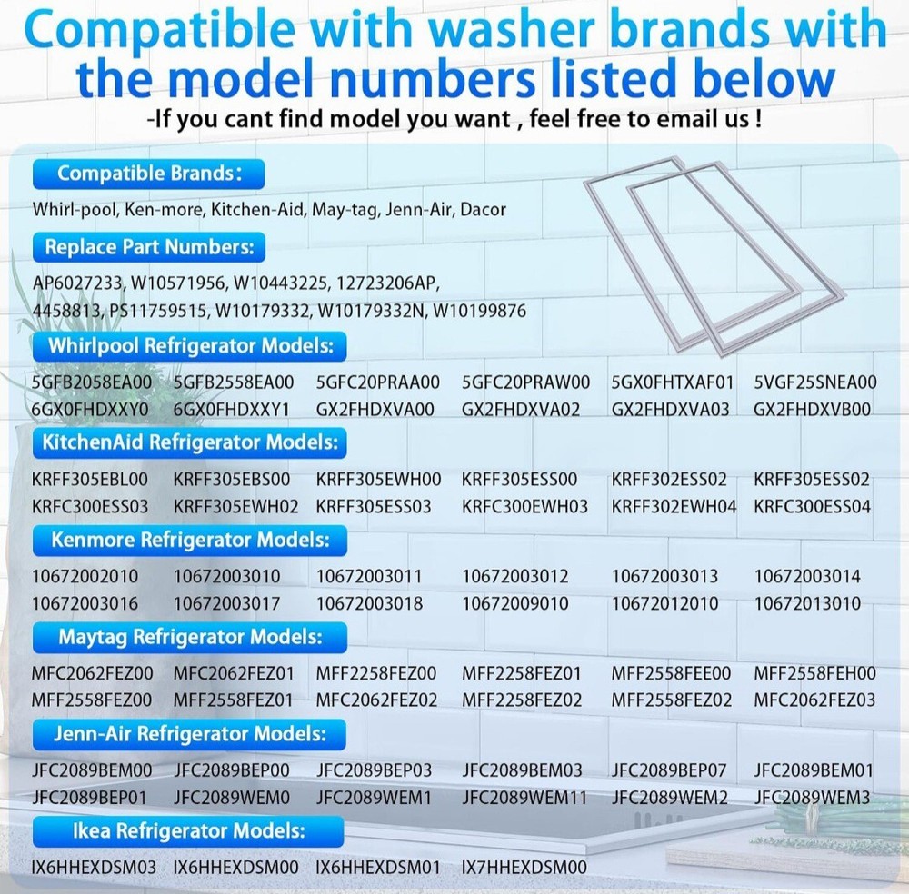UPC:Does not applyModel:Whirlpool Jenn Air Maytag Kenmore Brand:ArlbaSet Includes:Seal/GasketMaterial:EPDMSize:W 16-7/8 (in) * H 39-3/8 (in)gtin13:Does not applyNumber of Items in Set:1Color:GrayPackage Note:You Will Receive 1 PackageType:Refrigerator Door GasketSuitable For:Refrigerator