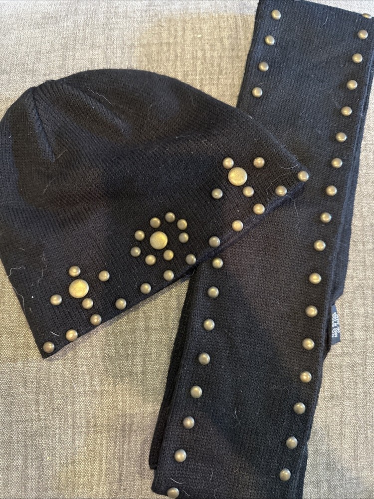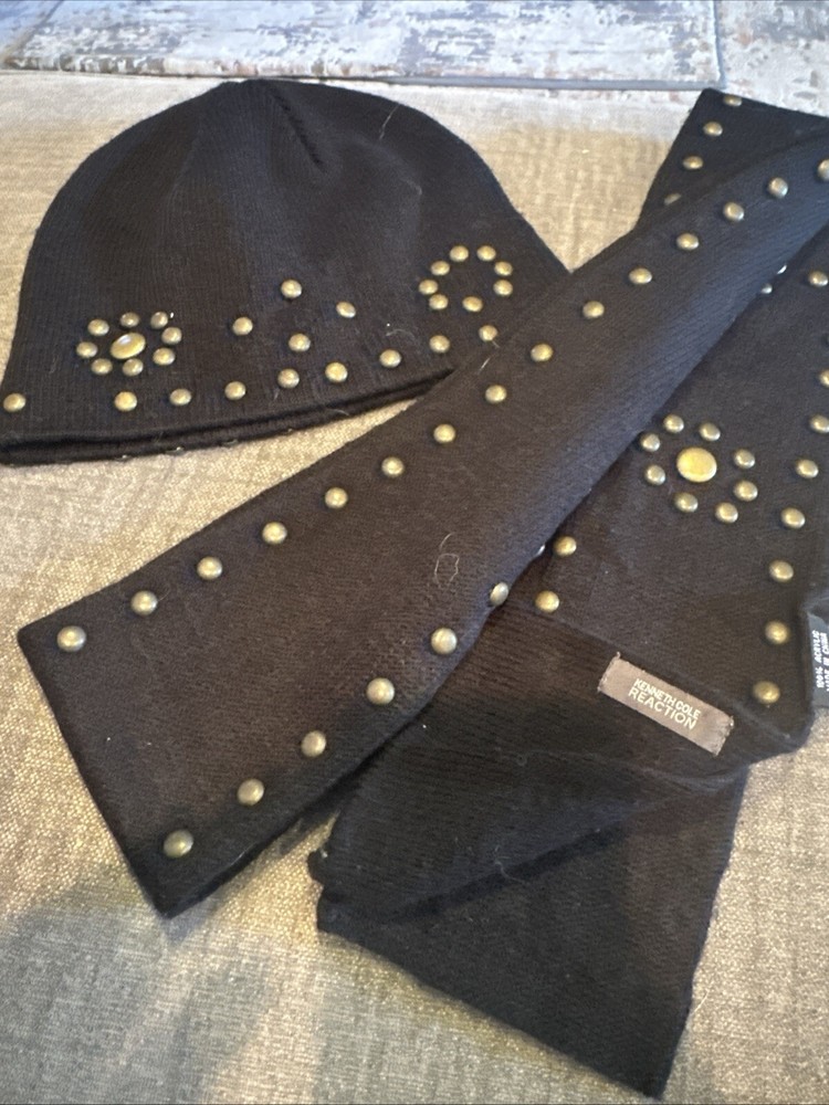 Kenneth Cole Black Studded Beanie and Scarf Set