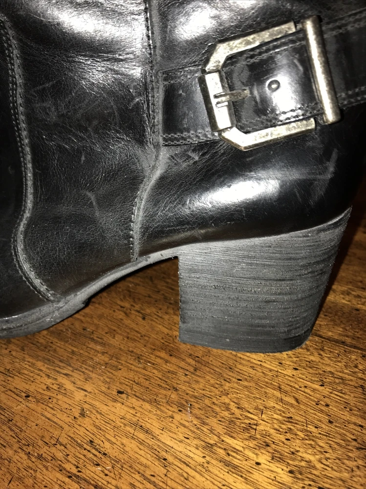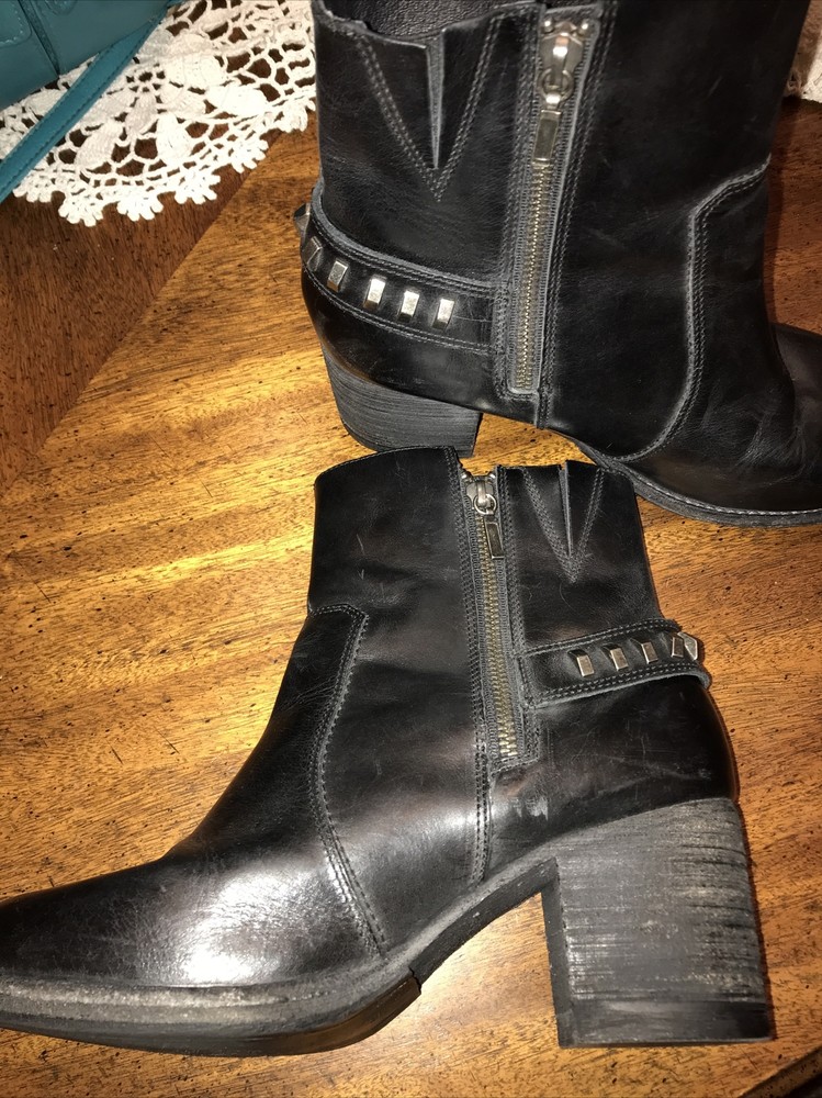 These Kenneth Cole ankle boots are a stylish steal! The black leather looks sleek, and the studded details add just the right edge. Super comfy with a mid heel—perfect for dressing up or rocking a biker vibe. The zip closure makes them easy to slip on, and the grip is great for all-day wear. Even preowned, they’re in fantastic shape—total win for a versatile boot!