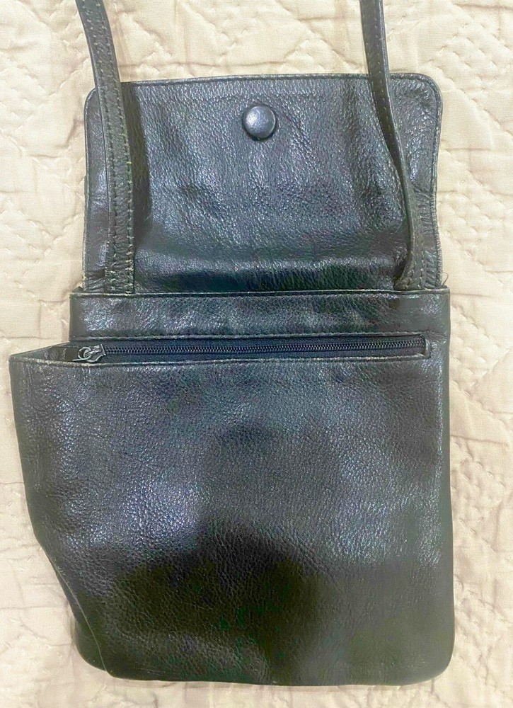 This Kenneth Cole New York crossbody purse bag is a stylish and functional accessory for any woman. The bag is made of black leather and features a rectangular shape with a snap closure. It has a small size, measuring 6 inches in width and 7 inches in height, and is designed to be carried as a crossbody with a 28-inch strap drop. The bag's interior is lined with black fabric and has enough space to hold all your essentials. The crossbody strap is made of leather and matches the bag's exterior color. This purse is perfect for any occasion and is a must-have for any fashion-conscious woman. Pet free smoke free home.