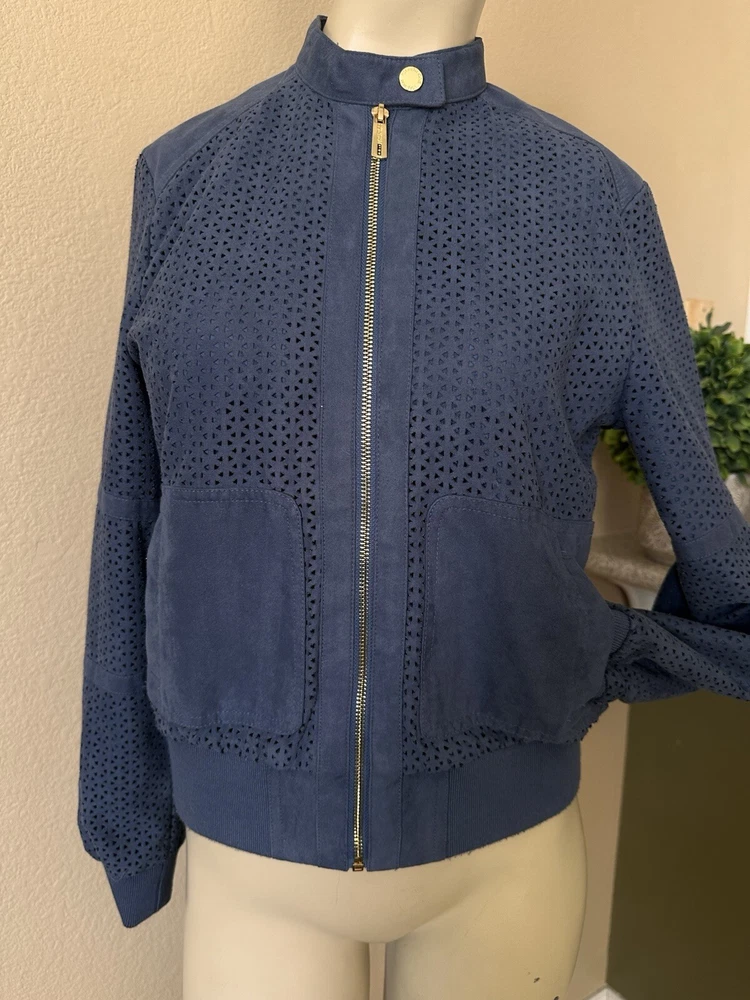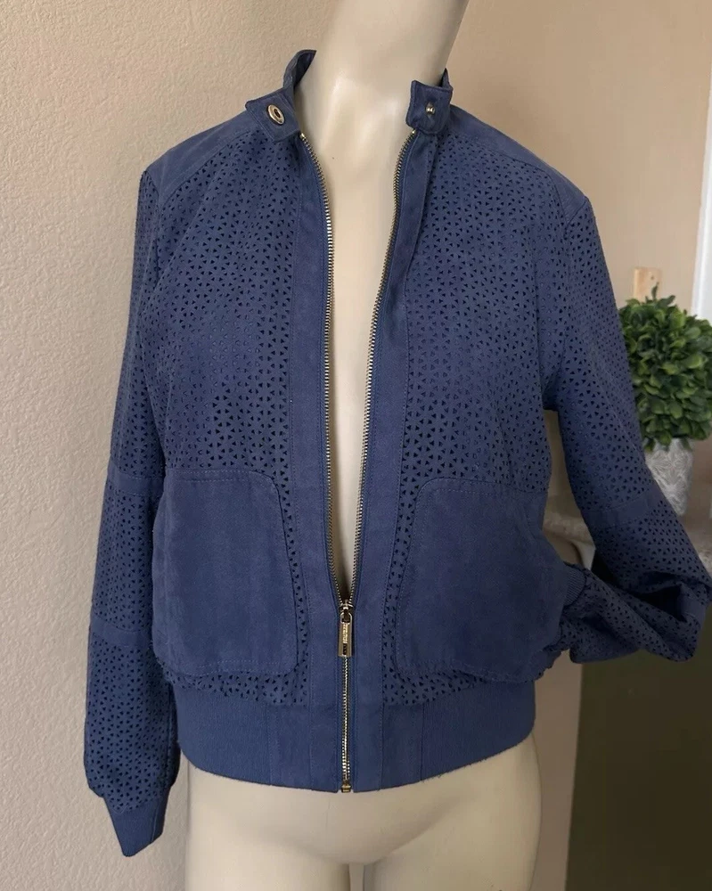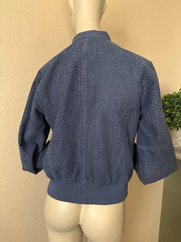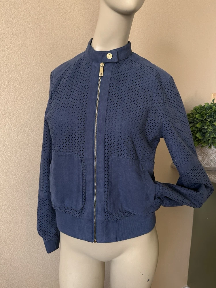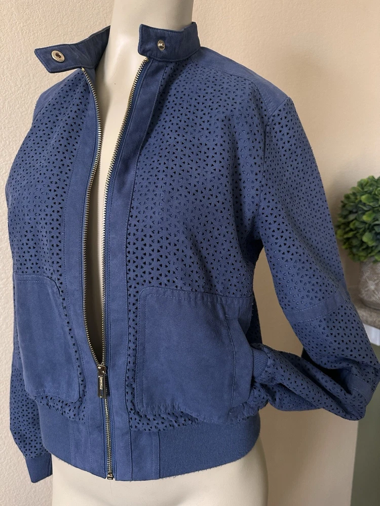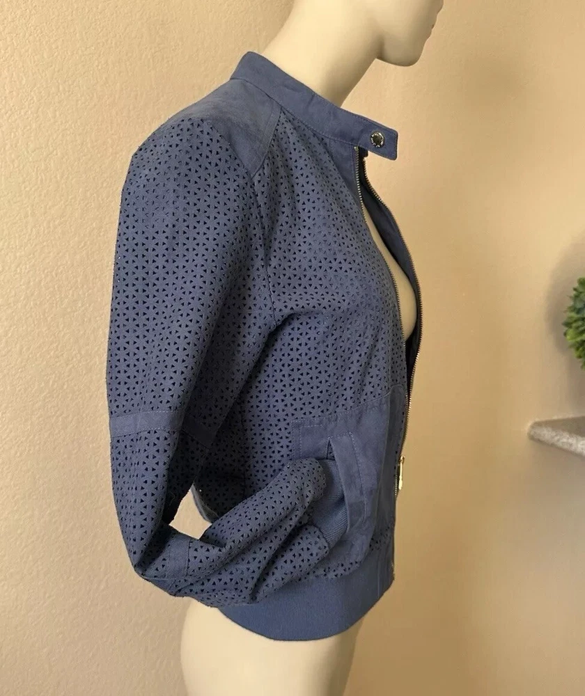 This Kenneth Cole Reaction Bomber Jacket for women features a stylish design with cut out details all over, a full zip closure, and a mock neck. Made of polyester knit fabric, this jacket has a solid blue color with a short length and long sleeves. It has pockets for added functionality and is suitable for all seasons. This classic designer piece is versatile, offering a modern and chic look for any occasion. SMOKE FREE HOME CROSS LISTED