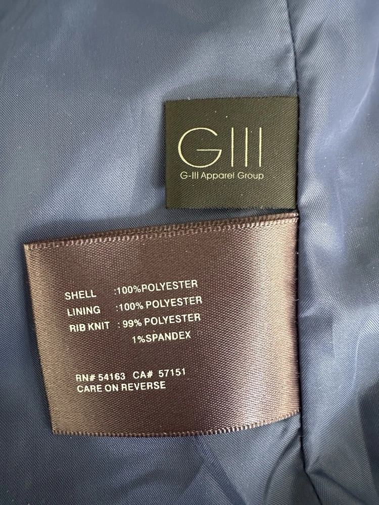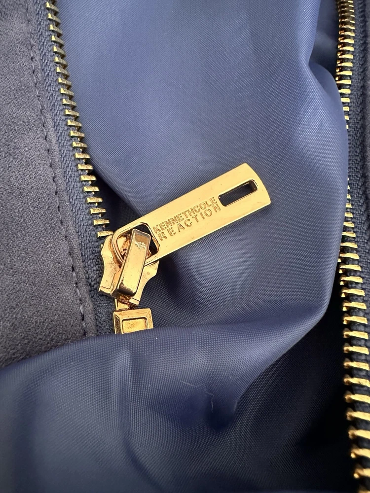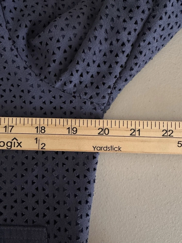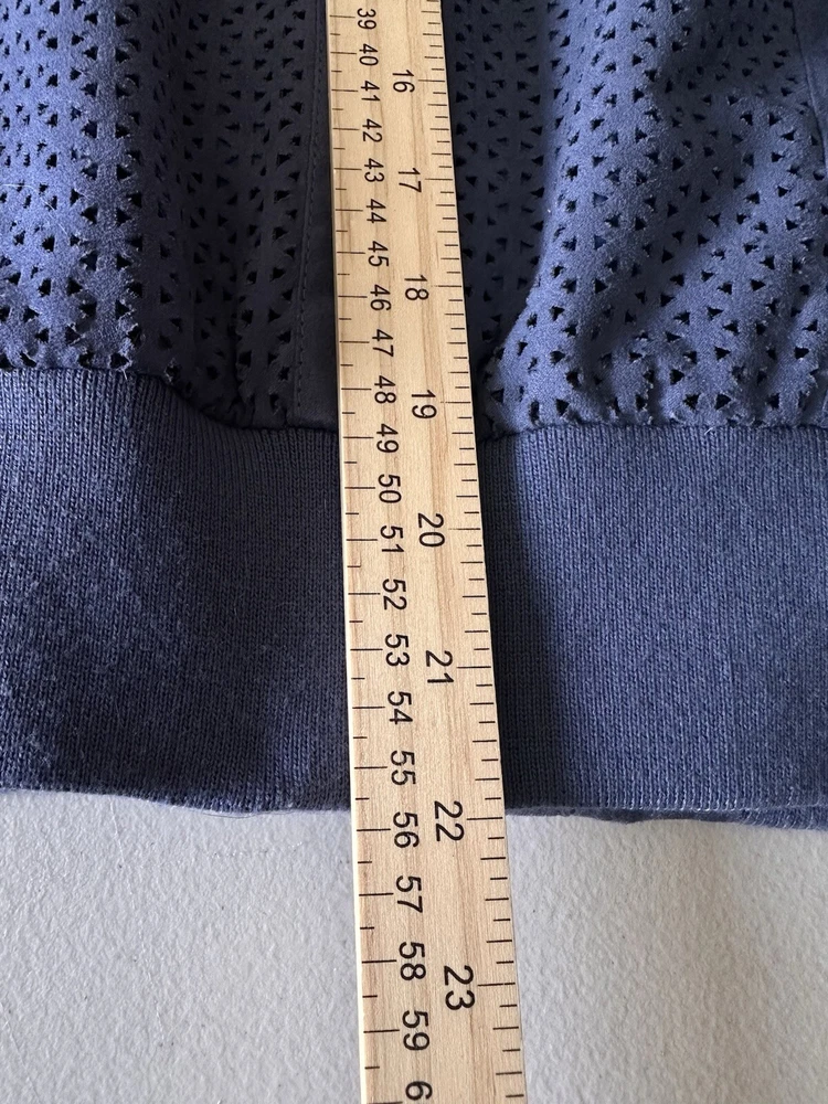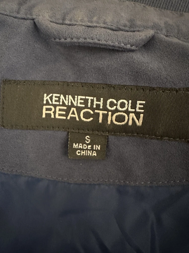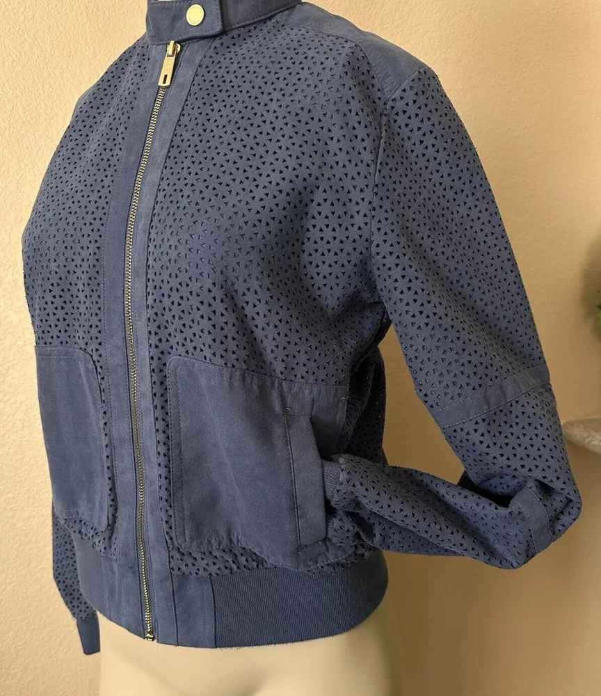 This Kenneth Cole Reaction Bomber Jacket for women features a stylish design with cut out details all over, a full zip closure, and a mock neck. Made of polyester knit fabric, this jacket has a solid blue color with a short length and long sleeves. It has pockets for added functionality and is suitable for all seasons. This classic designer piece is versatile, offering a modern and chic look for any occasion. SMOKE FREE HOME CROSS LISTED
