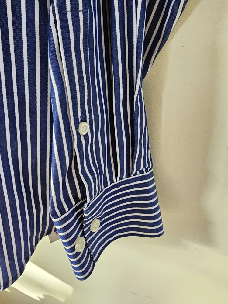 This is a men's dress shirt from Kenneth Cole Reaction in size Large. It features blue and white stripes, a collared neckline with a button-down style, and long sleeves with button closures. The shirt is made of 100% cotton and has a regular fit. The model is classic and the shirt was made in Bangladesh.