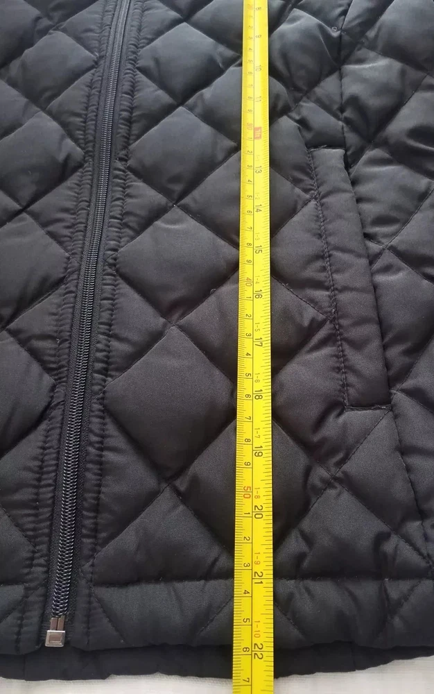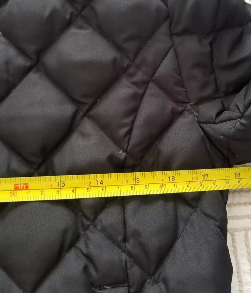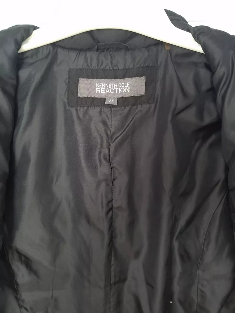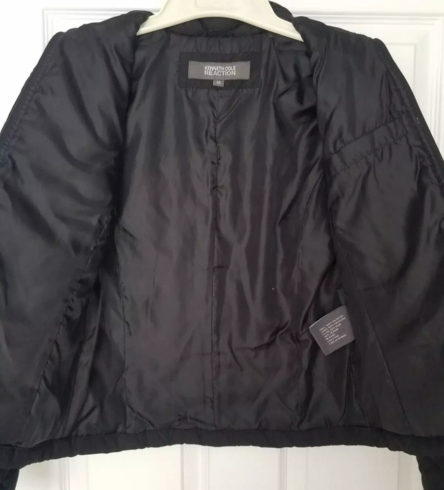 The Kenneth Cole Reaction Down Fill Full Zip Quilted Black Puffer Jacket in size XS is a stylish and practical outerwear option for women. Made with polyester outer shell material and lined with polyester, this jacket is designed to be breathable, water-resistant, and wind-resistant, making it ideal for winter, fall, and spring seasons. The full zip closure, zipped pockets, and down insulation provide added warmth and comfort, while the classic black color and quilted accents add a touch of designer flair to the jacket's short length design. Perfect for travel, casual wear, or even workwear, this puffer jacket combines functionality with a fashionable vibe.