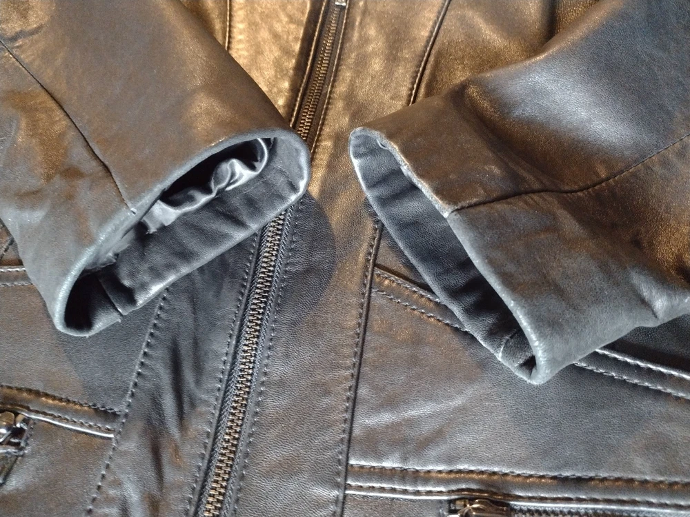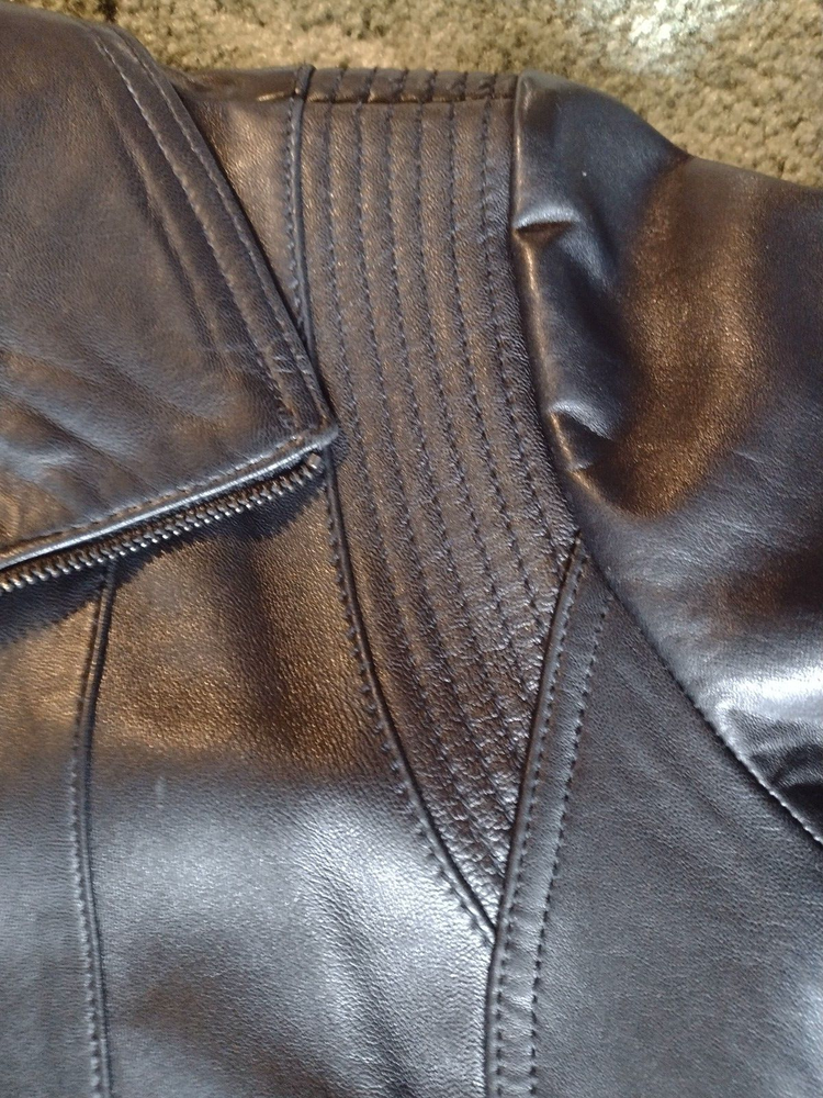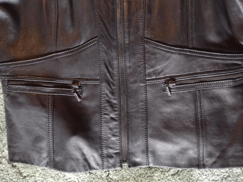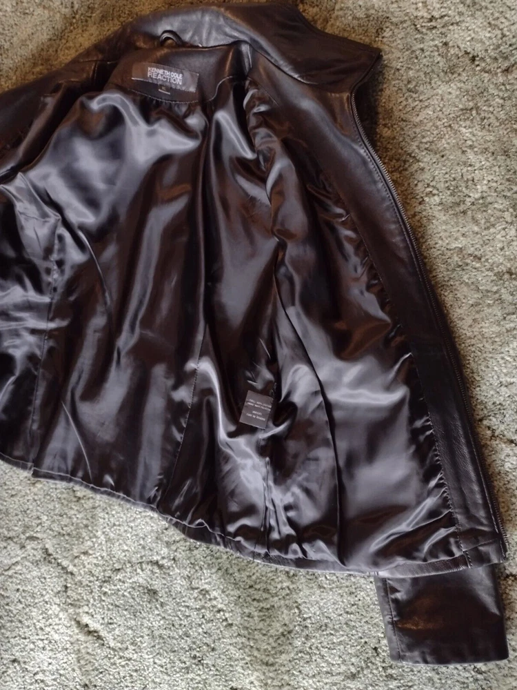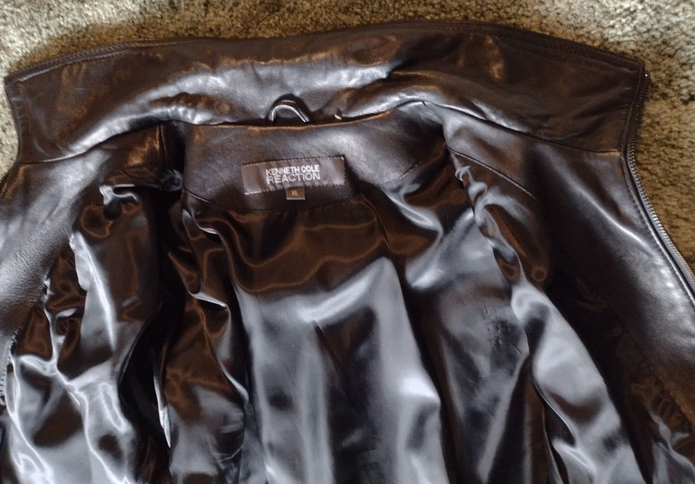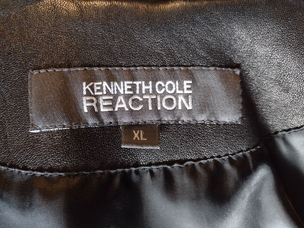 Kenneth Cole Reaction Full Zip Black Leather Jacket Coat, Lined, Size XL READ: Outer leather shell and lining are in very good condition, except for a small scuff on jacket back shown in last photo. Leather is soft and supple. Jacket has stitching details. Two zip pockets on front of jacket. Outside measurement Pit to pit: 20.5" Length from back of collar seam: 22.5" Sleeve length from shoulder seam: 25"